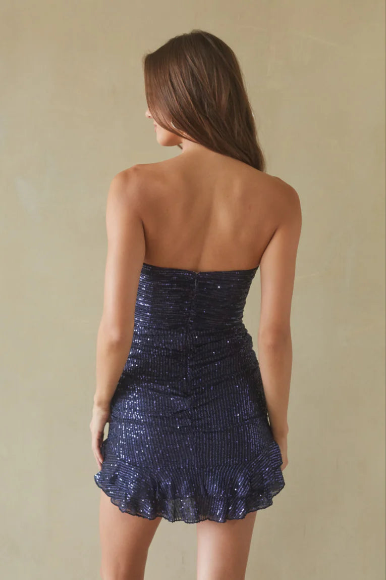 Dare to dazzle in the all new Alora Strapless Sequin Mini Dress! This sequin mini dress is perfect for homecoming and winter formal! Features a flattering ruched bodycon fit, sequin shimmer finish, and tiered ruffle hem; this trending mini dress is available in elegant blue! Polish off the look with a pair of chic heels!