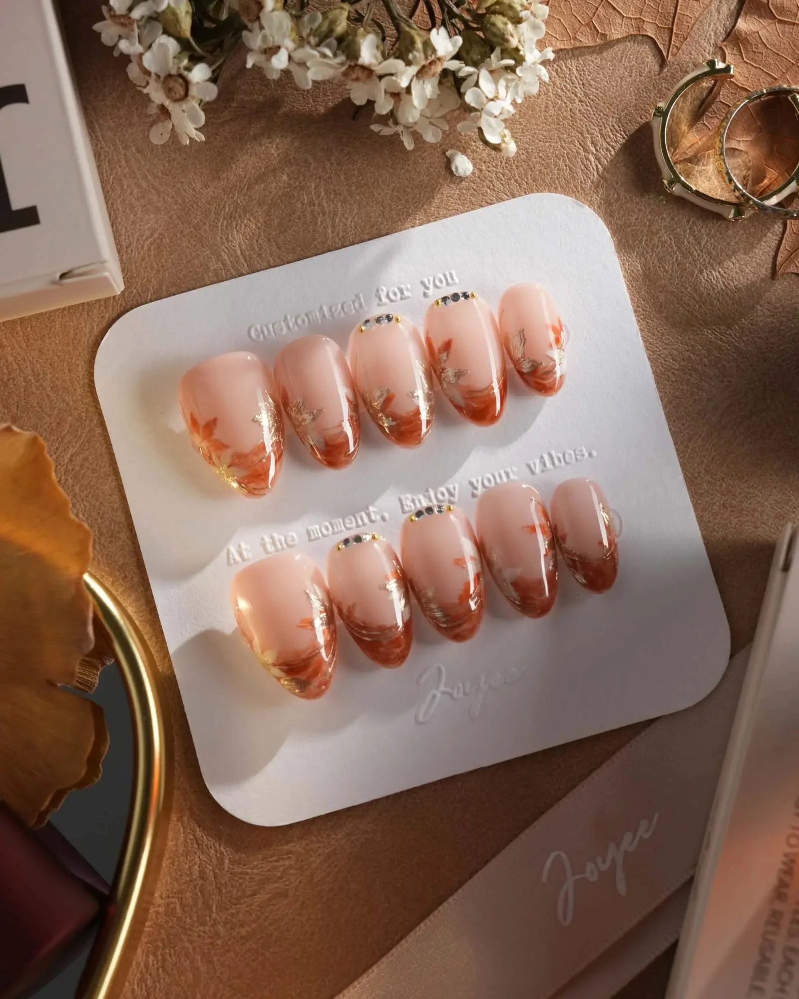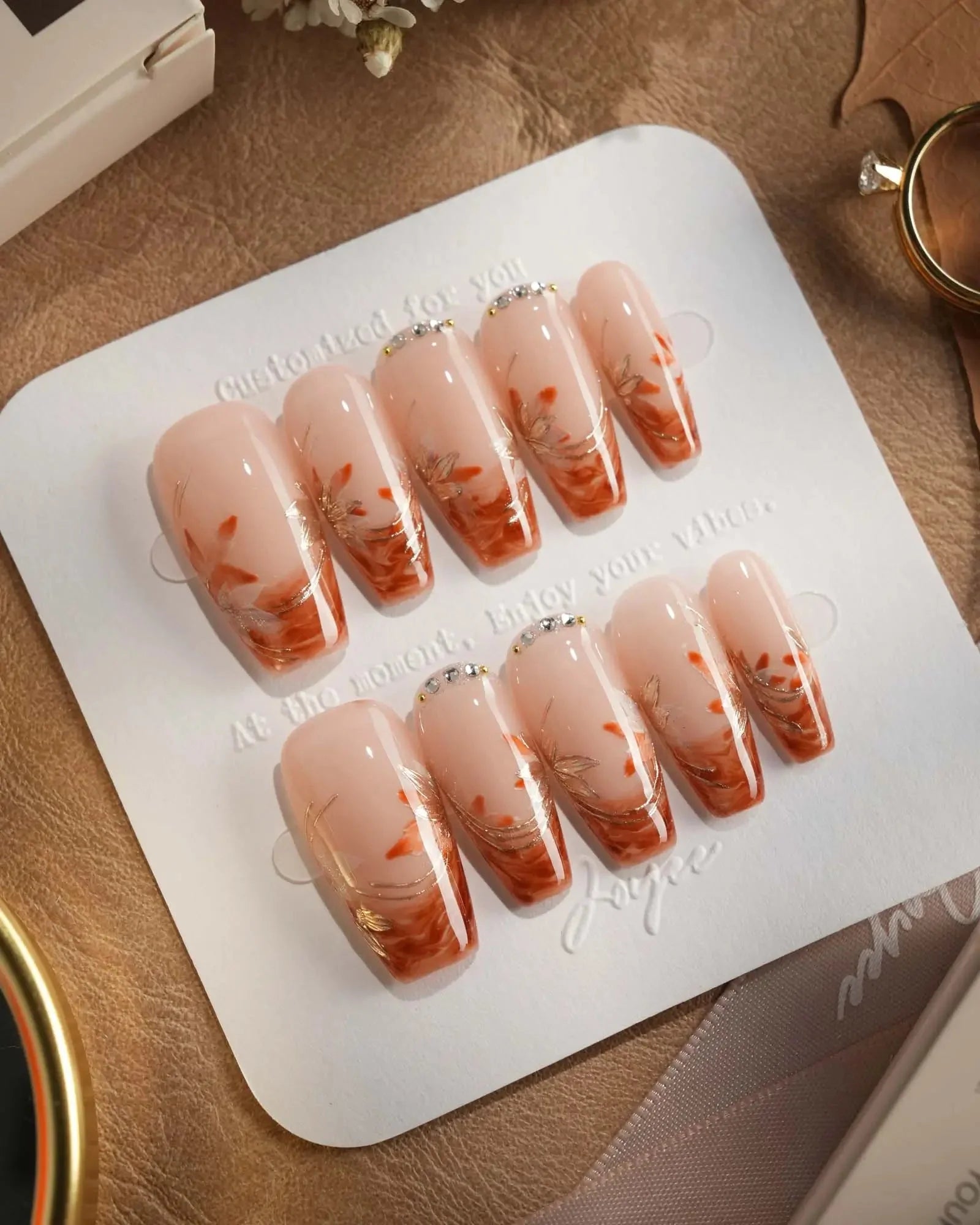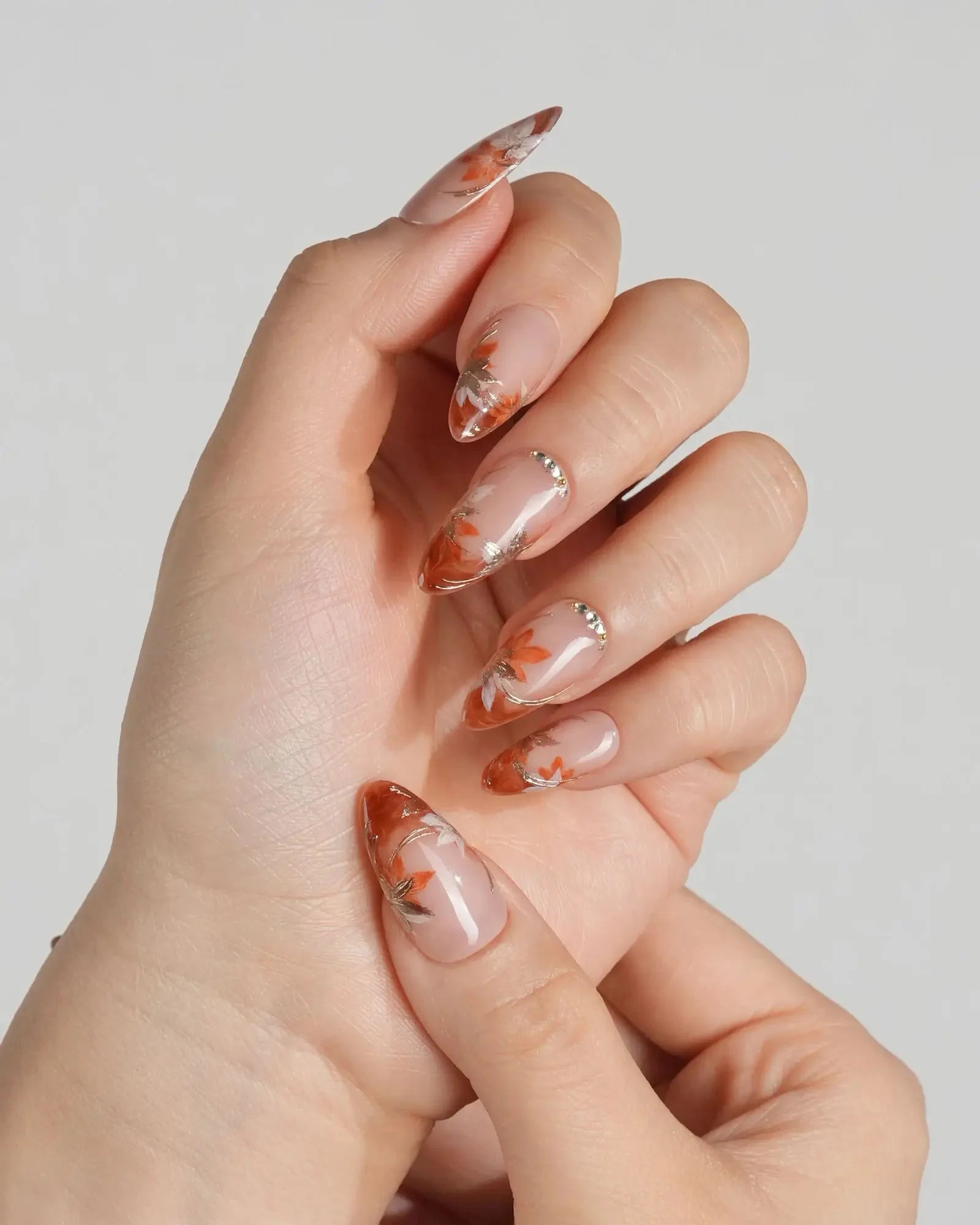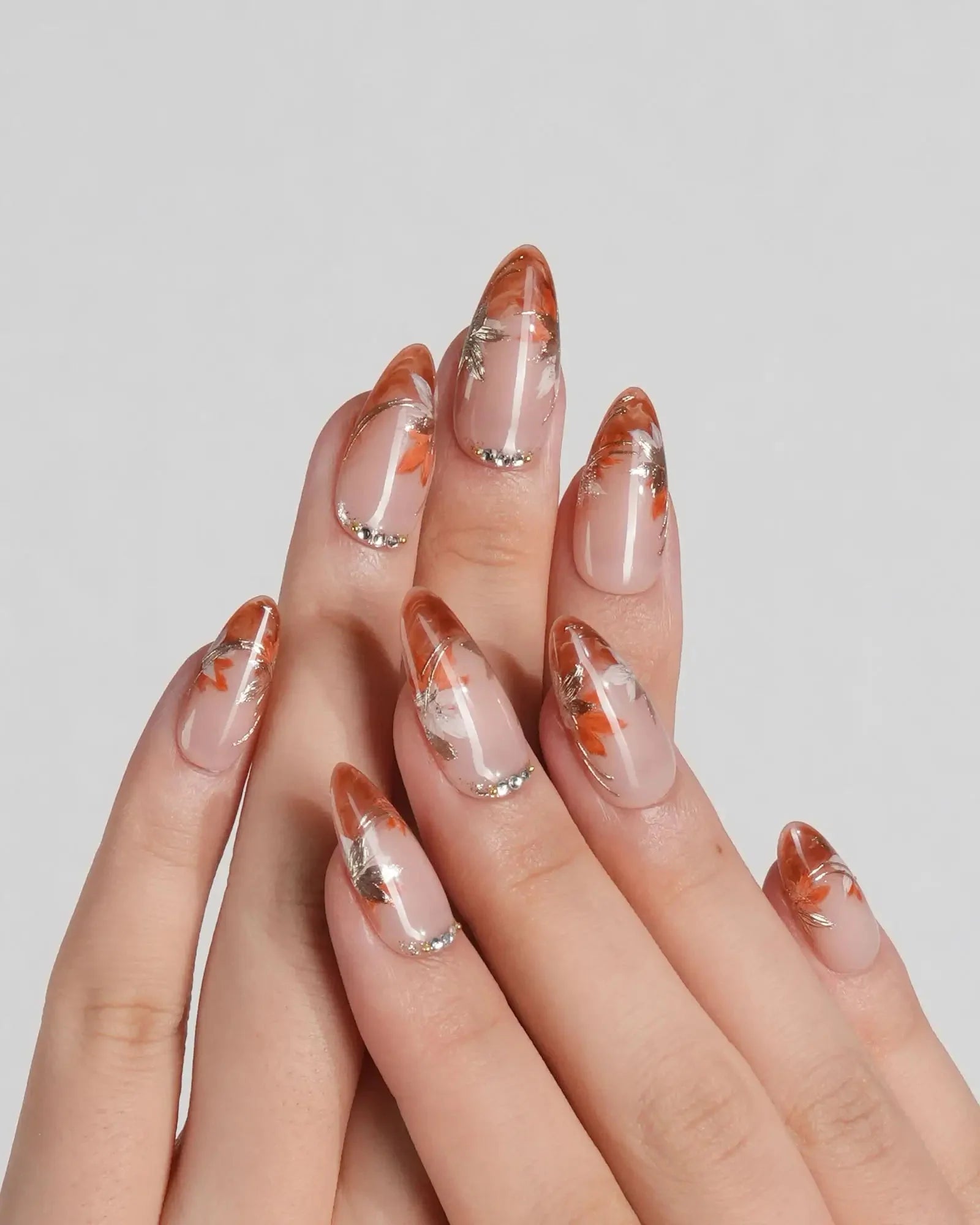 Layers of amber tones and chrome-touched leaves—elegant yet modern. Perfect with a camel trench, leather tote, and gold jewelry for a walk through falling leaves.