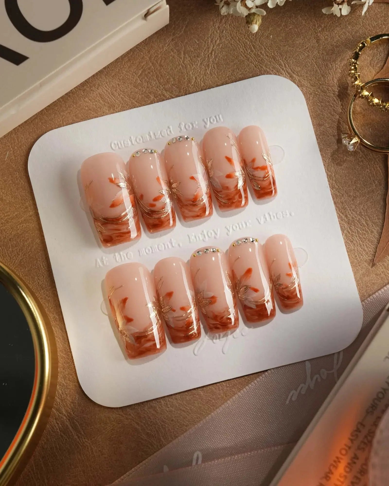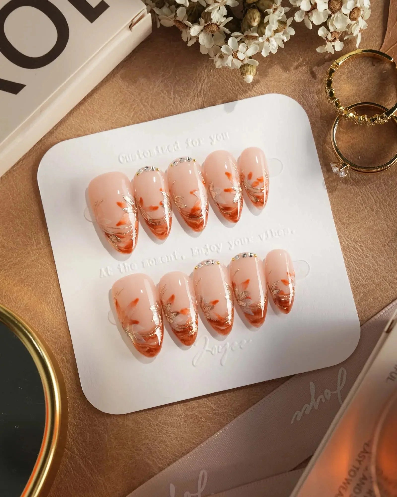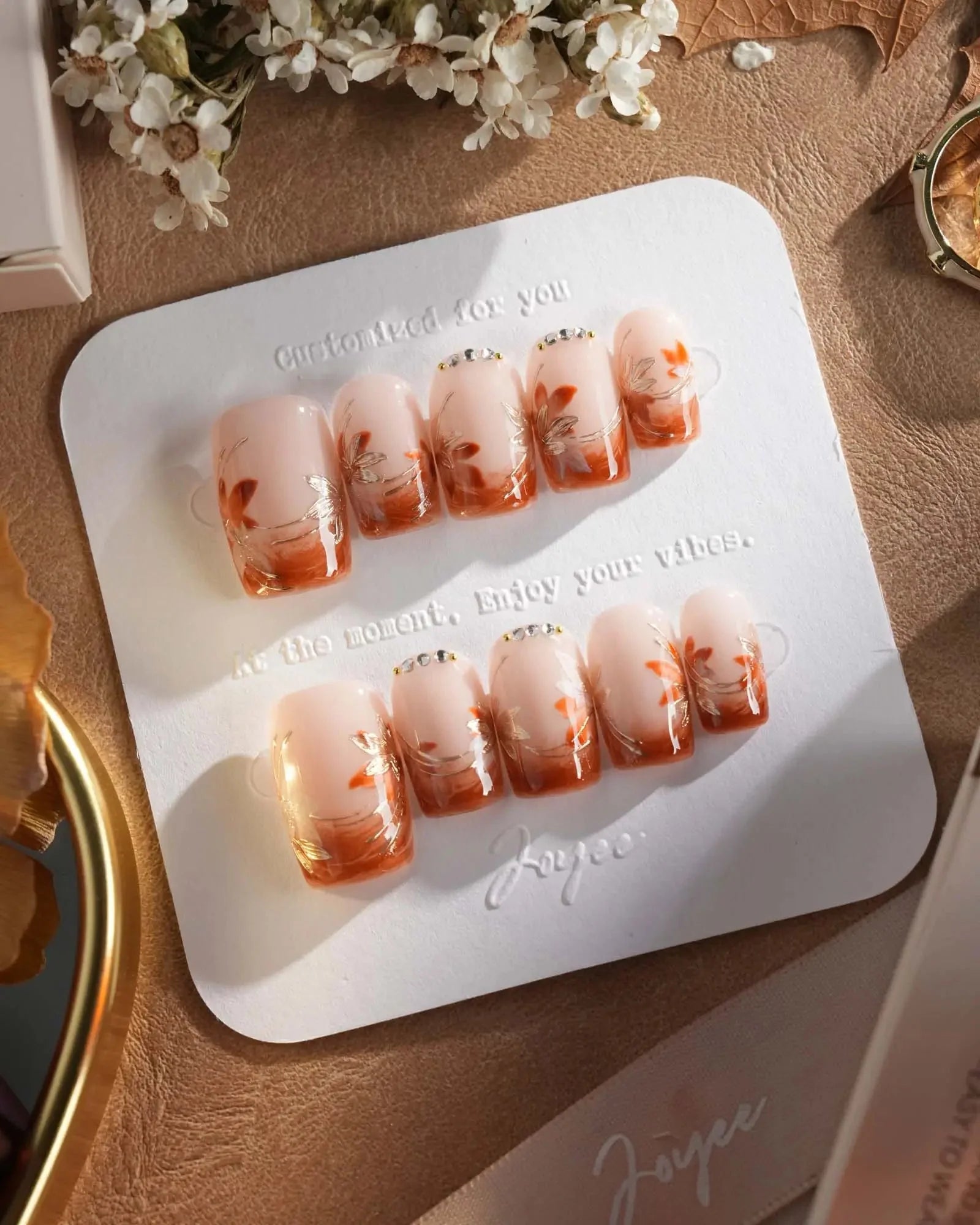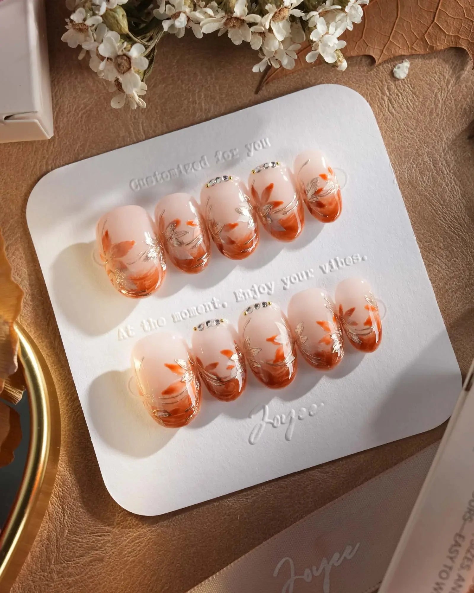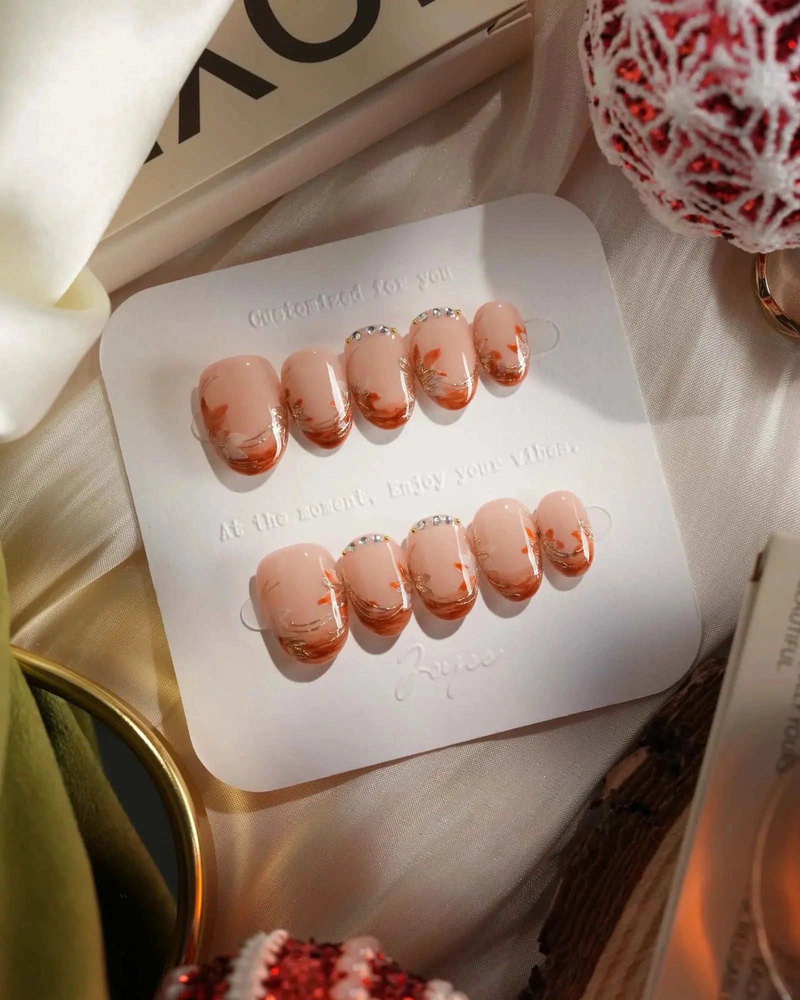 Layers of amber tones and chrome-touched leaves—elegant yet modern. Perfect with a camel trench, leather tote, and gold jewelry for a walk through falling leaves.