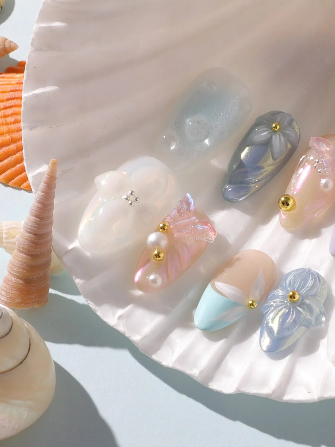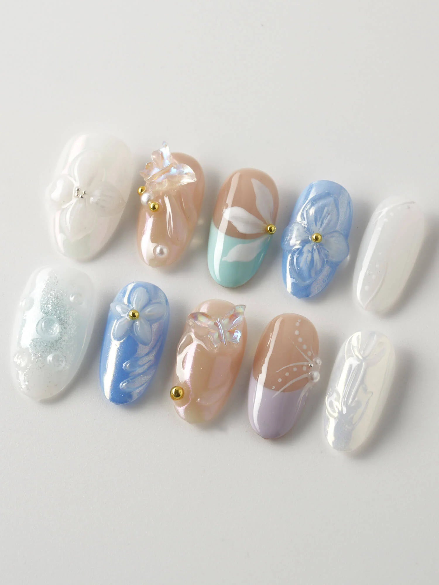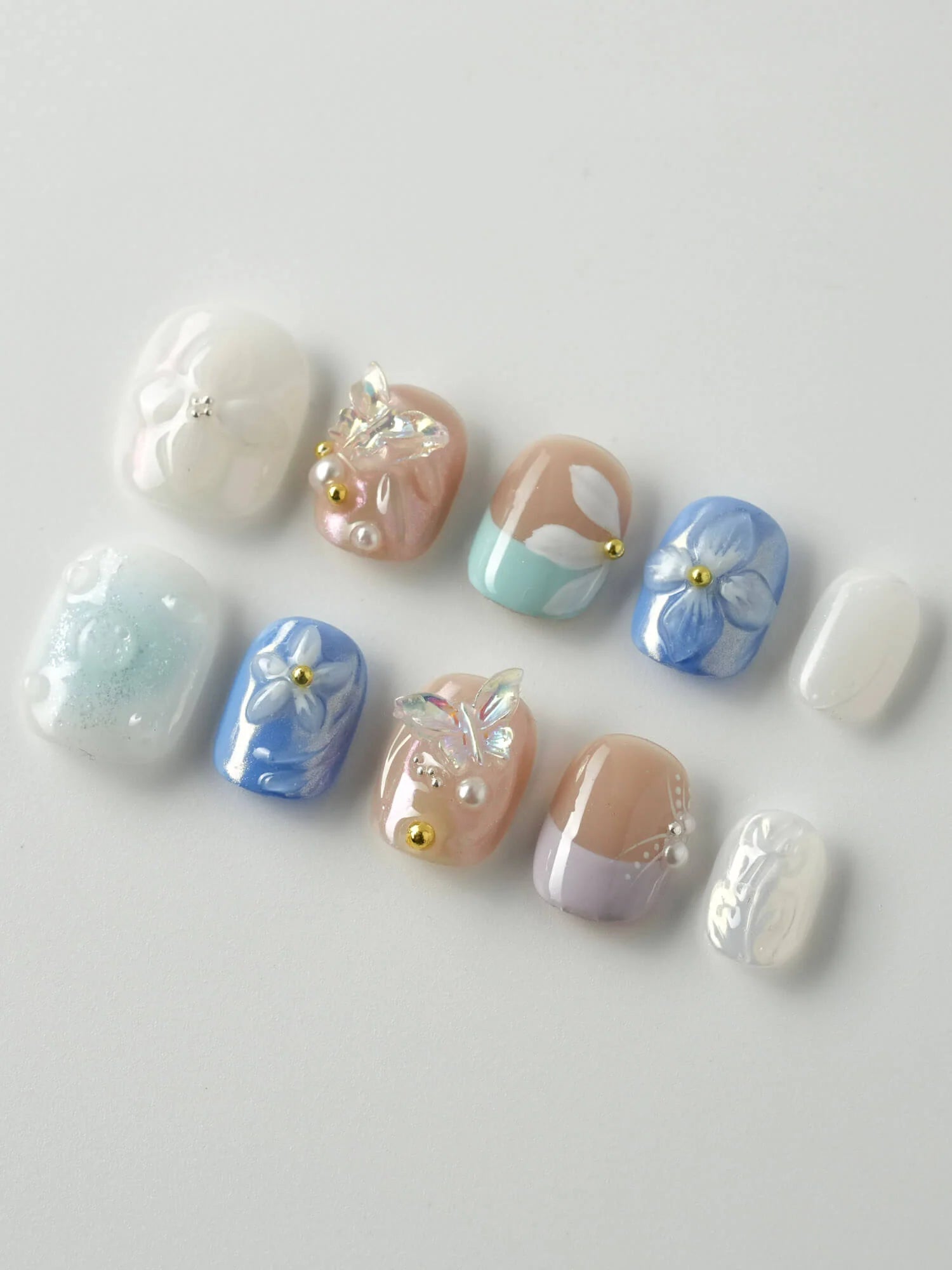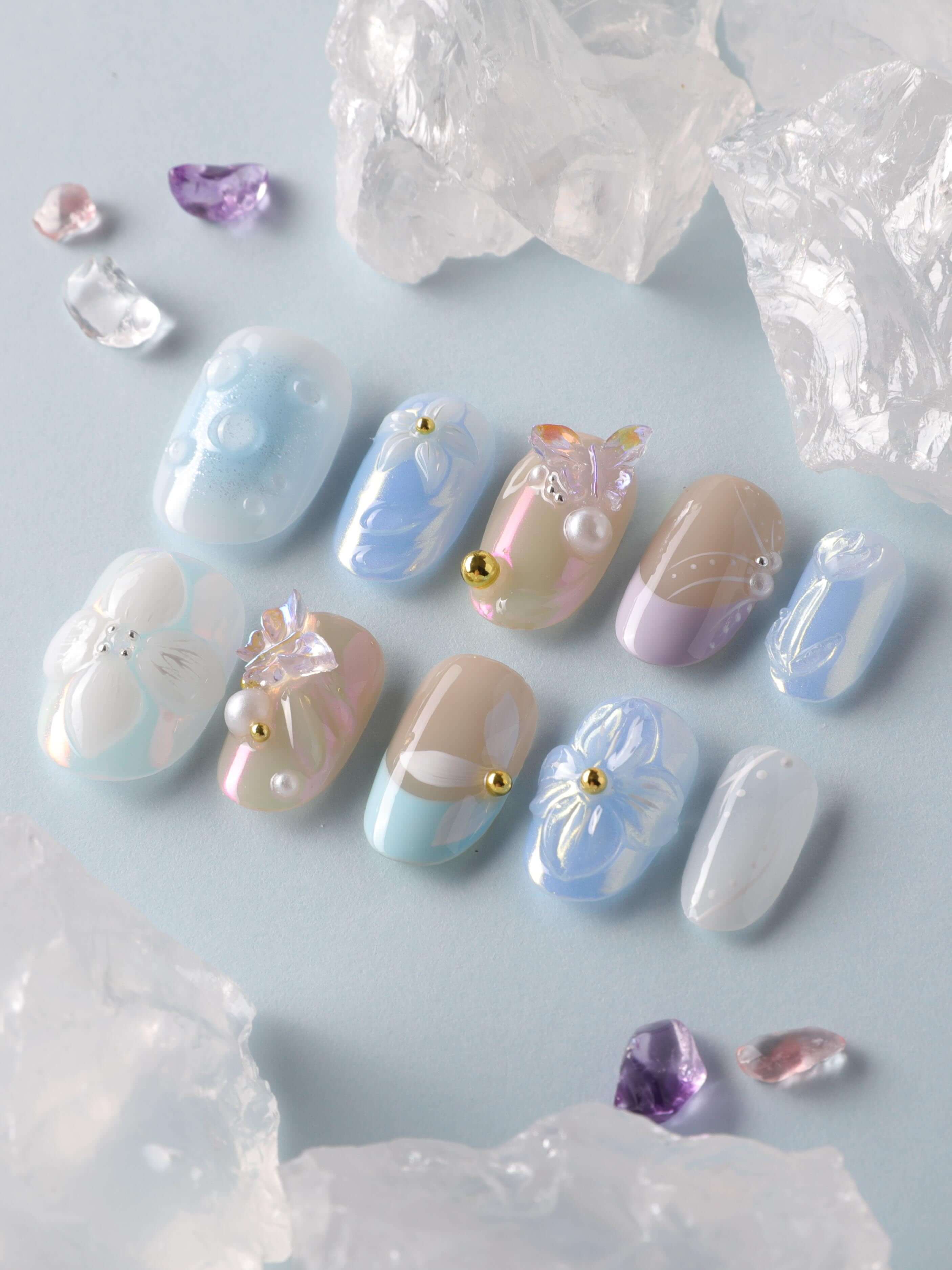 Refresh your senses with "Aqua Petal". Cool waves of light blue embrace delicate petals, crafting a serene oasis on your fingertips.