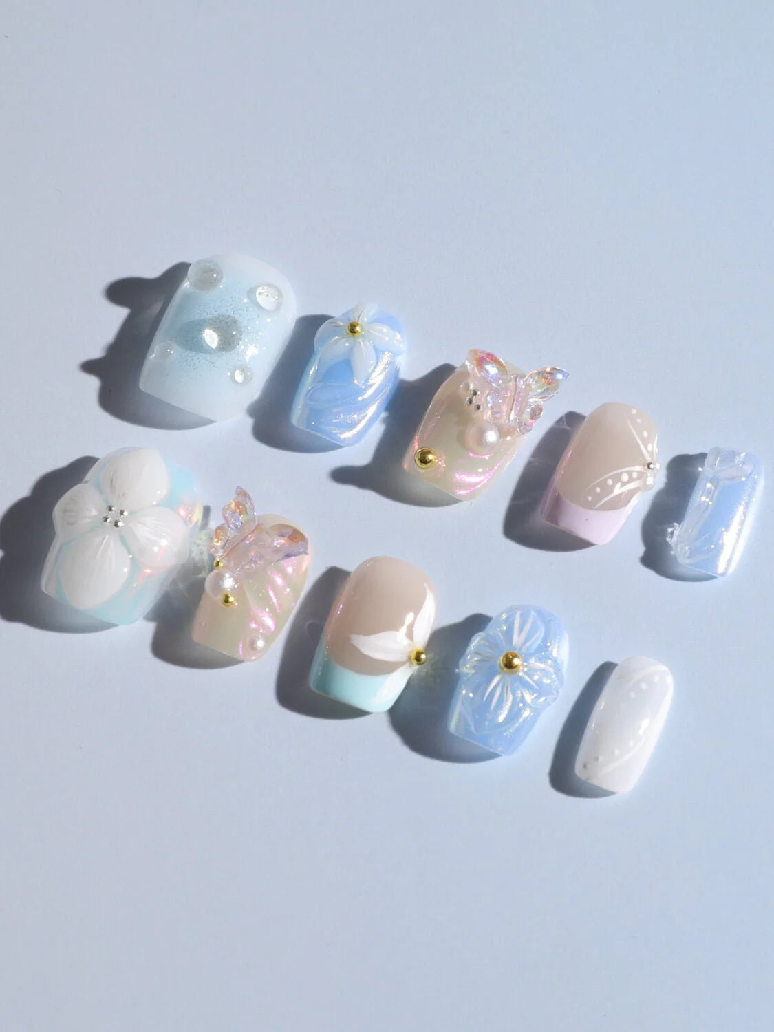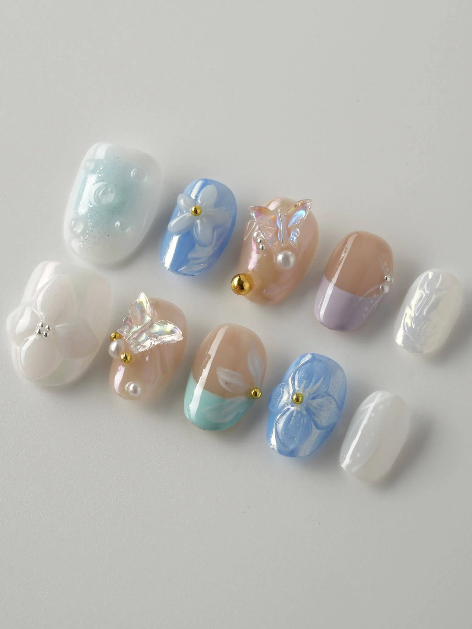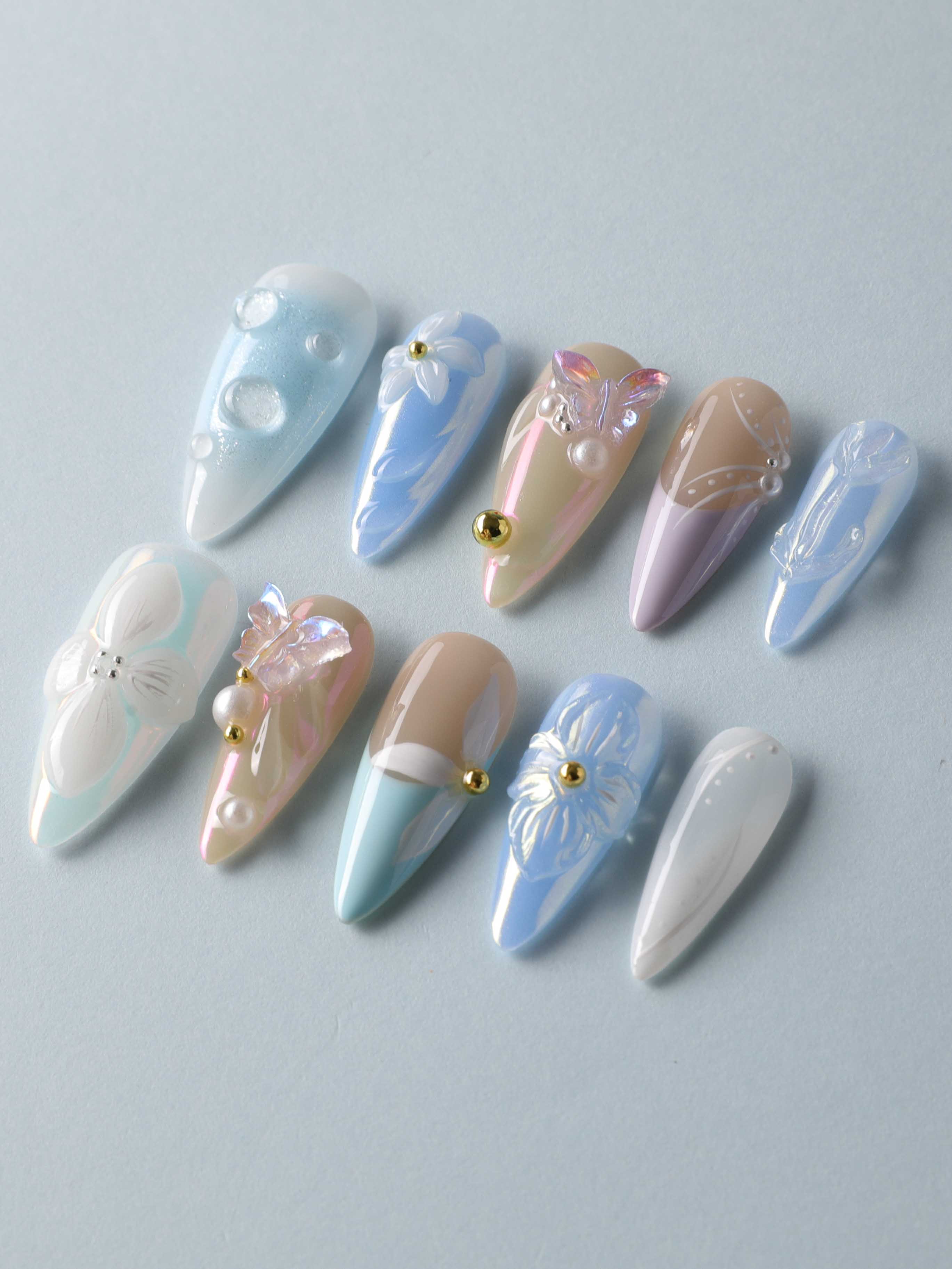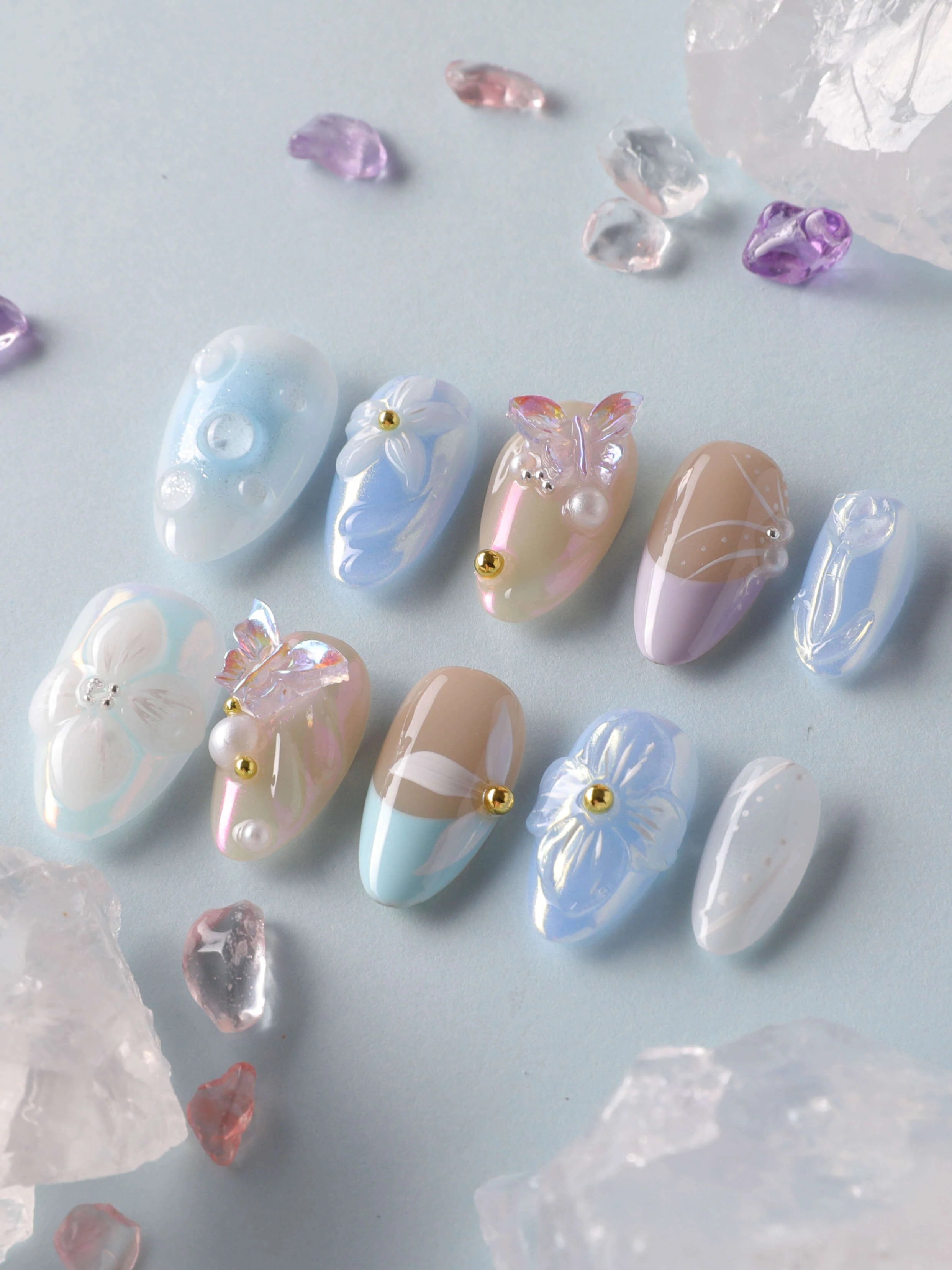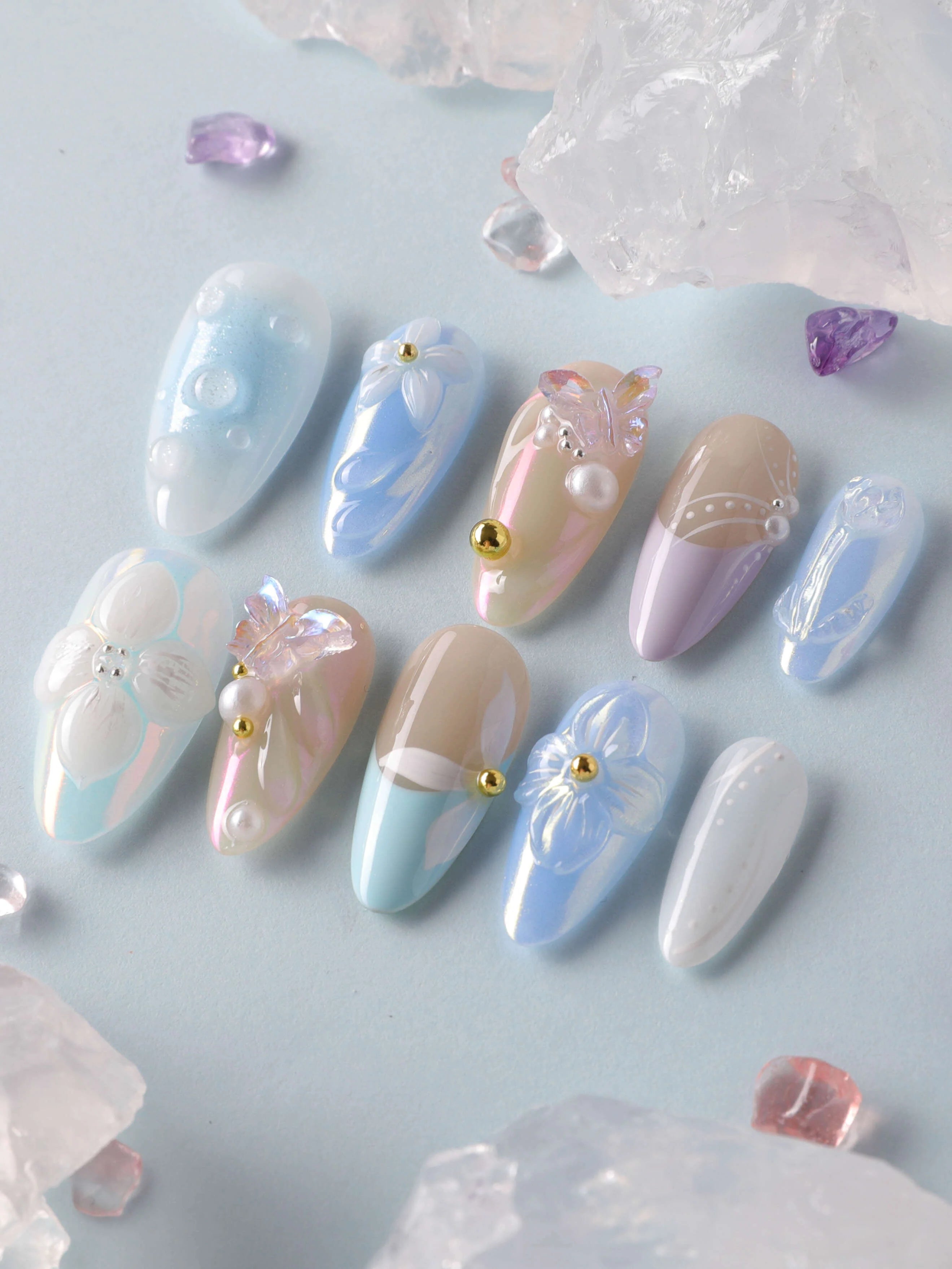 Refresh your senses with "Aqua Petal". Cool waves of light blue embrace delicate petals, crafting a serene oasis on your fingertips.