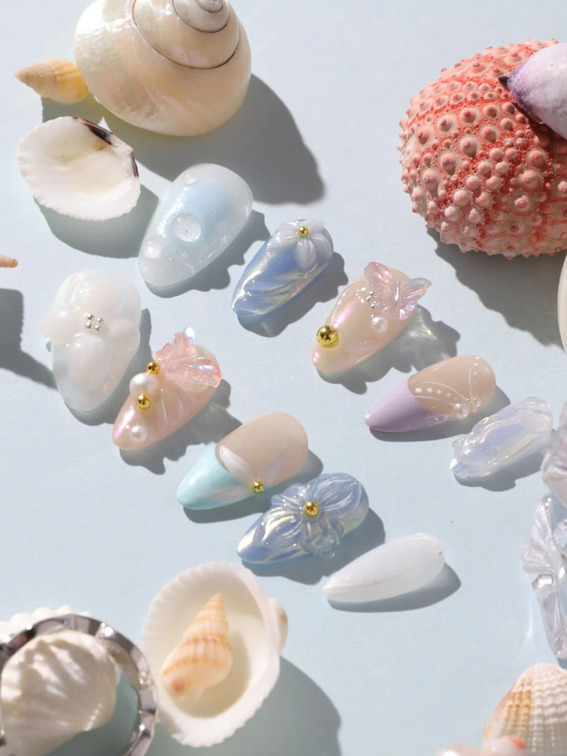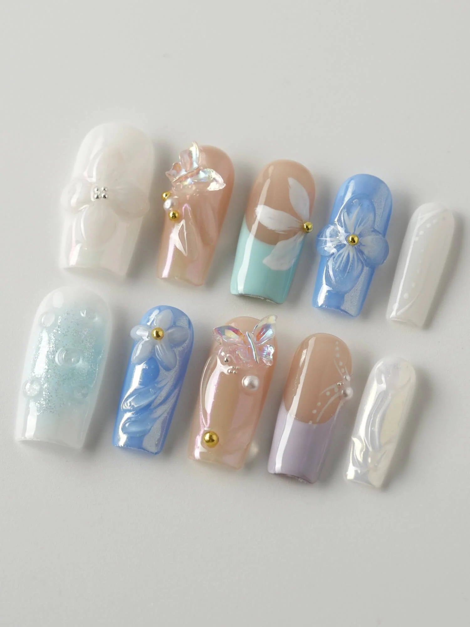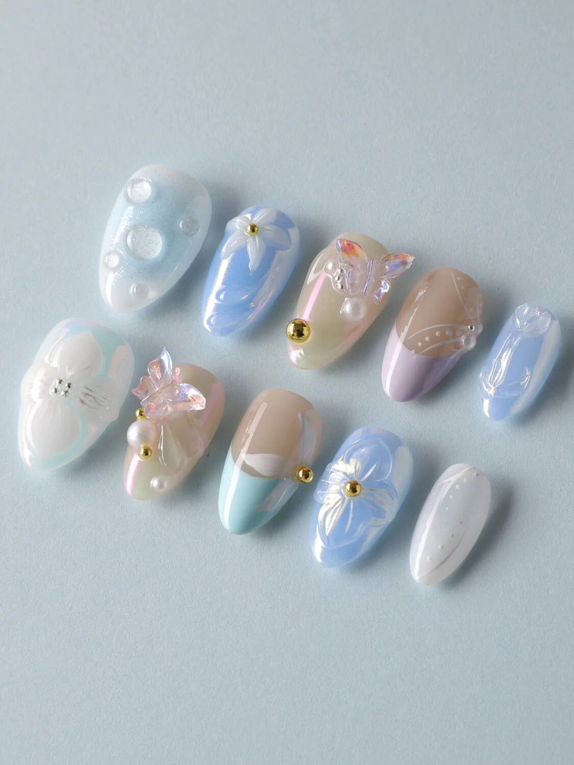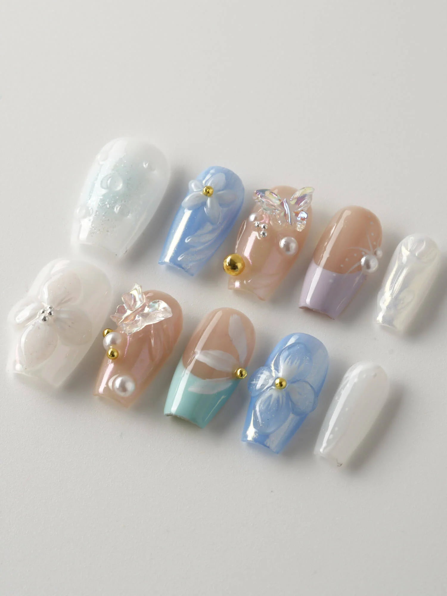 Refresh your senses with "Aqua Petal". Cool waves of light blue embrace delicate petals, crafting a serene oasis on your fingertips.