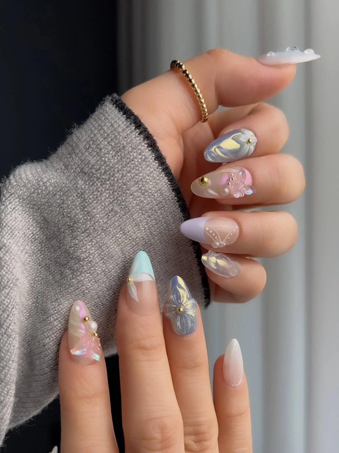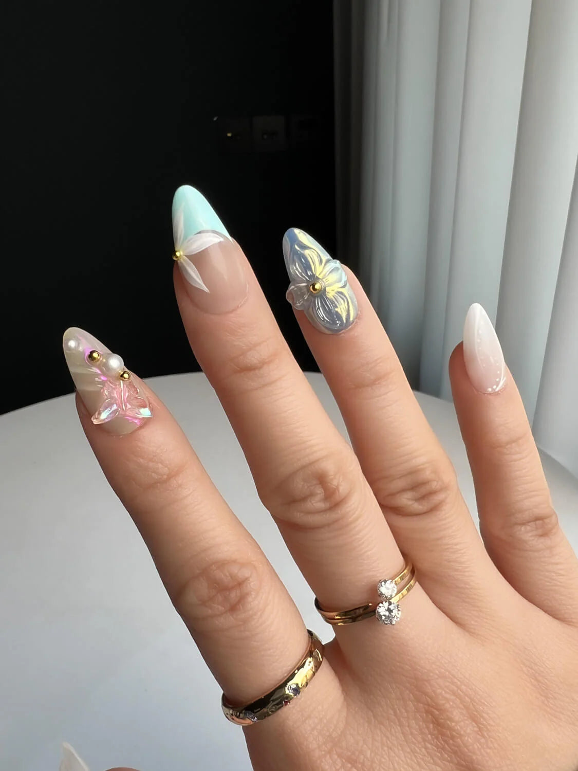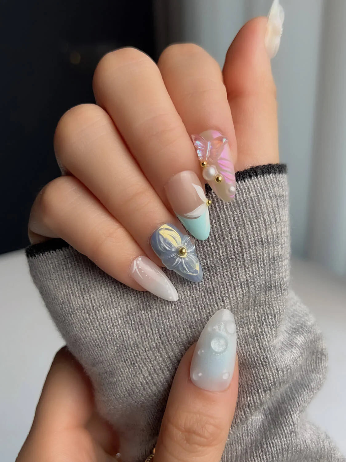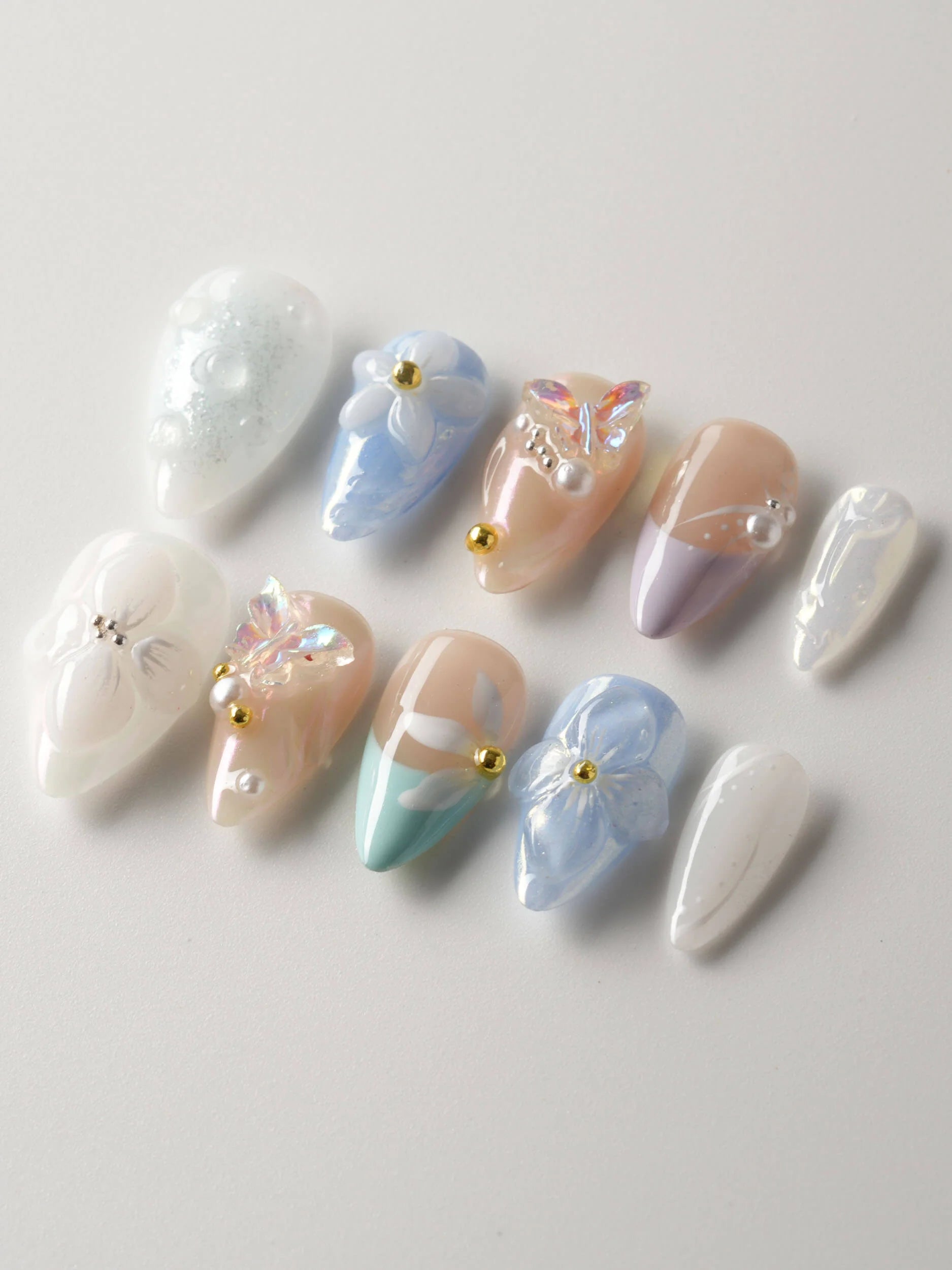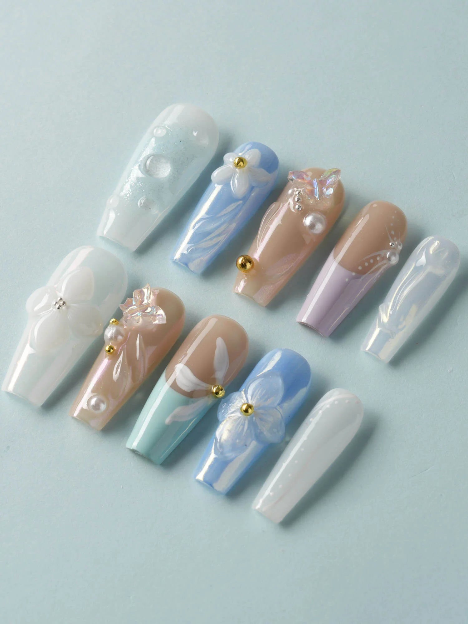 Refresh your senses with "Aqua Petal". Cool waves of light blue embrace delicate petals, crafting a serene oasis on your fingertips.