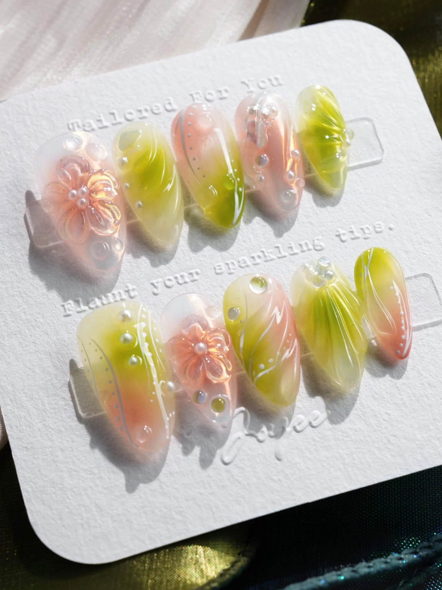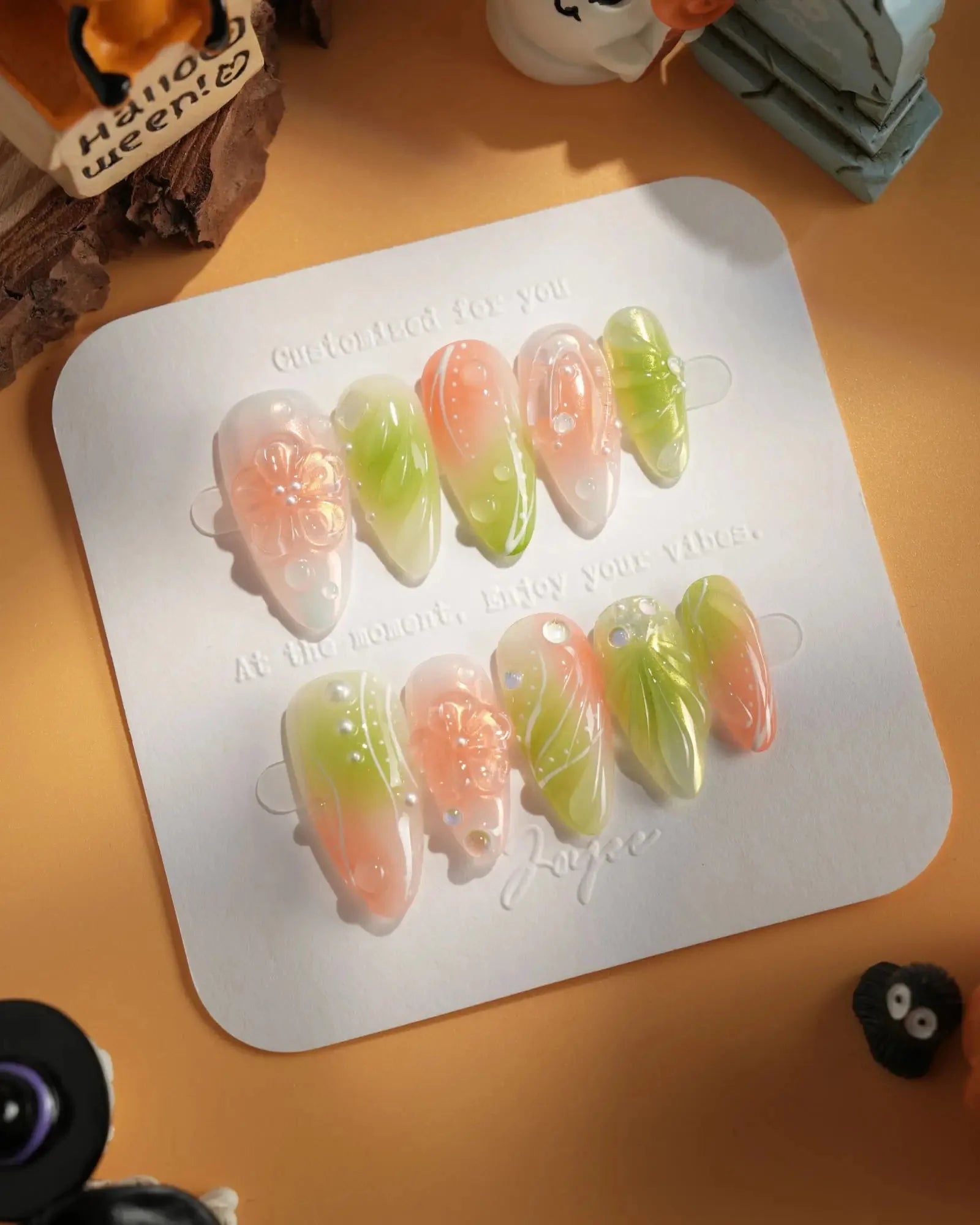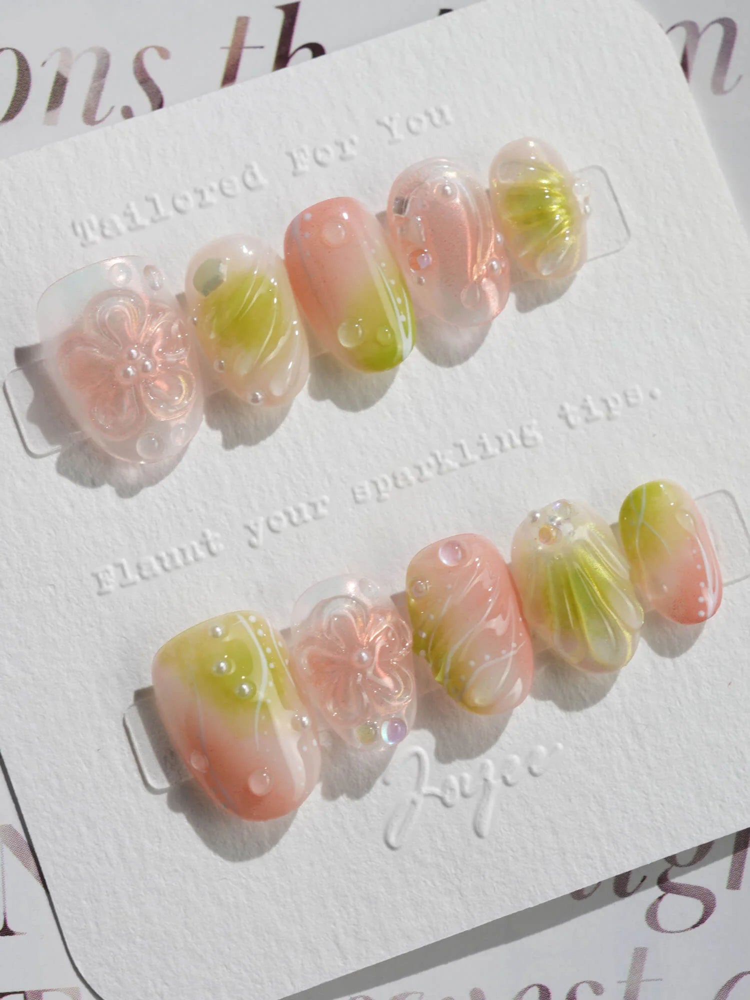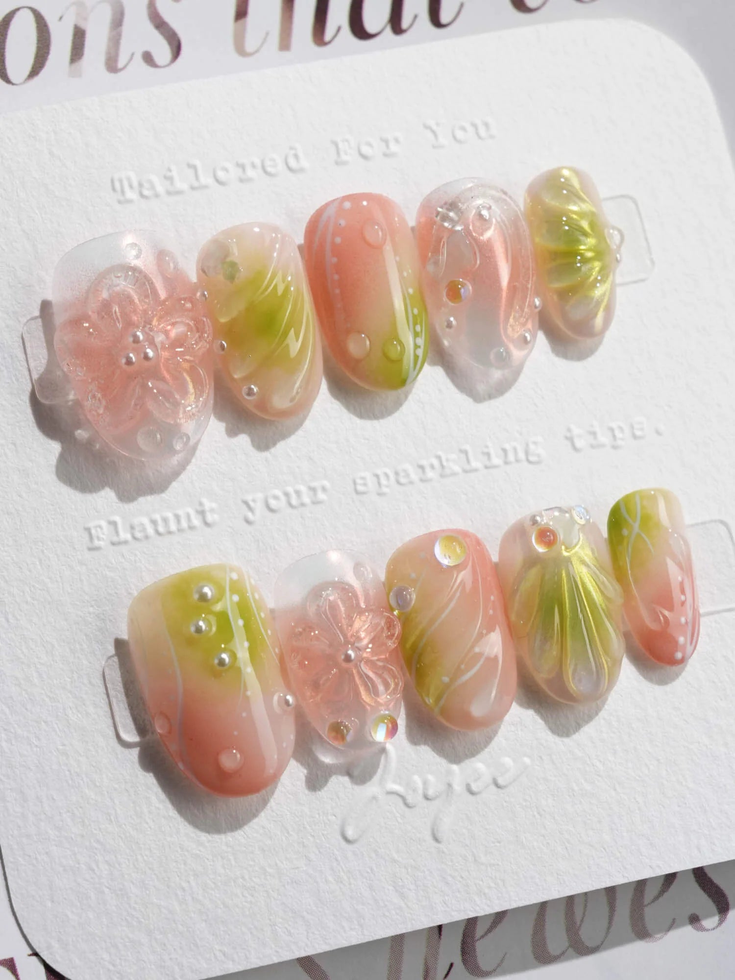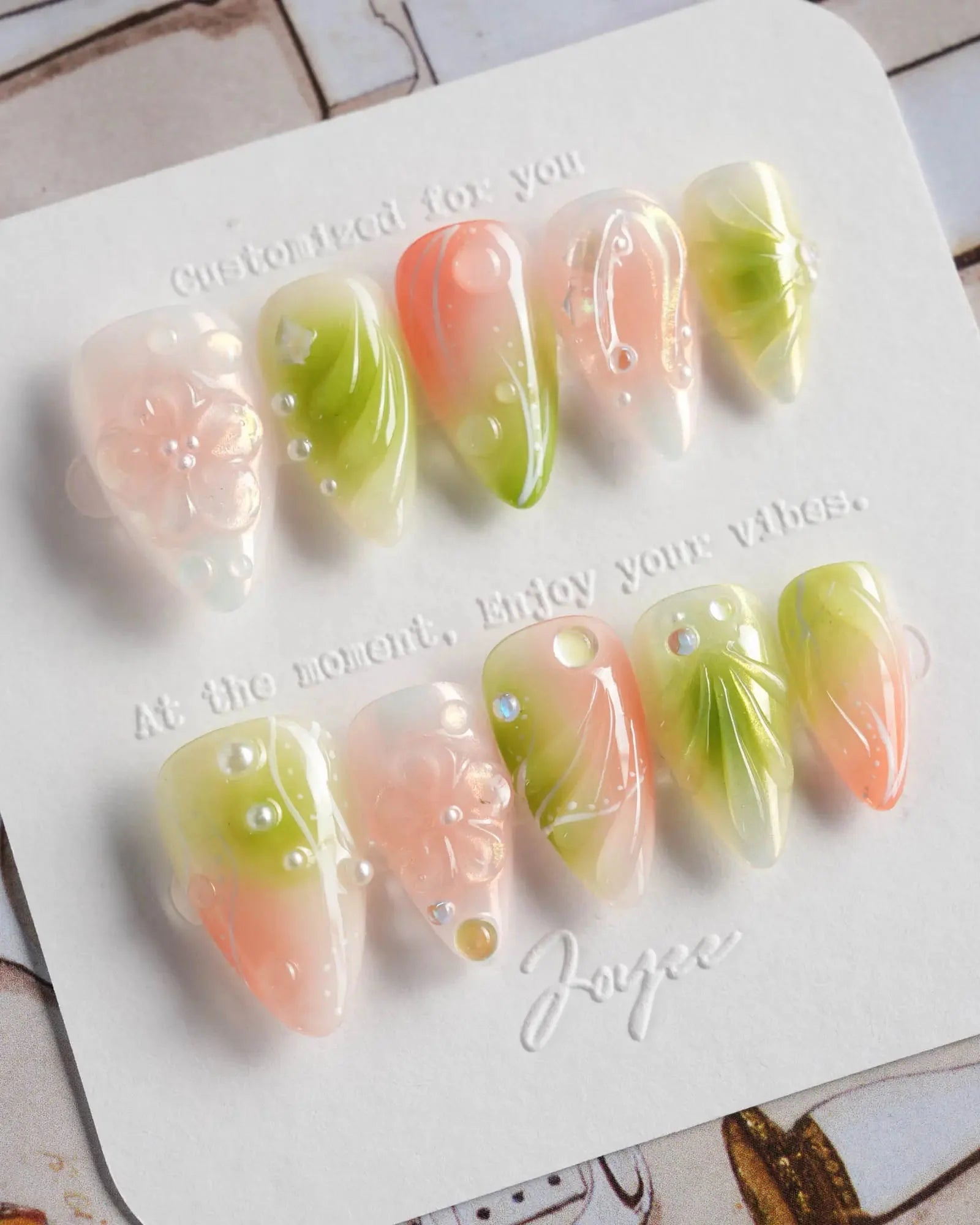 Translucent jade base with floating peach-orange petals. Holographic flakes create moving watercolor ripples with light.