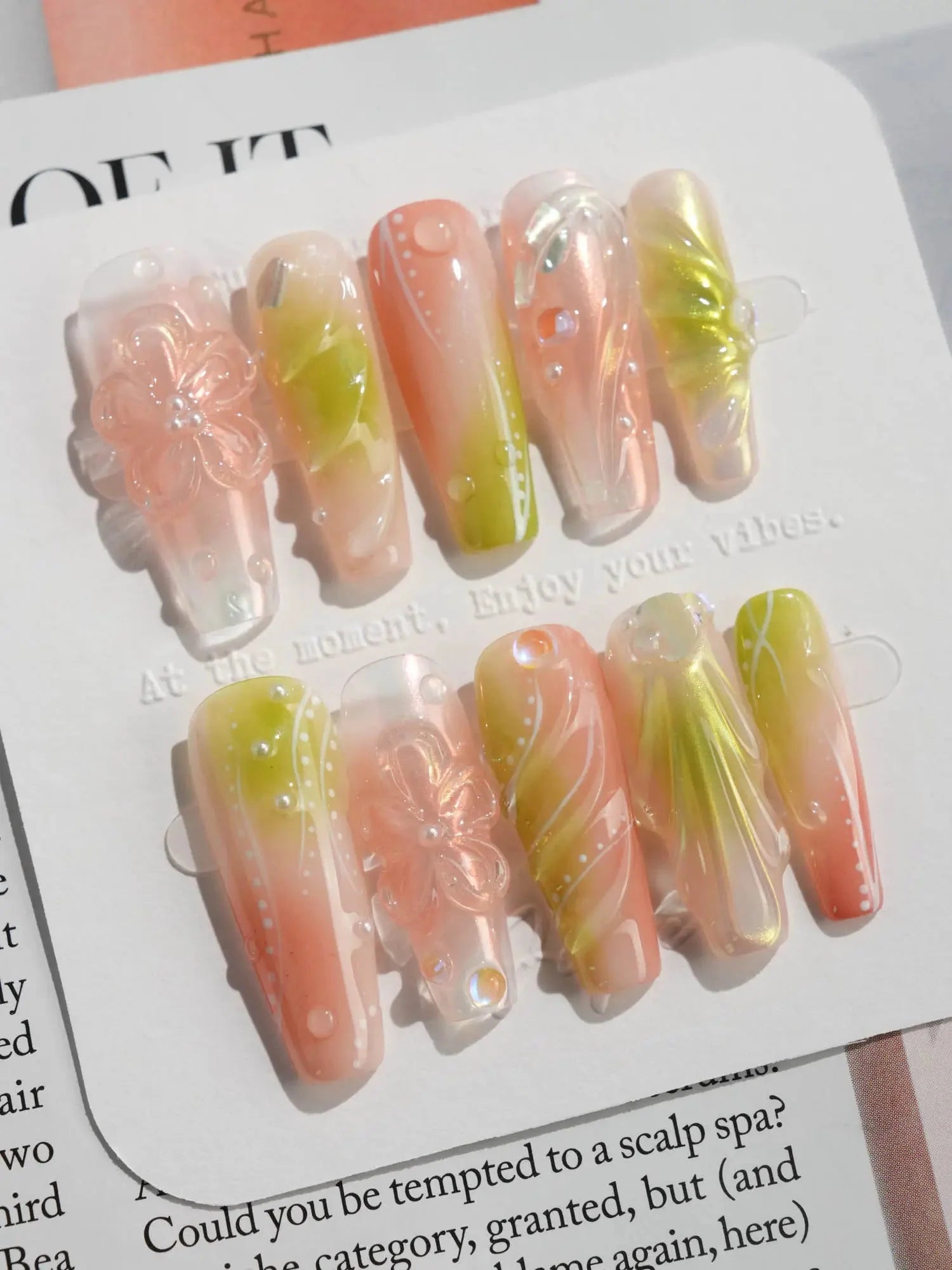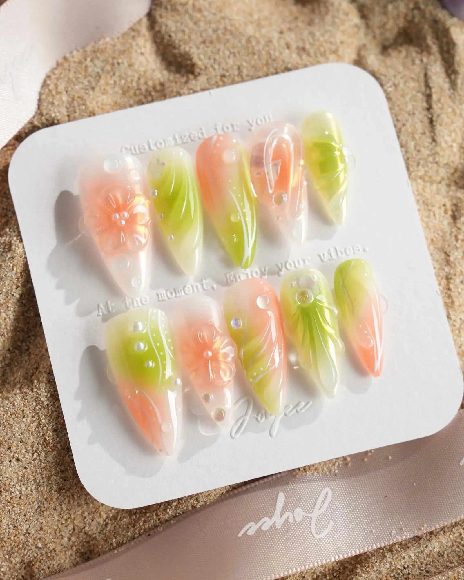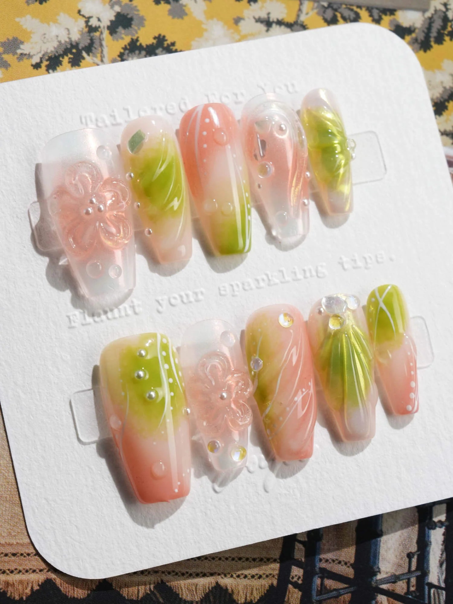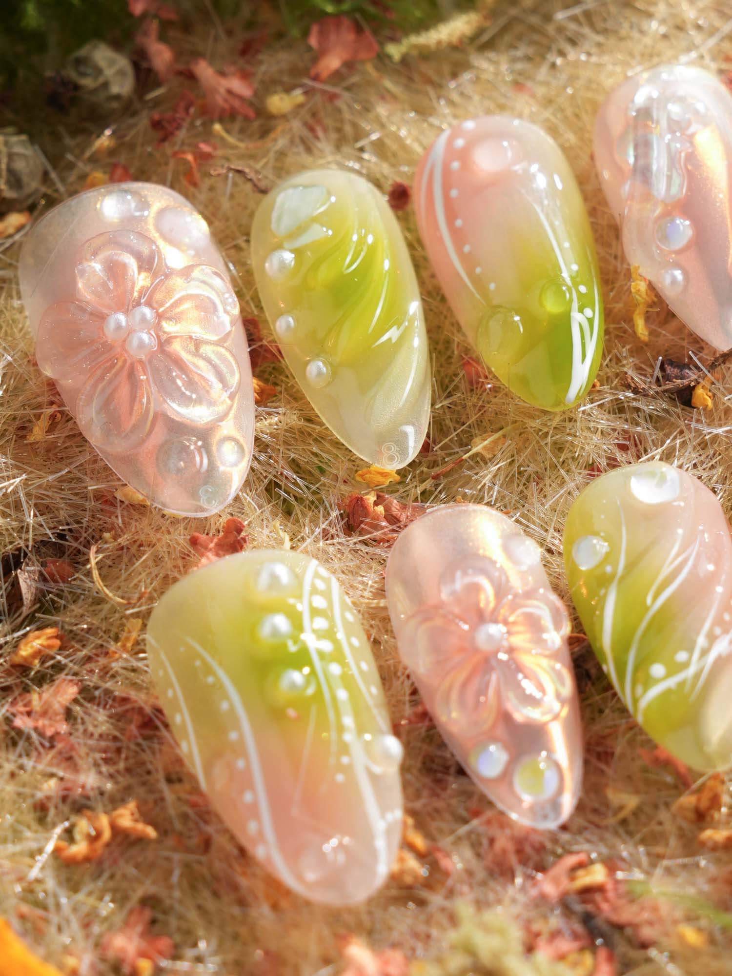 Translucent jade base with floating peach-orange petals. Holographic flakes create moving watercolor ripples with light.