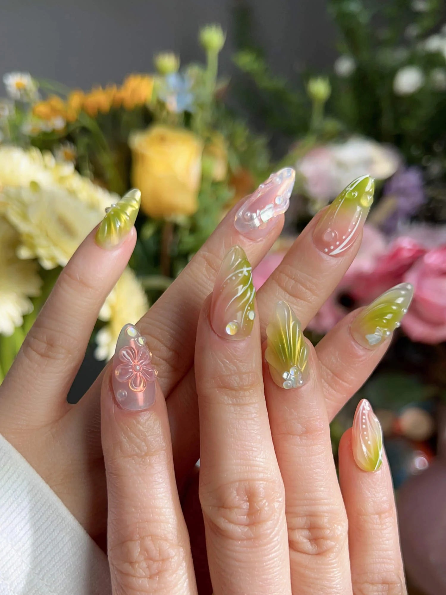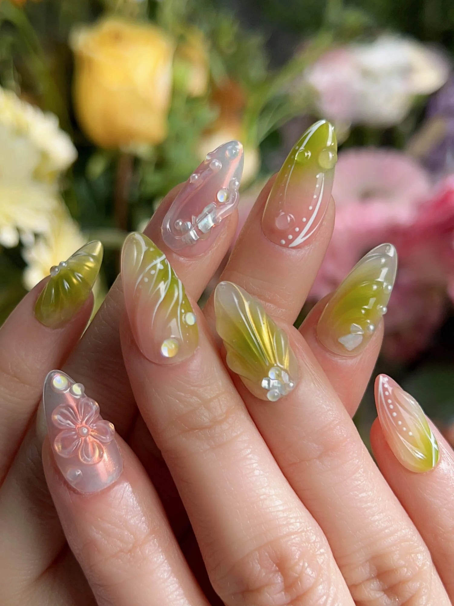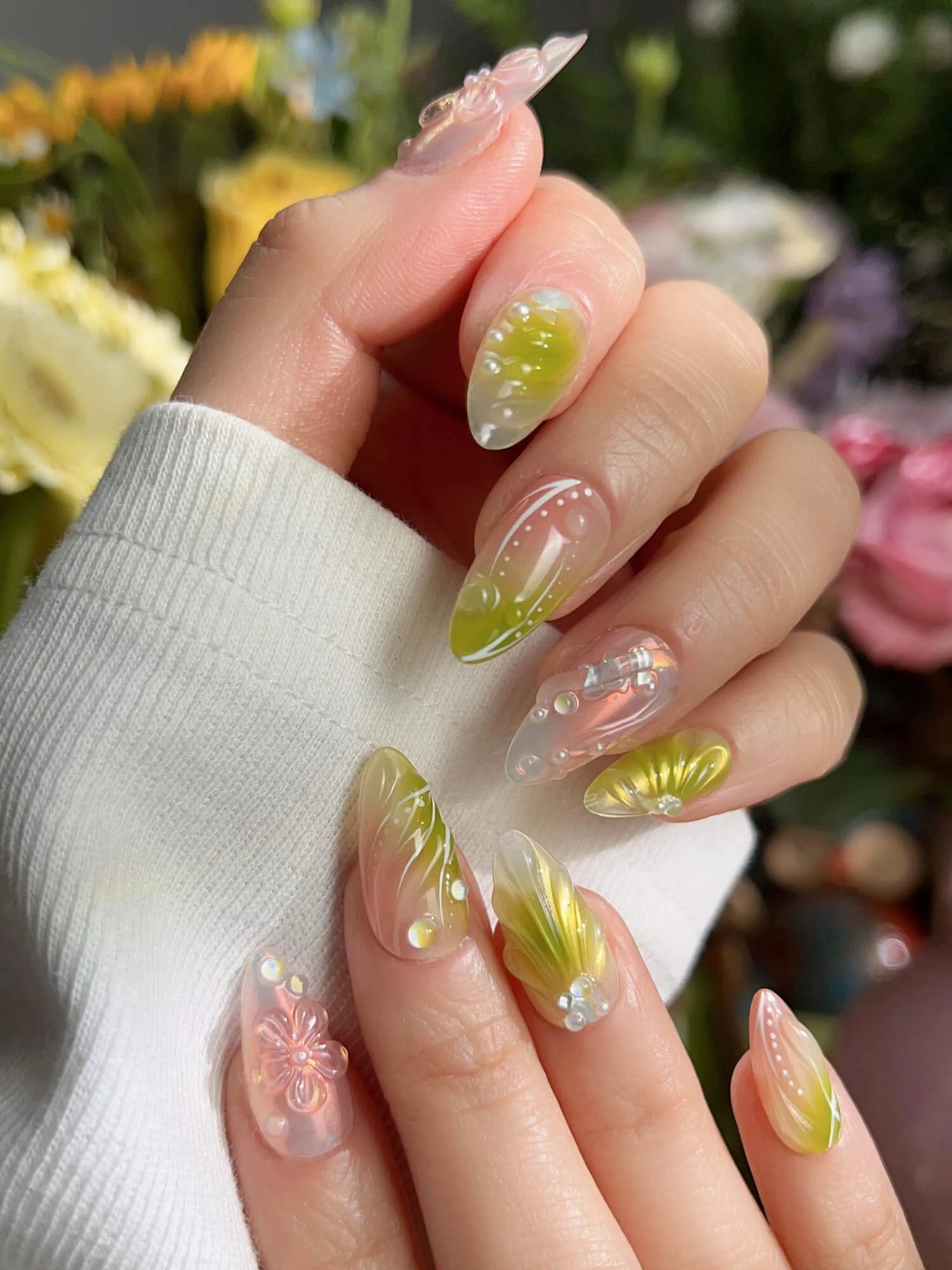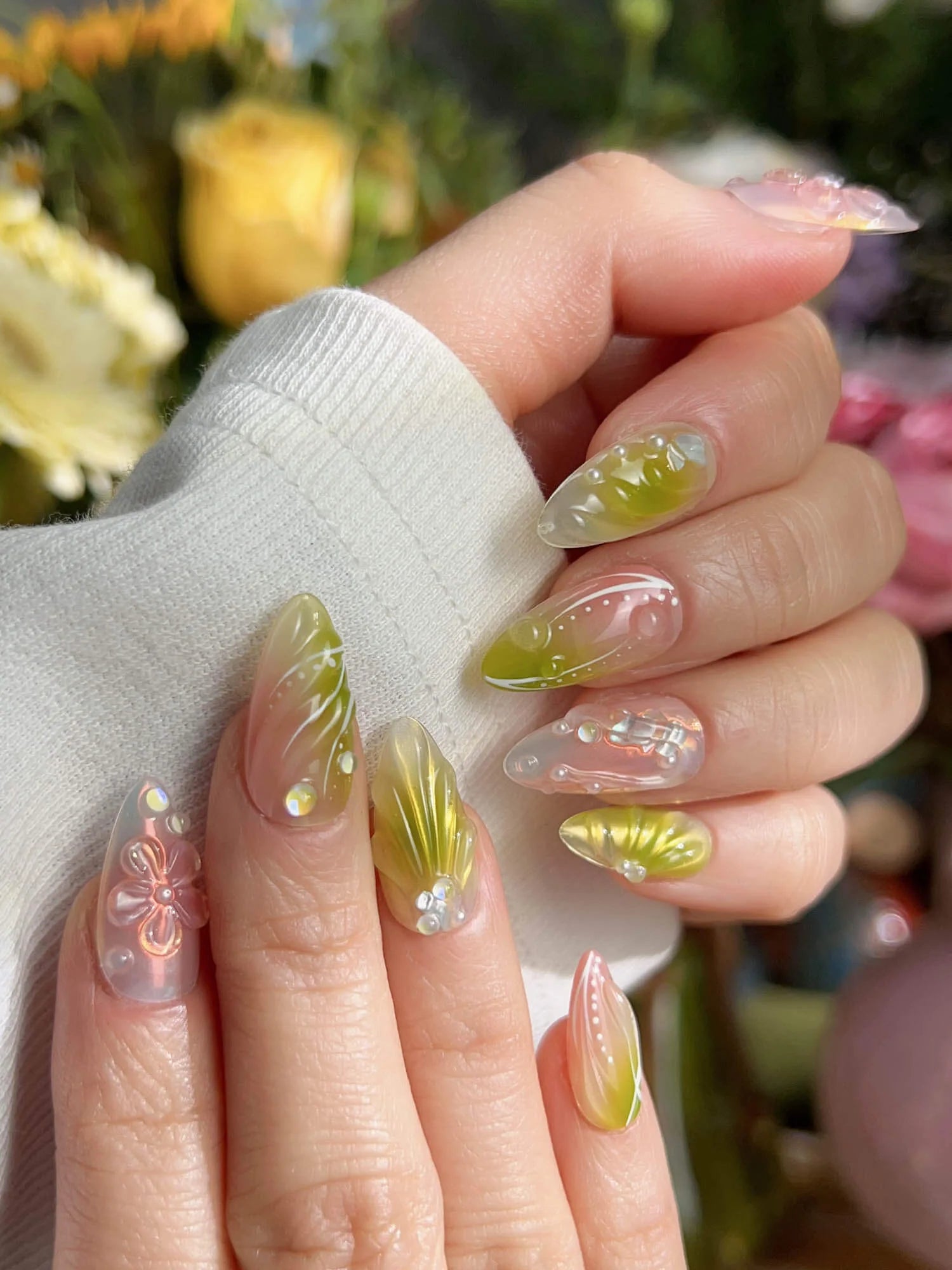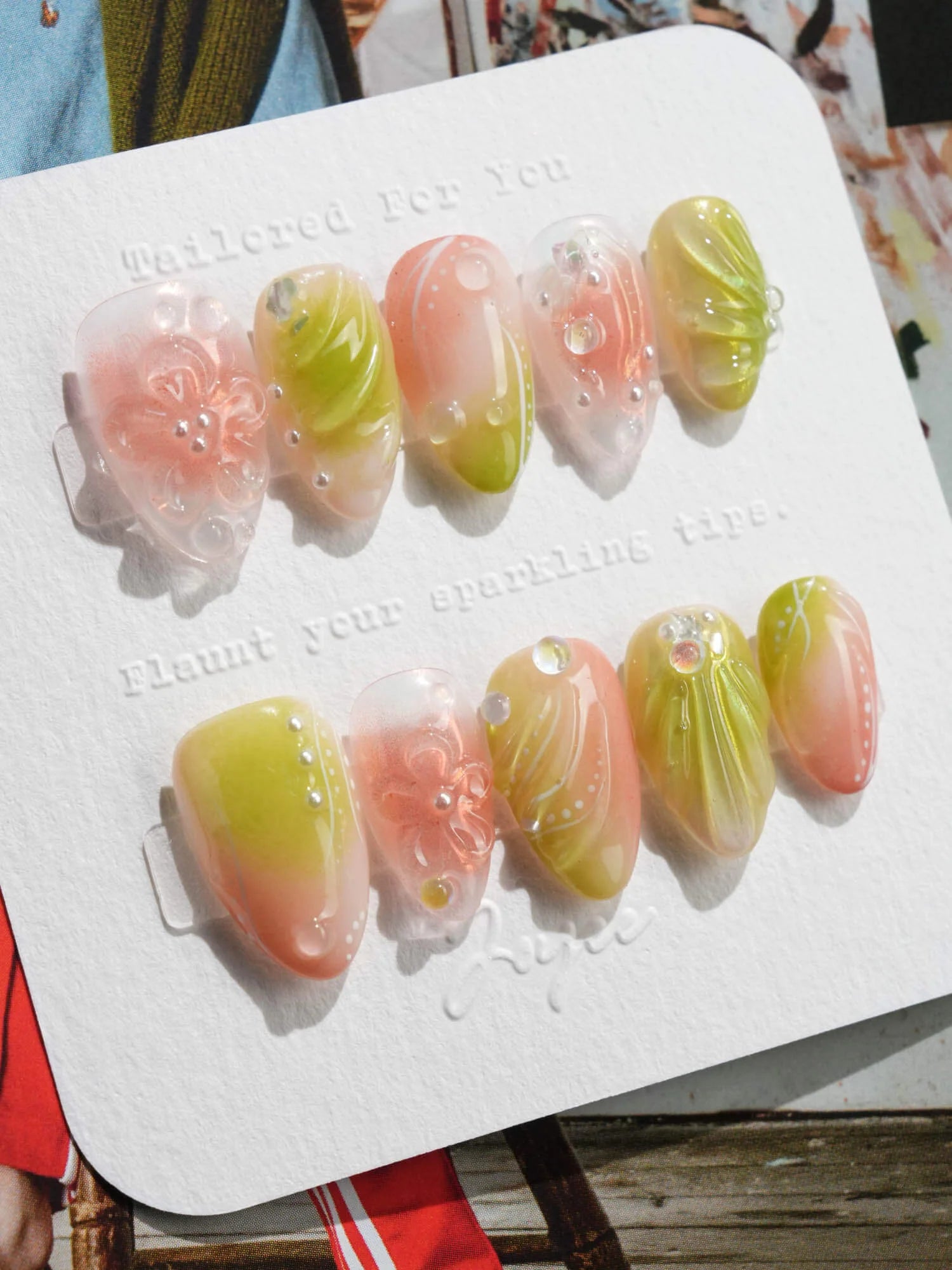Translucent jade base with floating peach-orange petals. Holographic flakes create moving watercolor ripples with light.