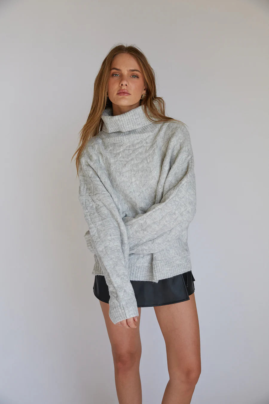 Cozy up in the August Cable Knit Turtleneck Chunky Sweater this Fall Season! This oversized sweater features a chunky turtle neckline, cable knit patter, and oh-so-soft fabrication! Available in Pale Grey; style with a chic mini skort to complete the look!