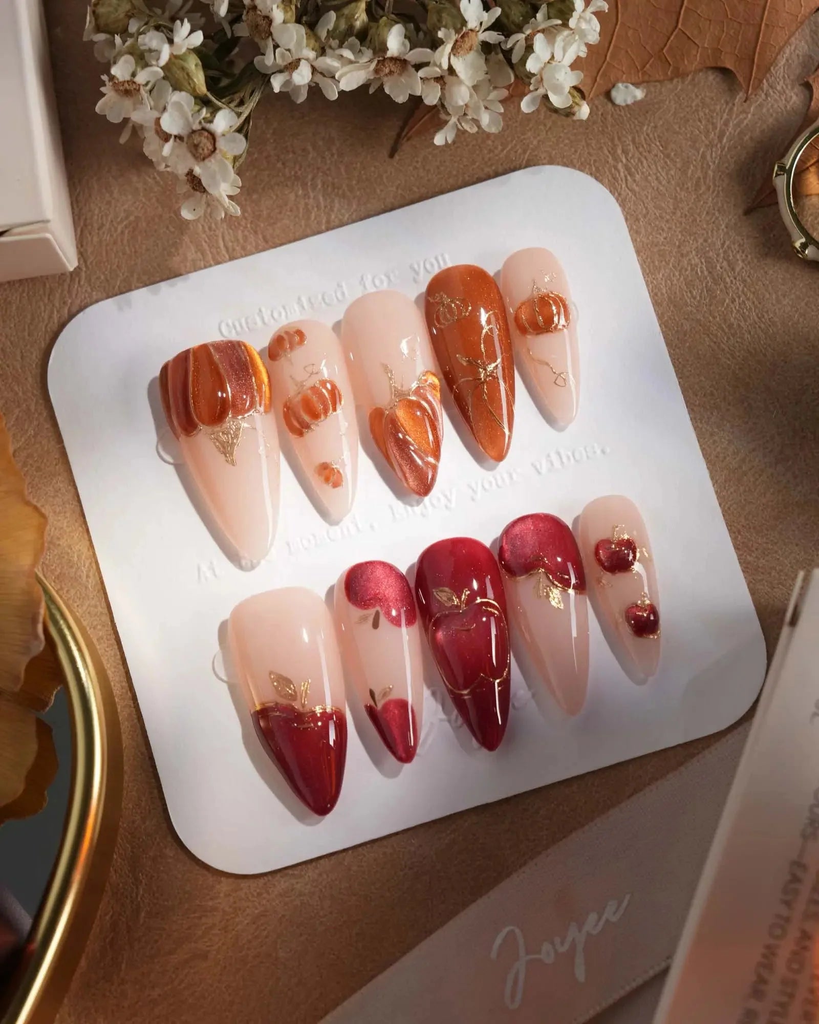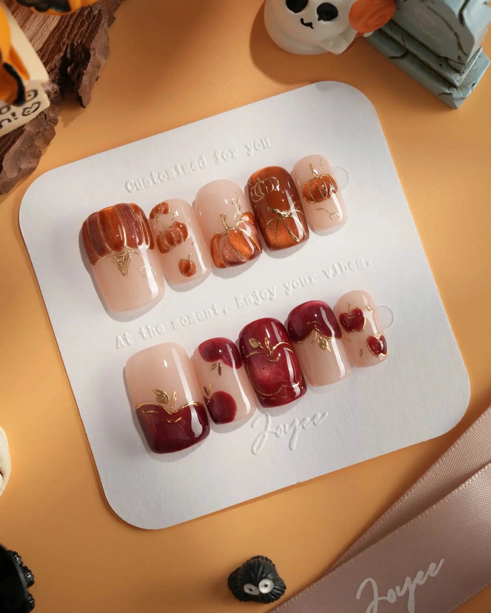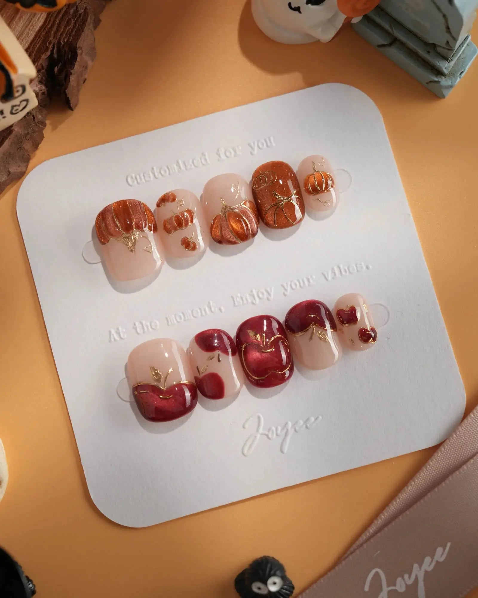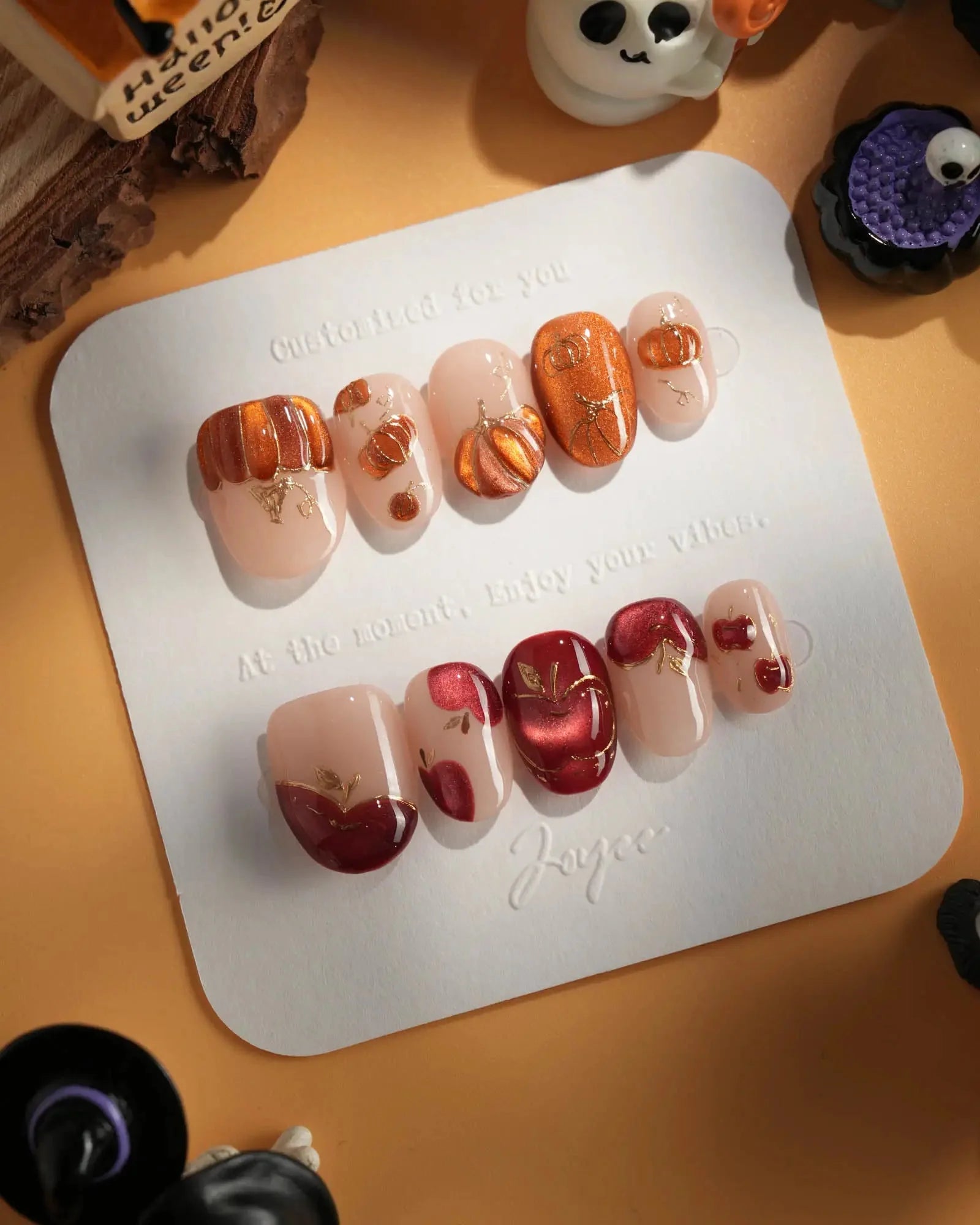 Pumpkin sparkles and apple glow—a playful harvest combo. Pair with a wool scarf, cable-knit, and hot cider for a perfect fall vibe. Perfect for vacations, parties, and seasonal outings, these handmade nails combine playful detail with elegant sophistication for a standout autumn look.