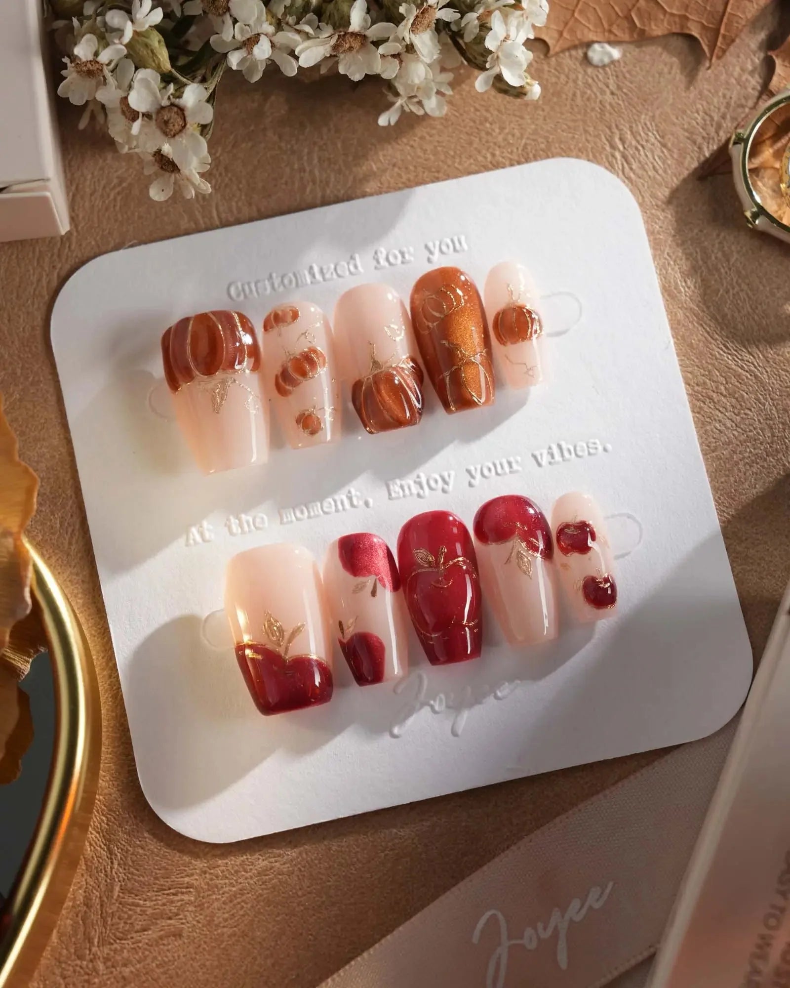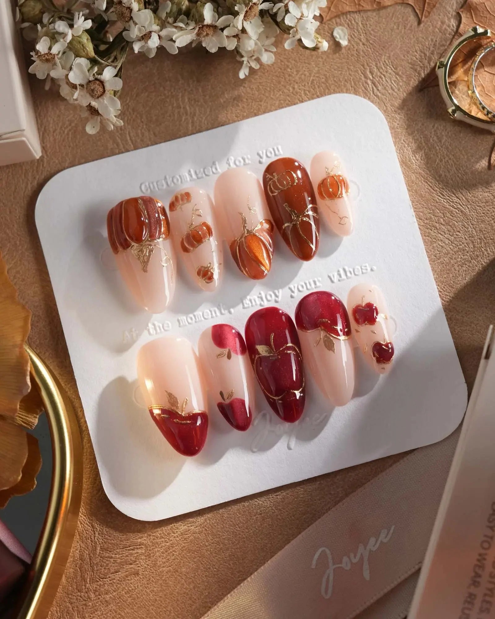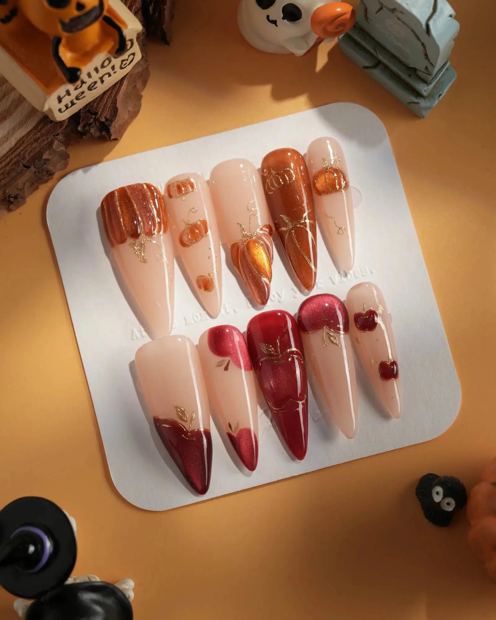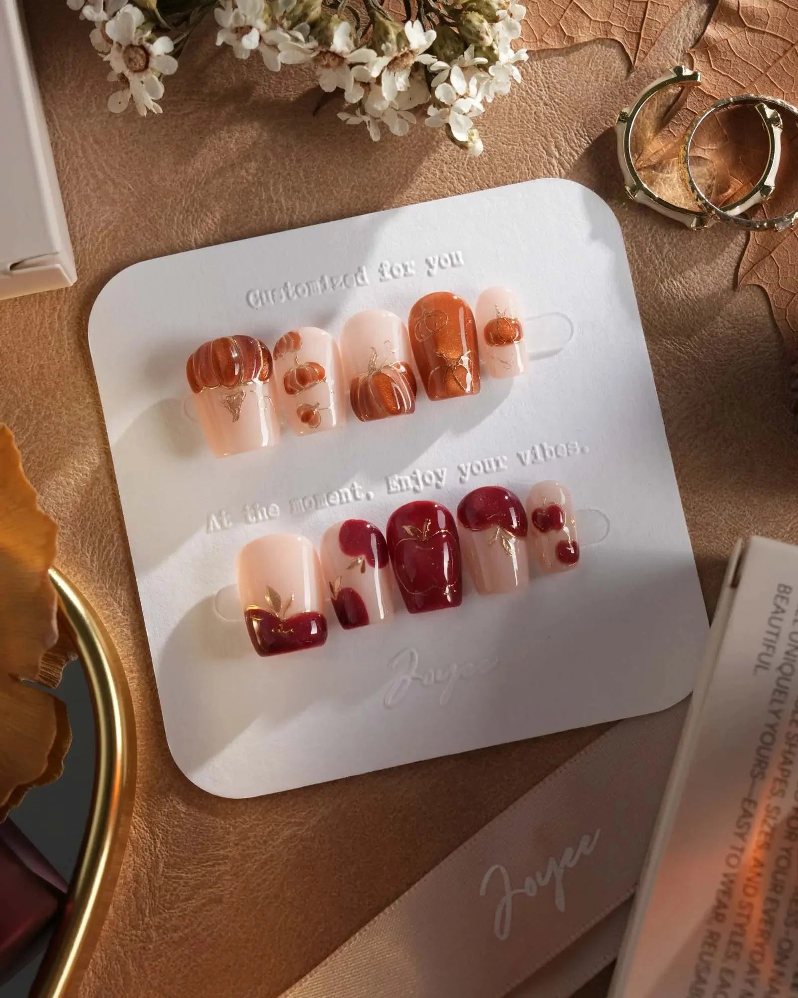 Pumpkin sparkles and apple glow—a playful harvest combo. Pair with a wool scarf, cable-knit, and hot cider for a perfect fall vibe. Perfect for vacations, parties, and seasonal outings, these handmade nails combine playful detail with elegant sophistication for a standout autumn look.