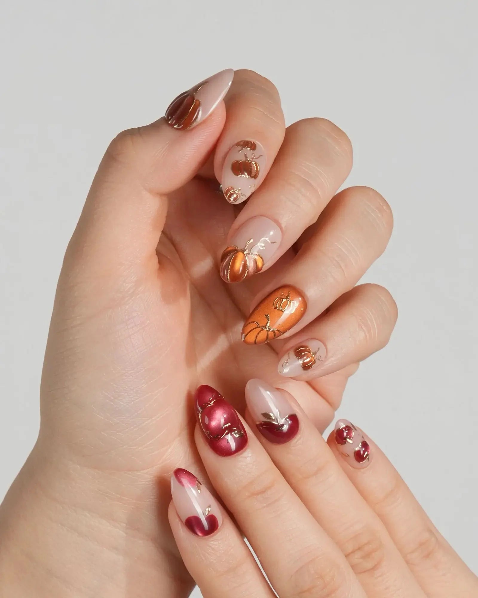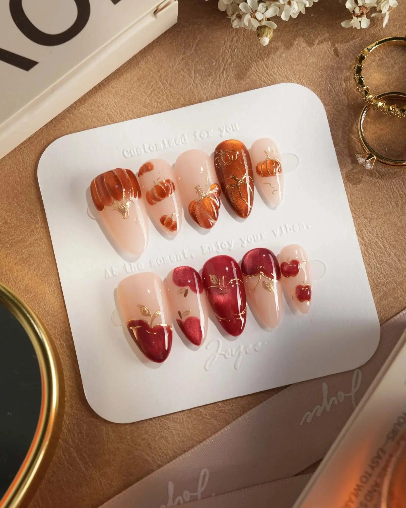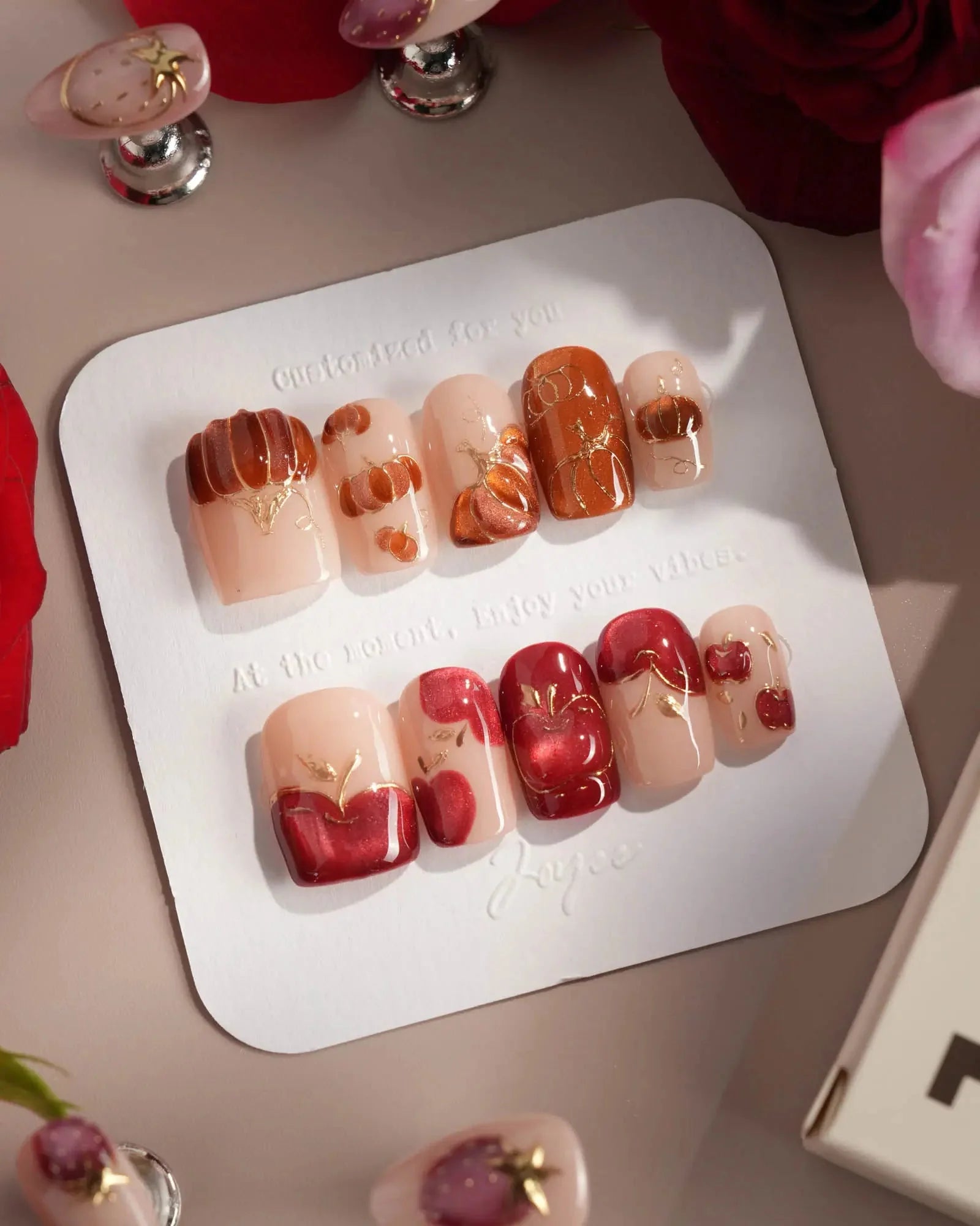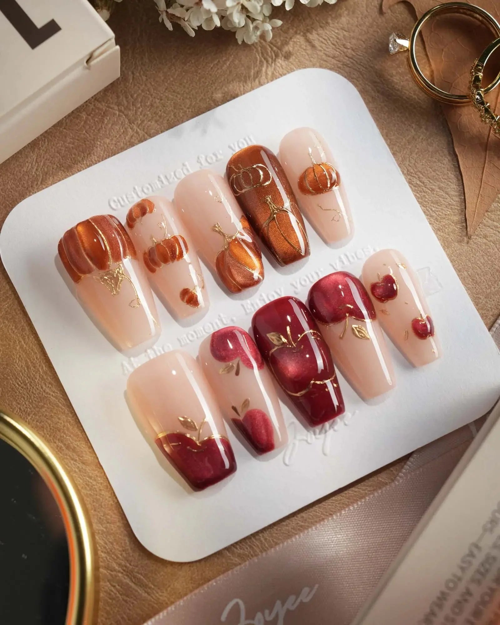 Pumpkin sparkles and apple glow—a playful harvest combo. Pair with a wool scarf, cable-knit, and hot cider for a perfect fall vibe. Perfect for vacations, parties, and seasonal outings, these handmade nails combine playful detail with elegant sophistication for a standout autumn look.