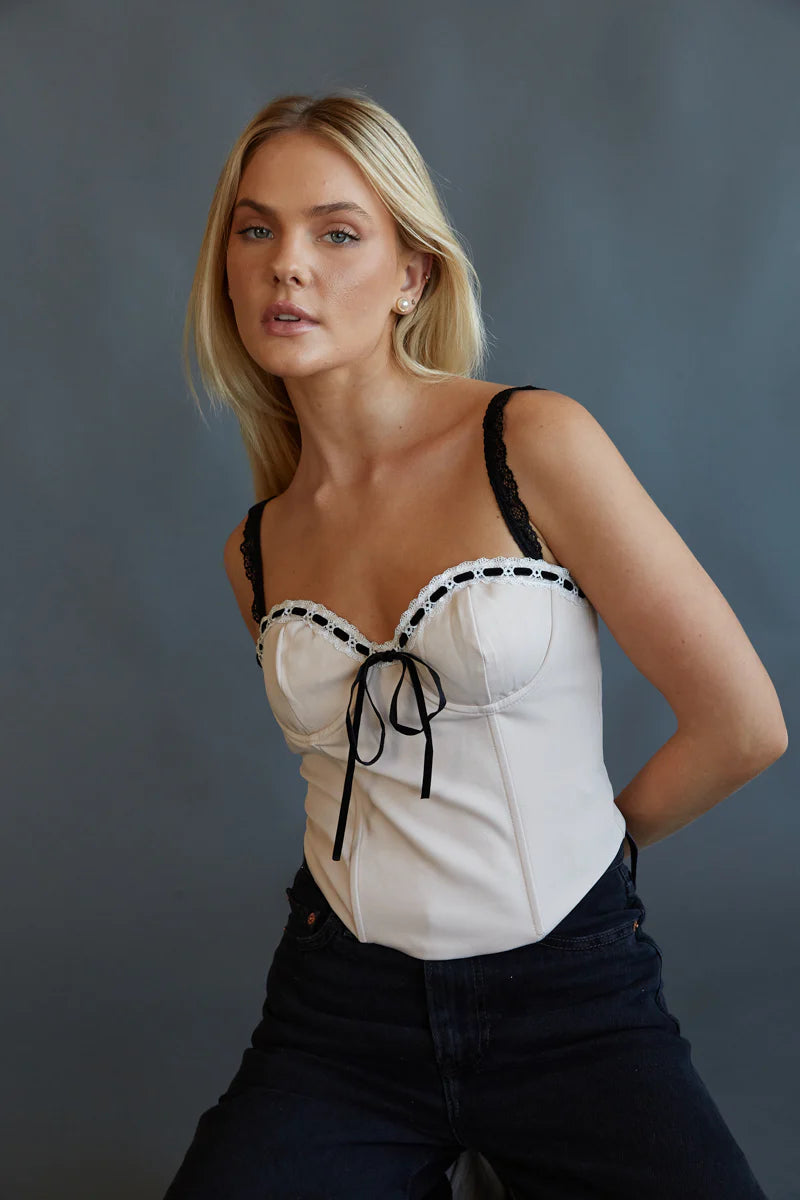 The Ayla Contrast Corset Top is the perfect combination of sultry and sweet! This feminine top features a bustier-style bodice, supportive boning details, black lace spaghetti straps, and a white lace trim with an interweaved black velvet ribbon that ties at the center.