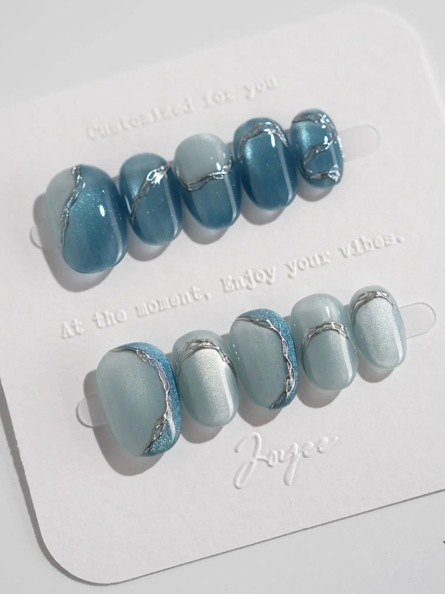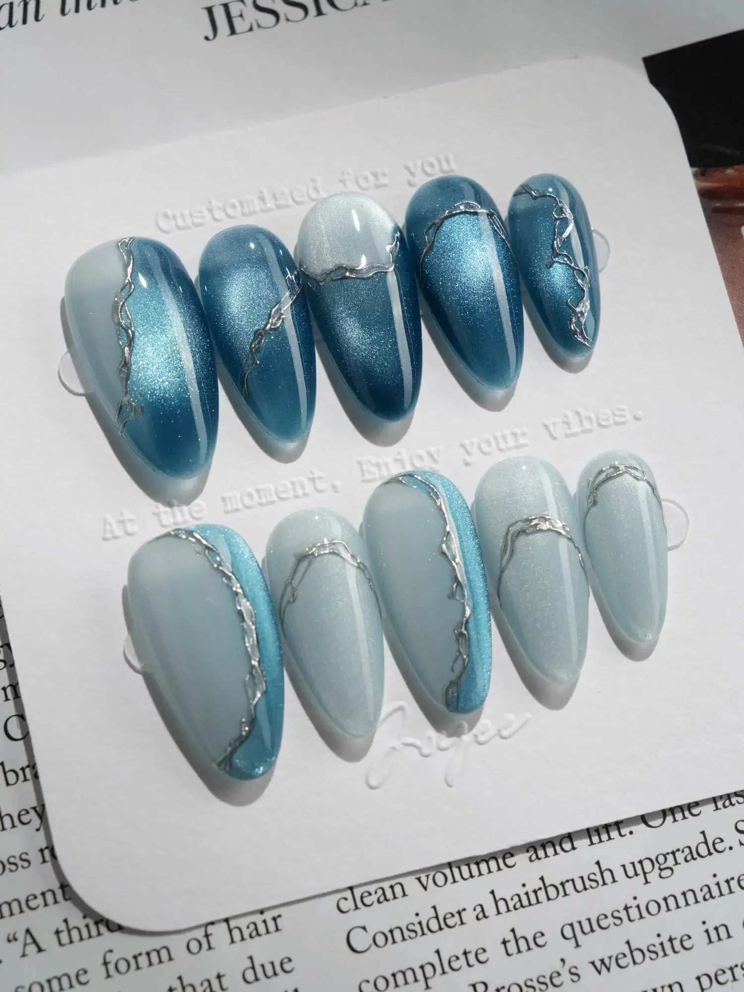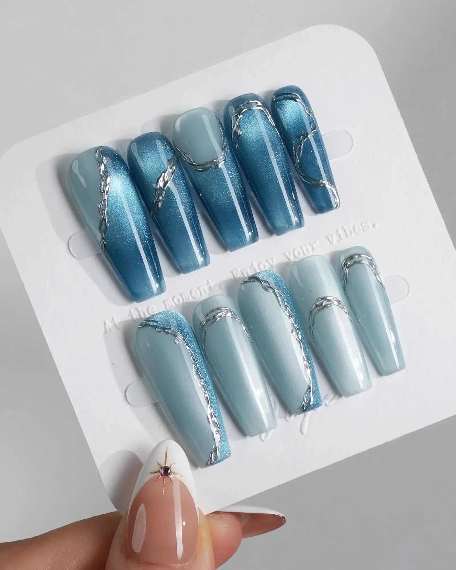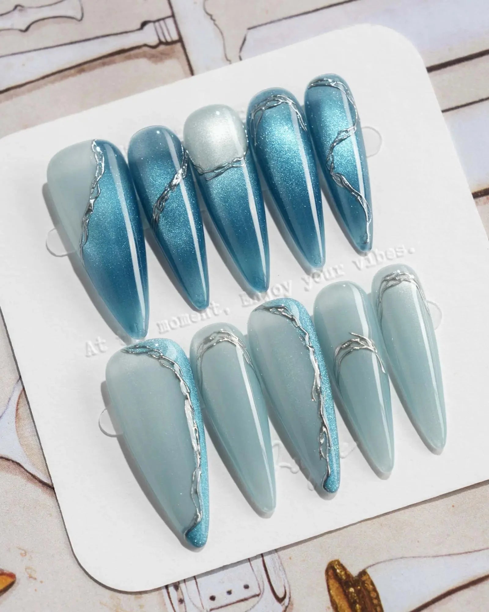 This magnetic blue set features a stunning cat-eye effect with deep shimmer and silver chrome outlines that trace the shape like liquid metal. Icy gradients and fluid edges give this design a polished, cool-toned elegance—ideal for minimalists who still want impact. Inspired by frozen light and metallic landscapes, it’s a winter-ready statement for modern nail lovers.
