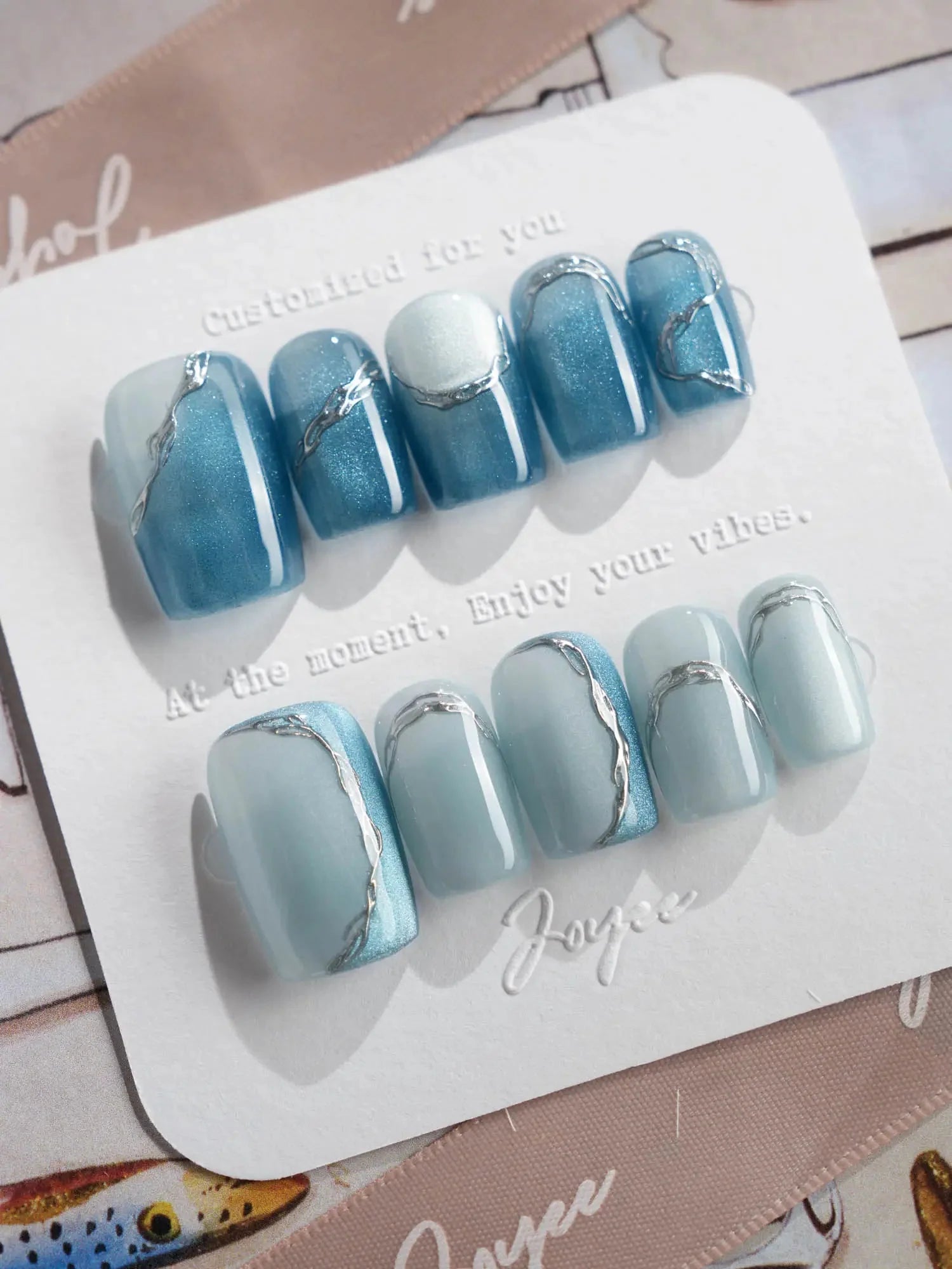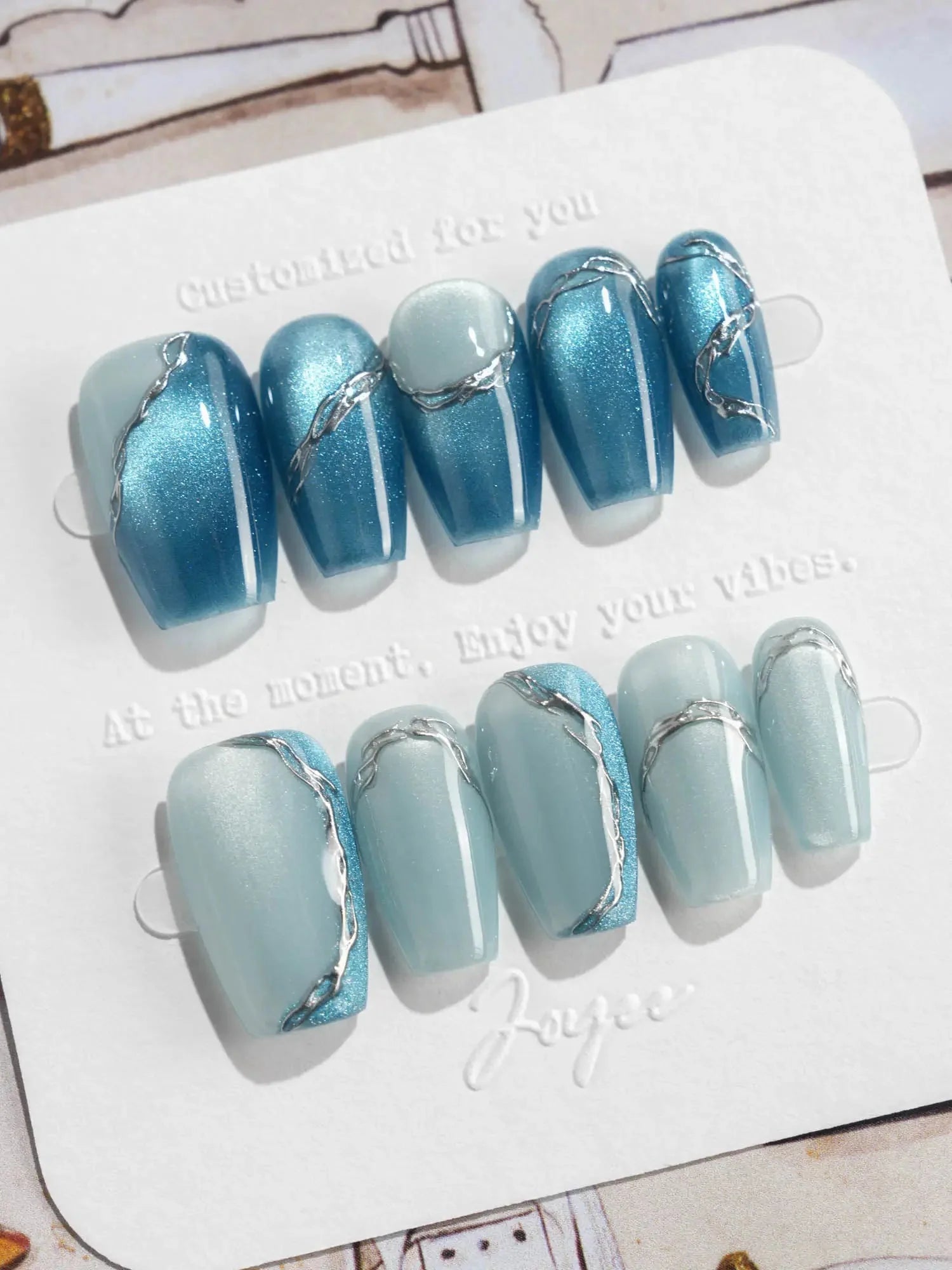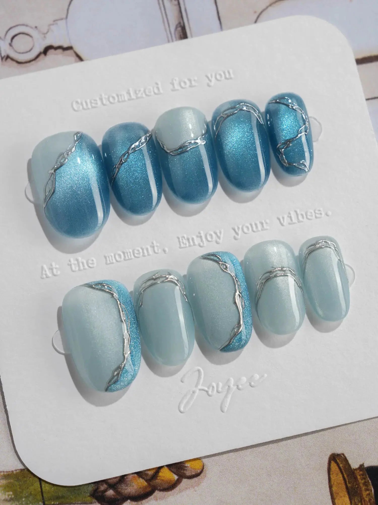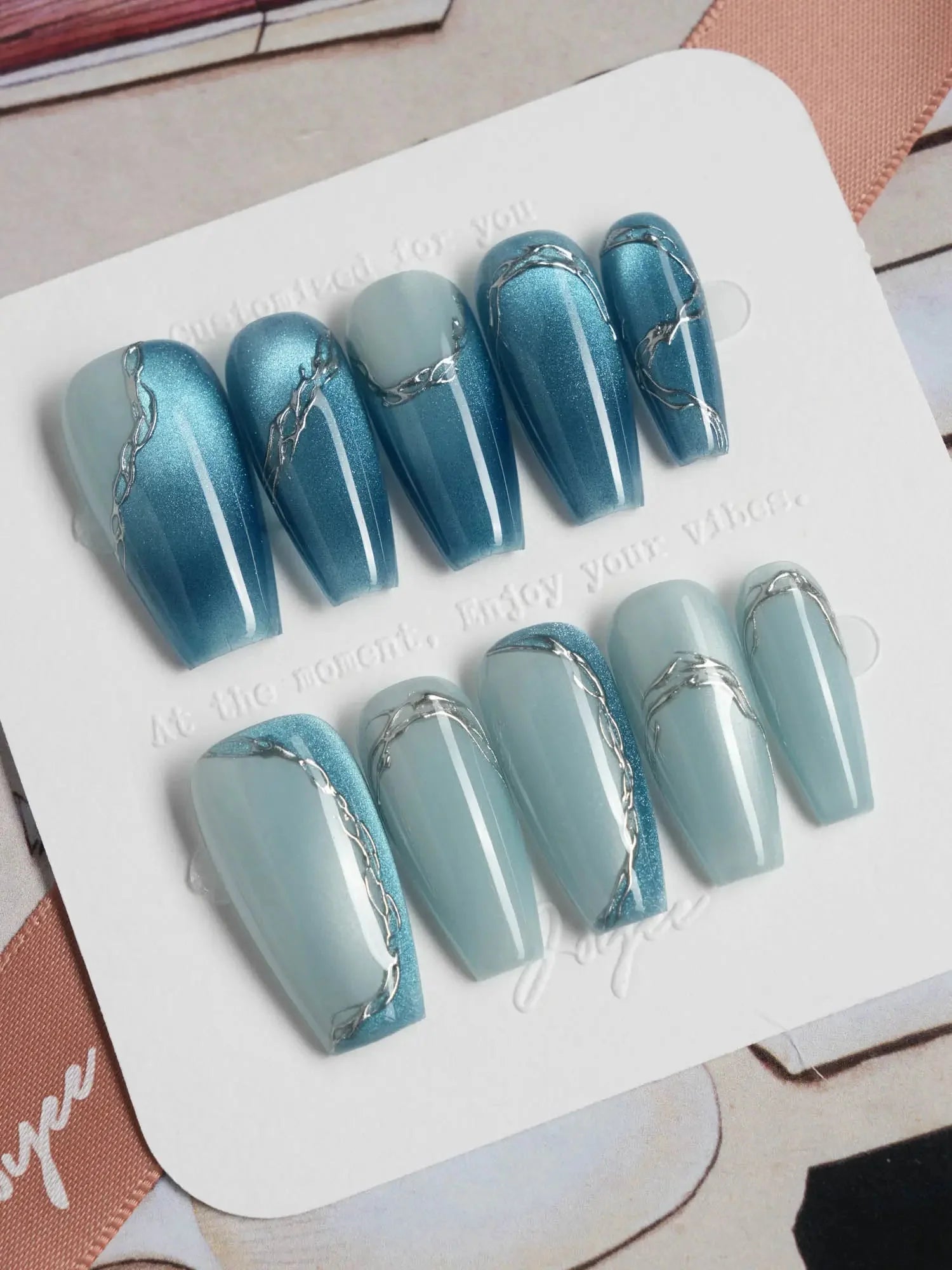 This magnetic blue set features a stunning cat-eye effect with deep shimmer and silver chrome outlines that trace the shape like liquid metal. Icy gradients and fluid edges give this design a polished, cool-toned elegance—ideal for minimalists who still want impact. Inspired by frozen light and metallic landscapes, it’s a winter-ready statement for modern nail lovers.