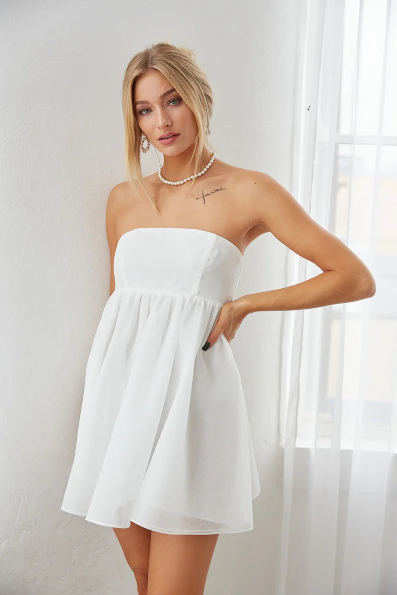 Be the life of the party in the Bella Strapless Babydoll Mini Dress! This gorgeous mini dress is fully lined with an organza overlay. Pair with some cowboy boots for a trendy take on a classic style!