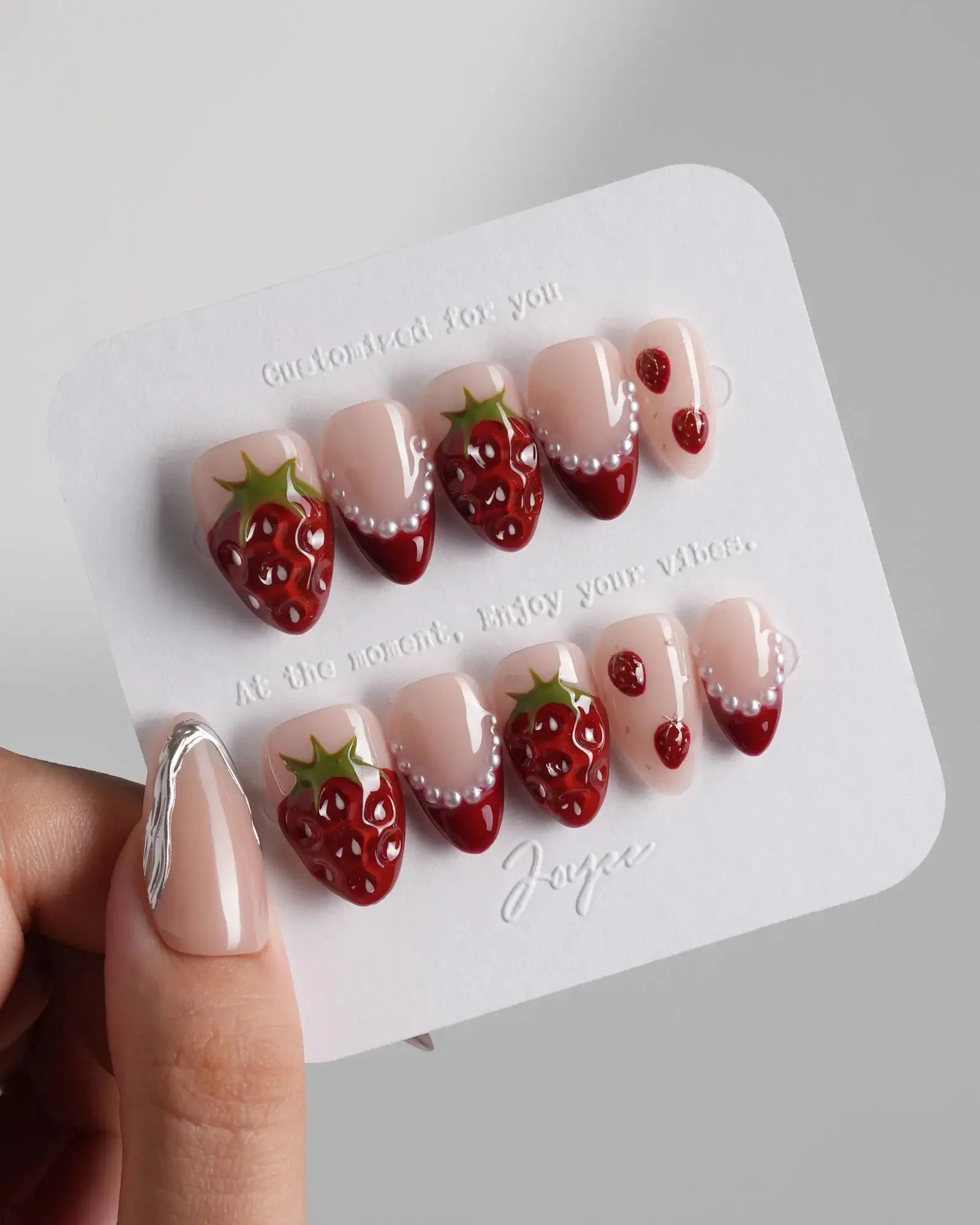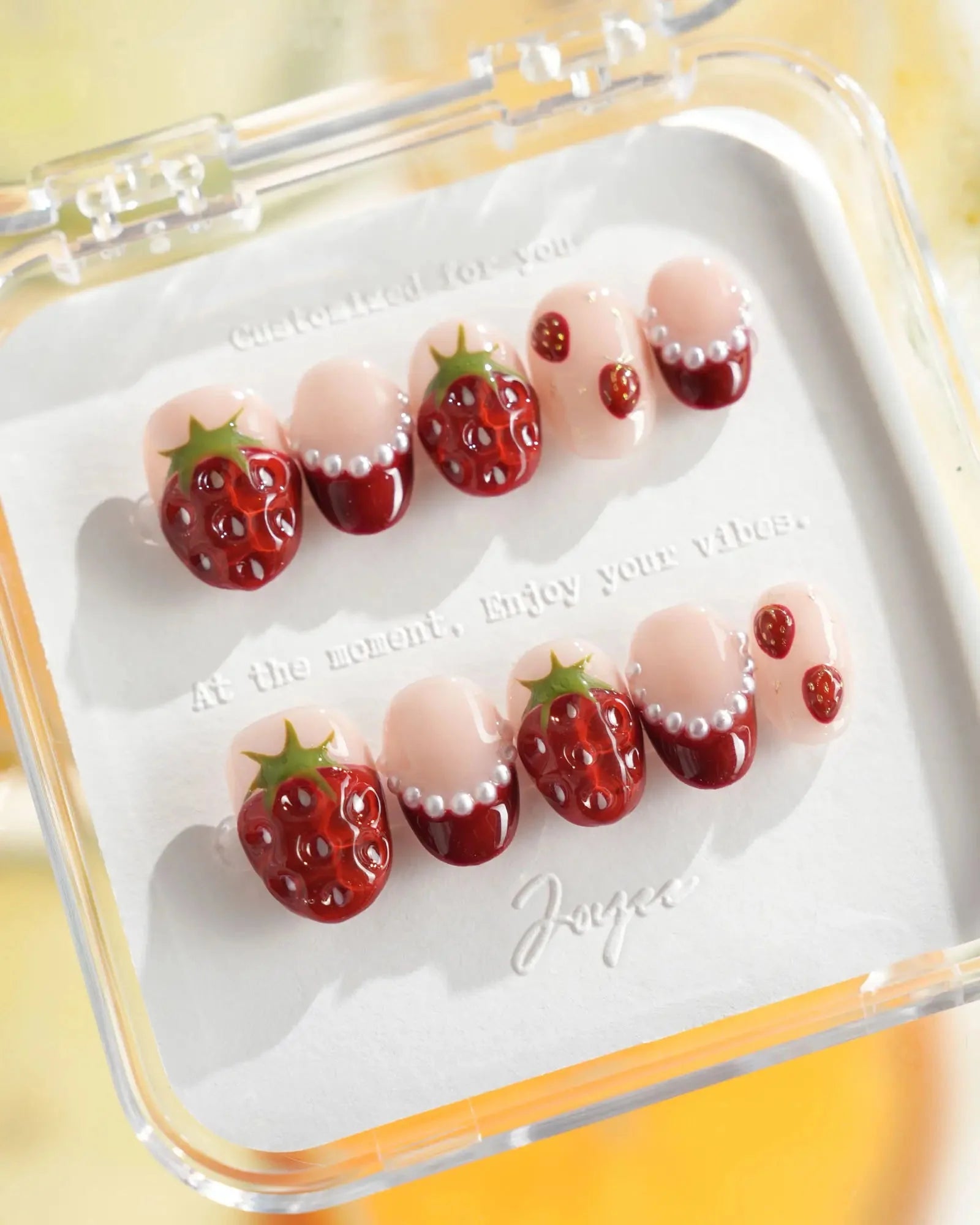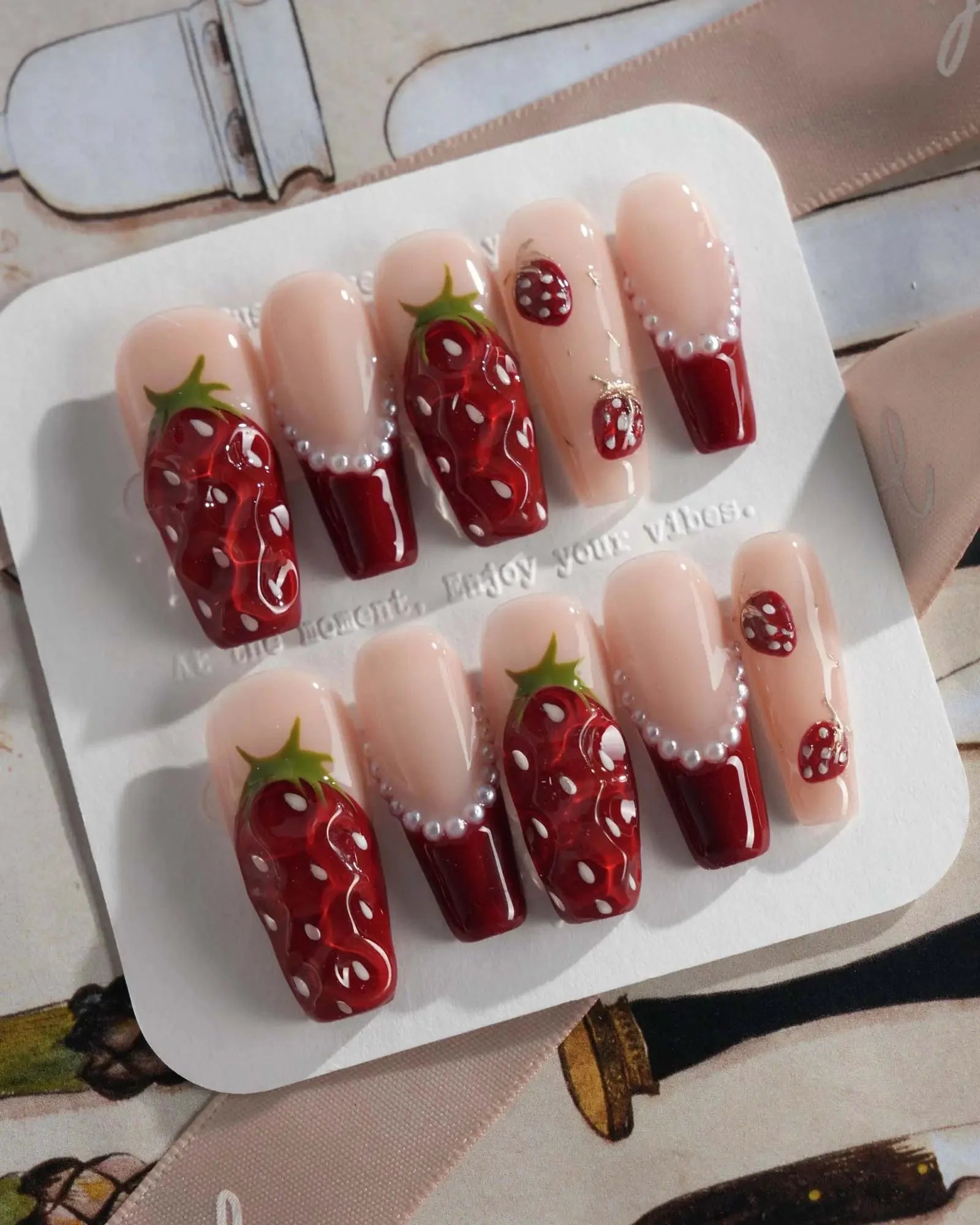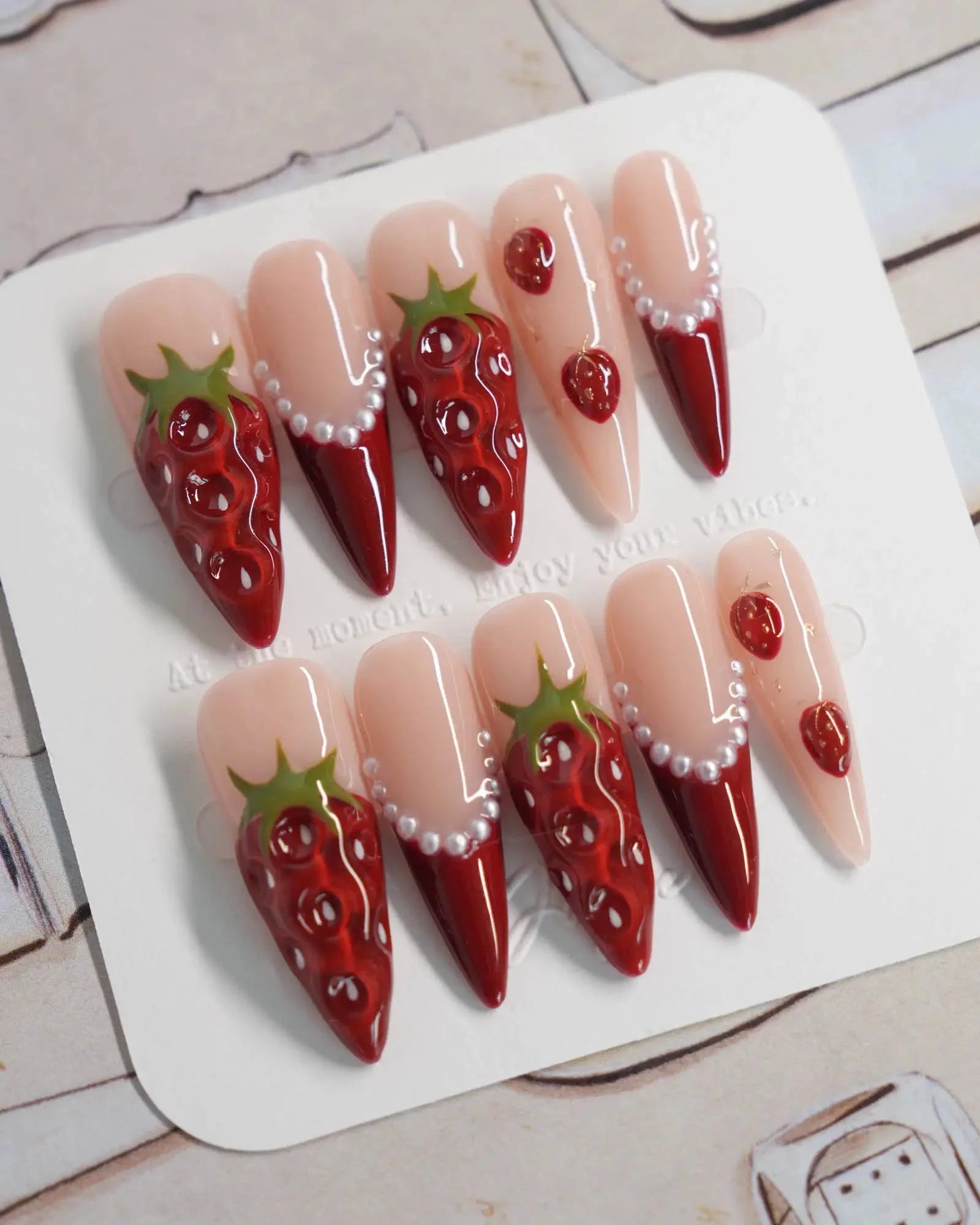 Juicy red 3D strawberries, glossy tips, and sweet faux pearls come together for a fruity fantasy. They look almost edible—don’t say we didn’t warn you.