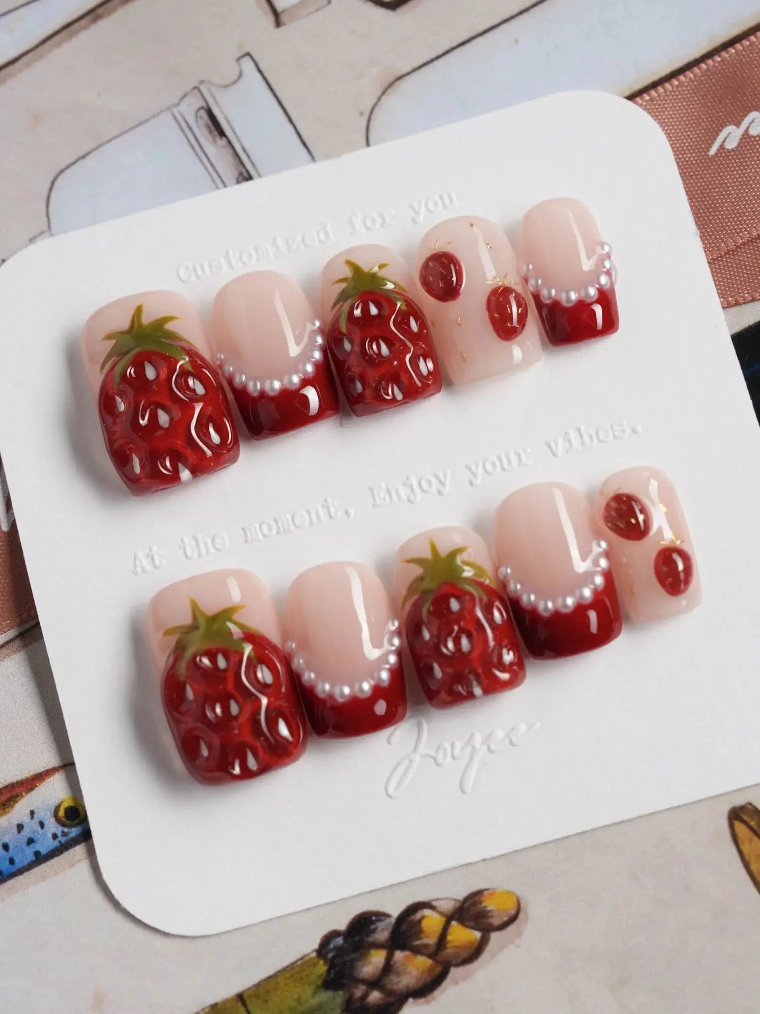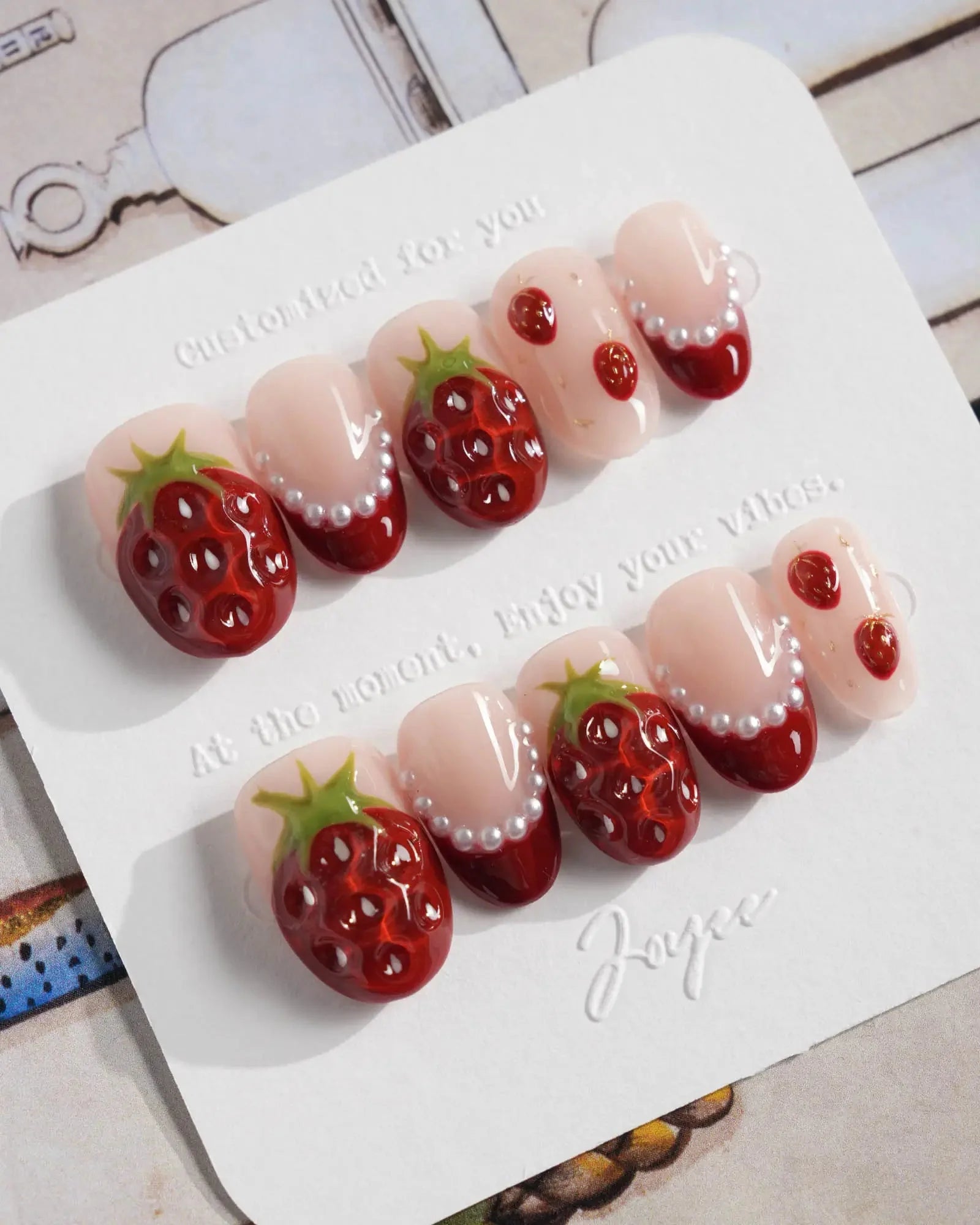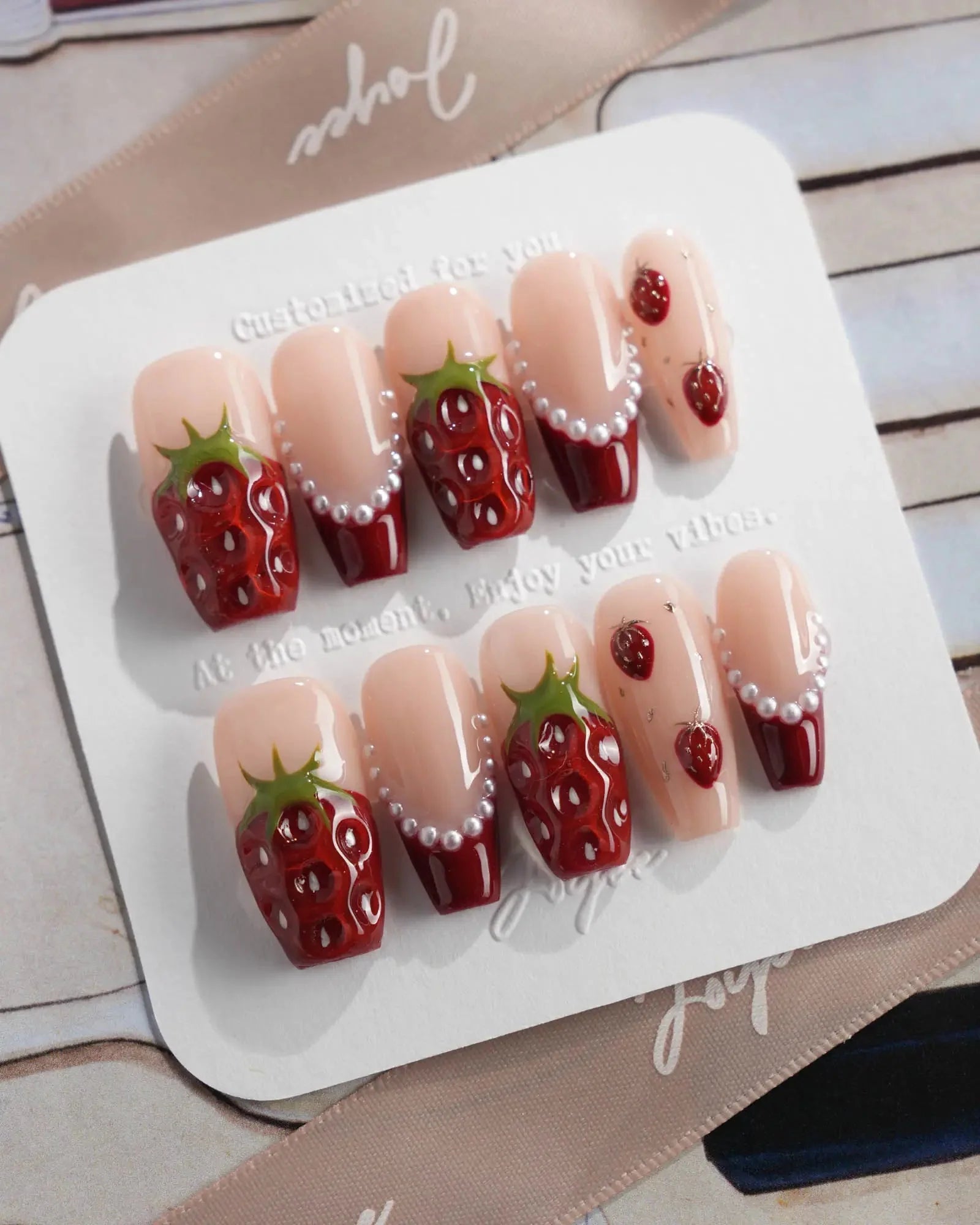 Juicy red 3D strawberries, glossy tips, and sweet faux pearls come together for a fruity fantasy. They look almost edible—don’t say we didn’t warn you.