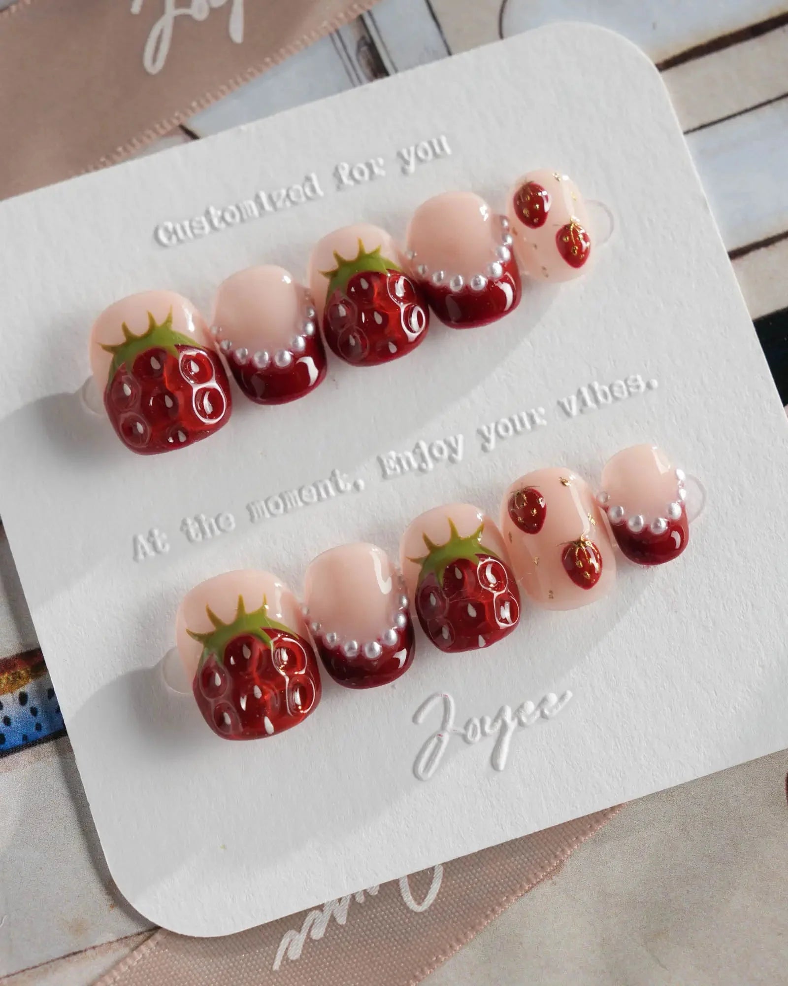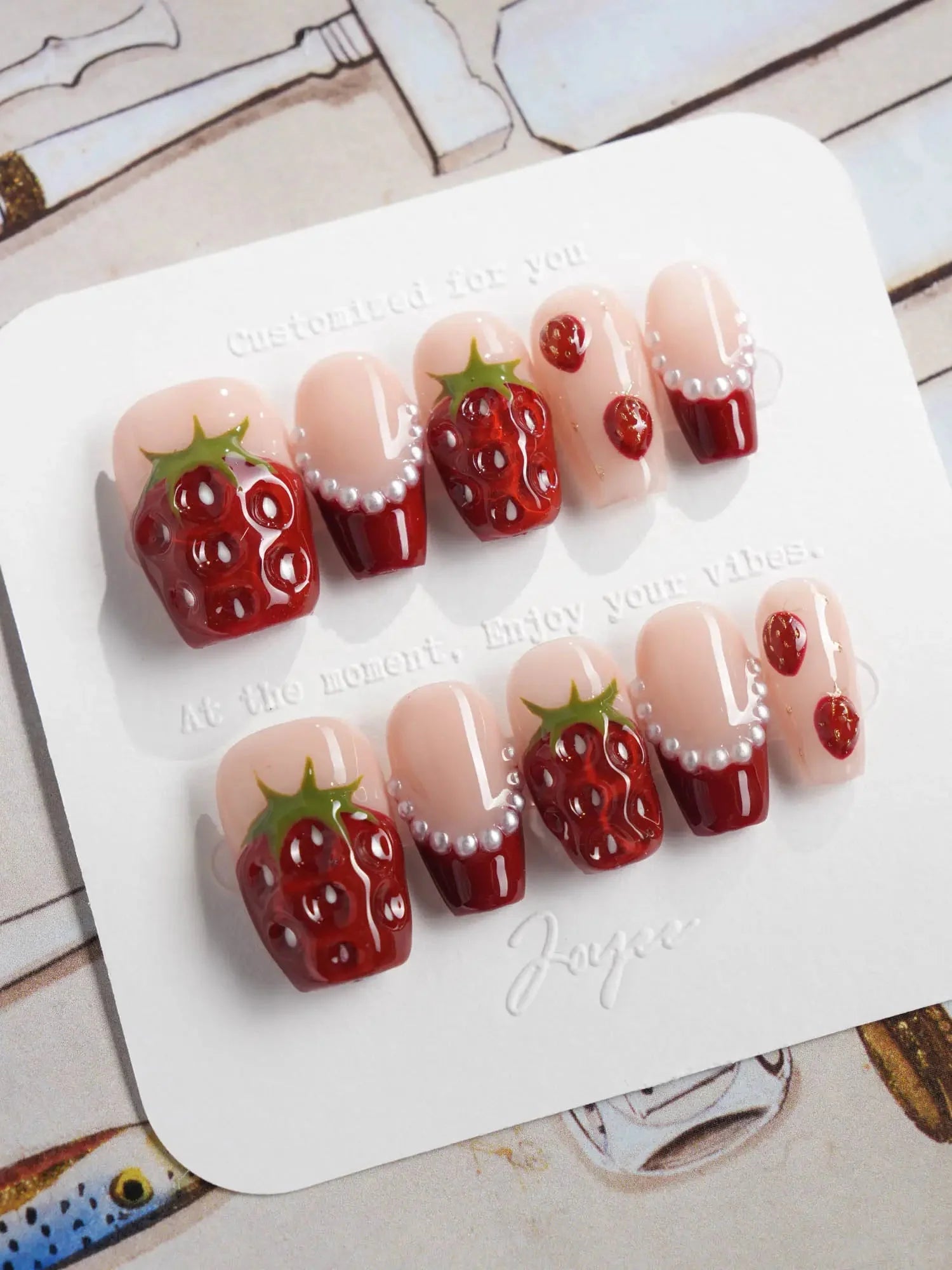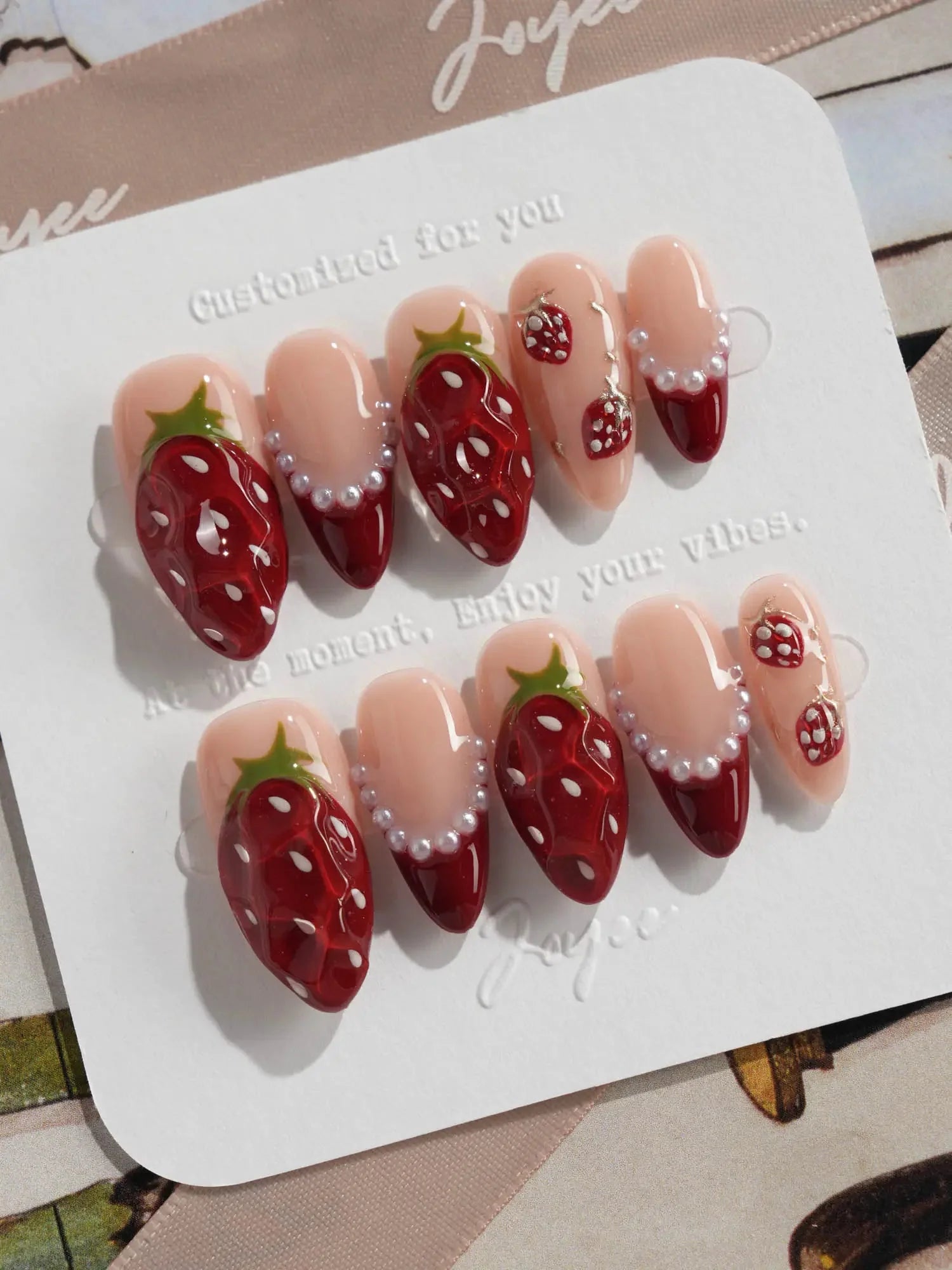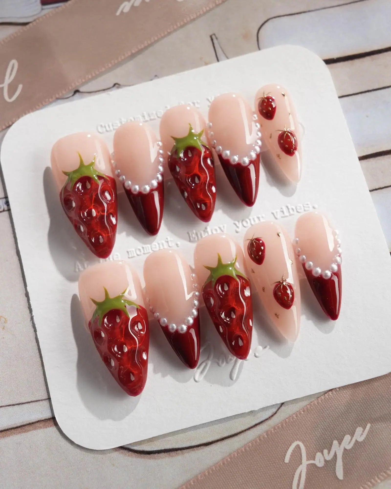 Juicy red 3D strawberries, glossy tips, and sweet faux pearls come together for a fruity fantasy. They look almost edible—don’t say we didn’t warn you.