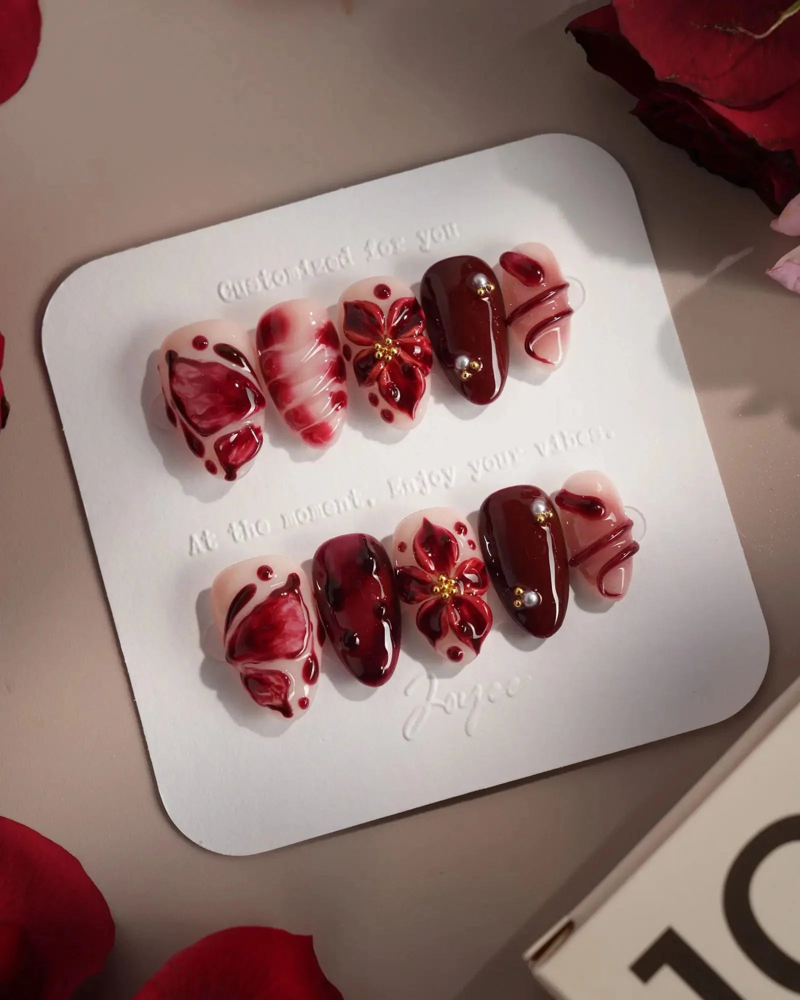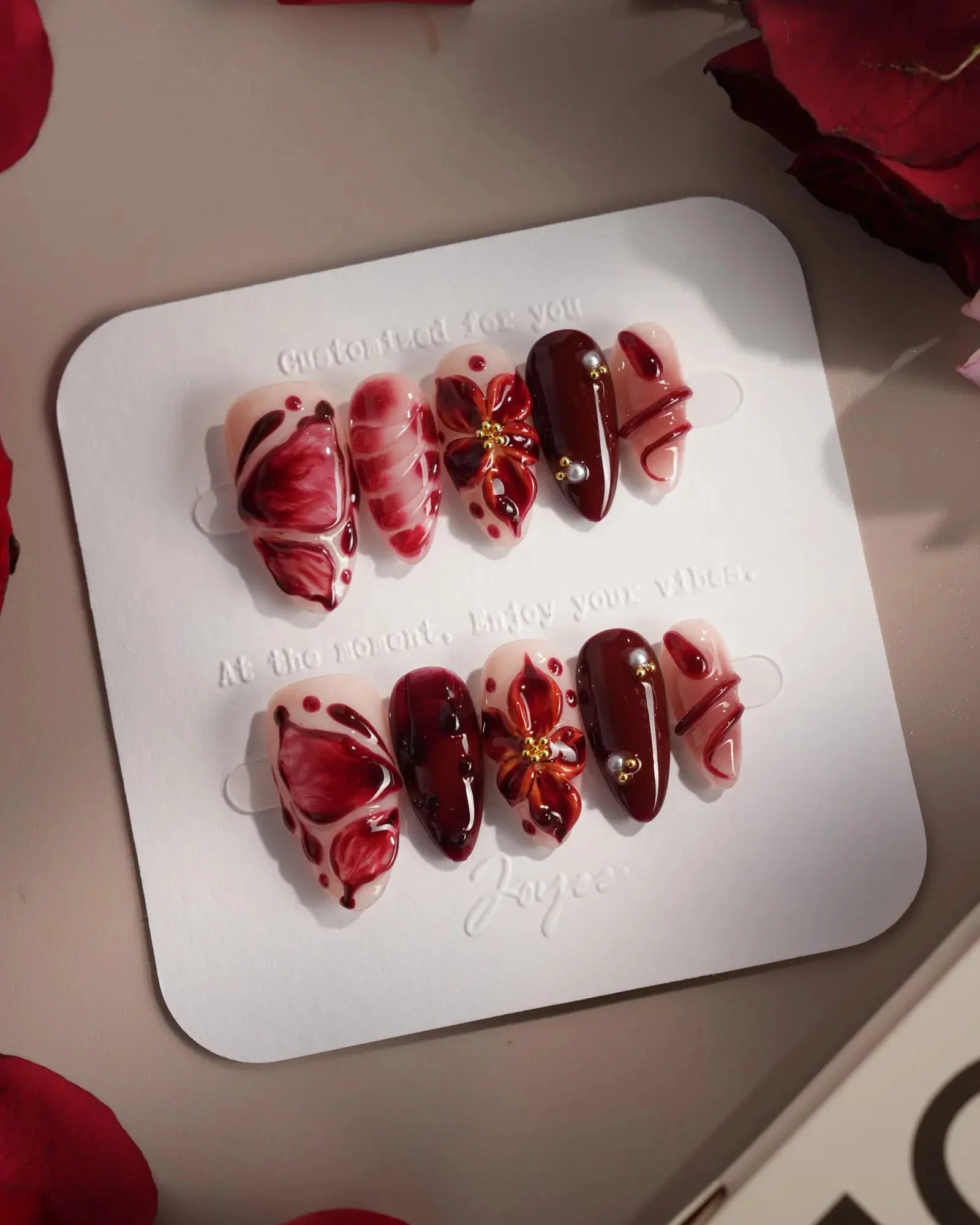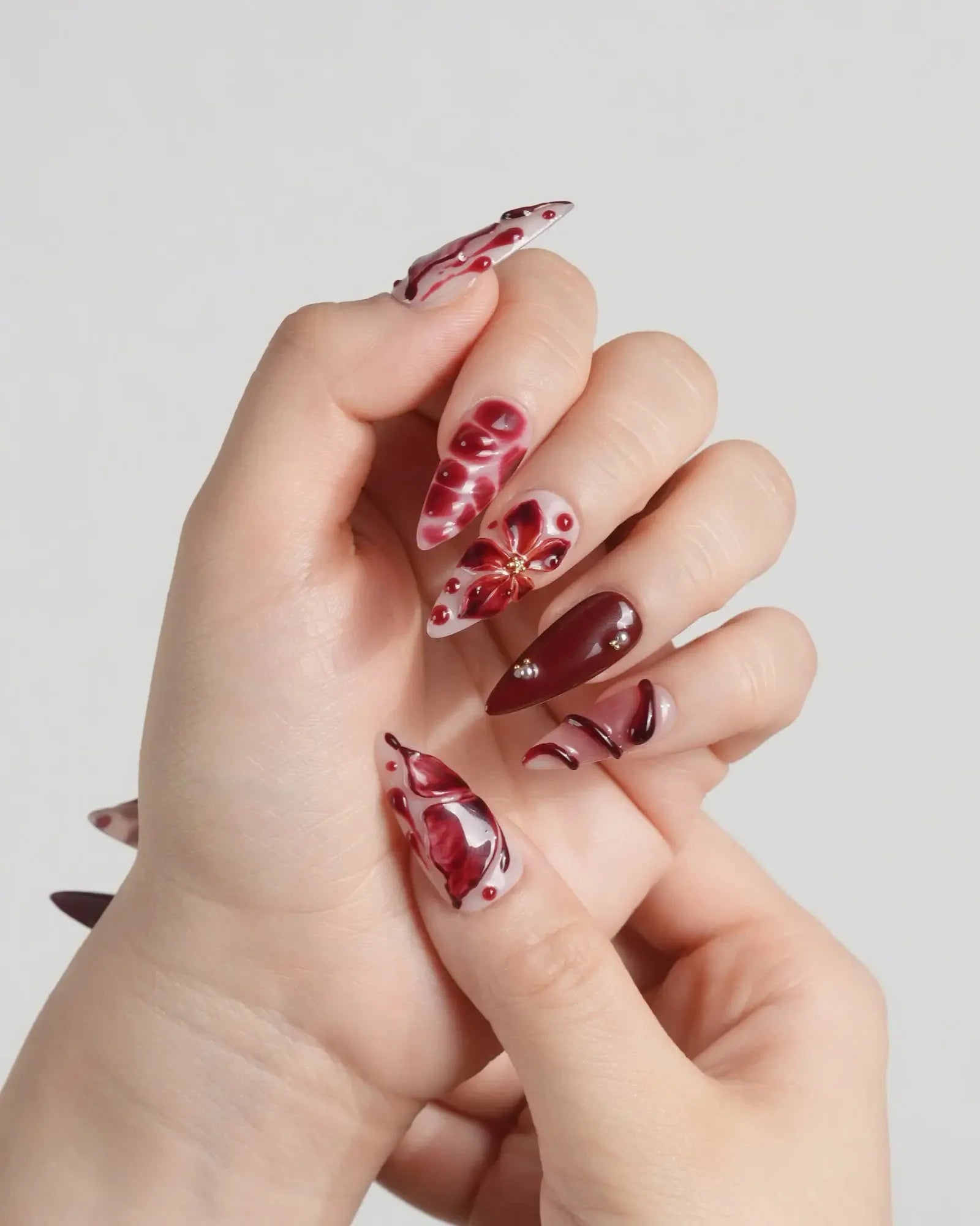 A nude base splashed with crimson: blood-red butterflies, roses, serpents, and dripping accents. Horror softened into allure, each detail a wickedly elegant touch.
