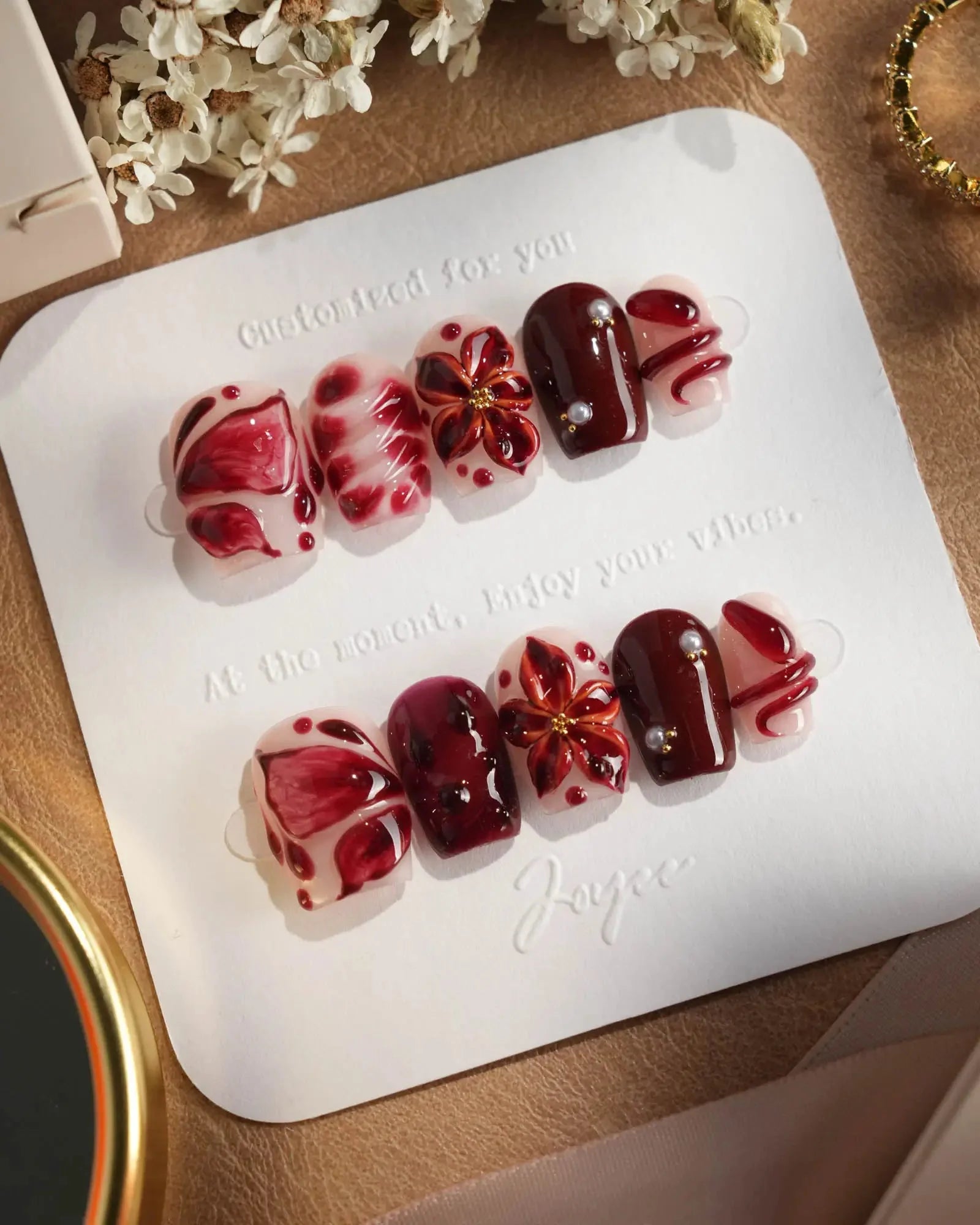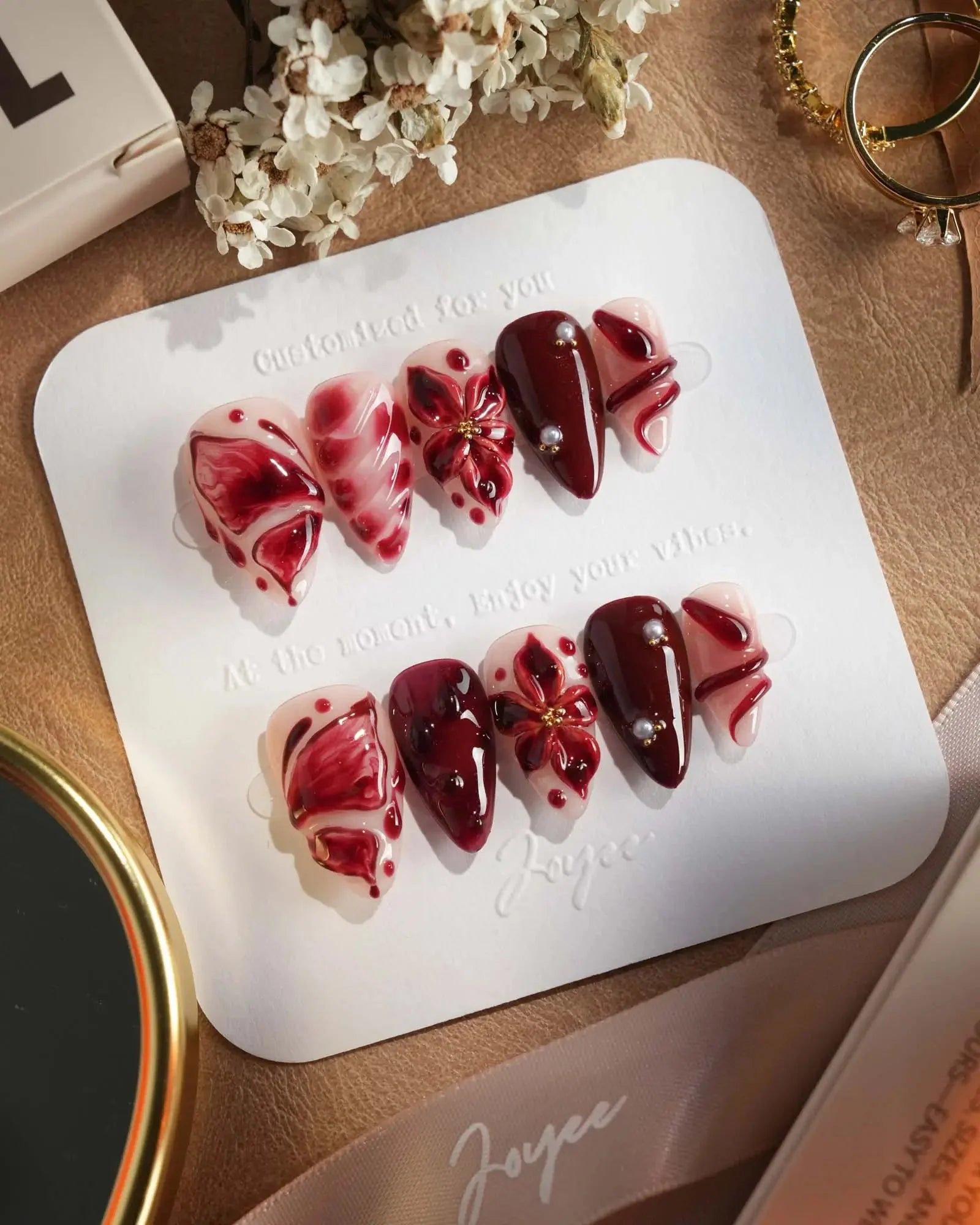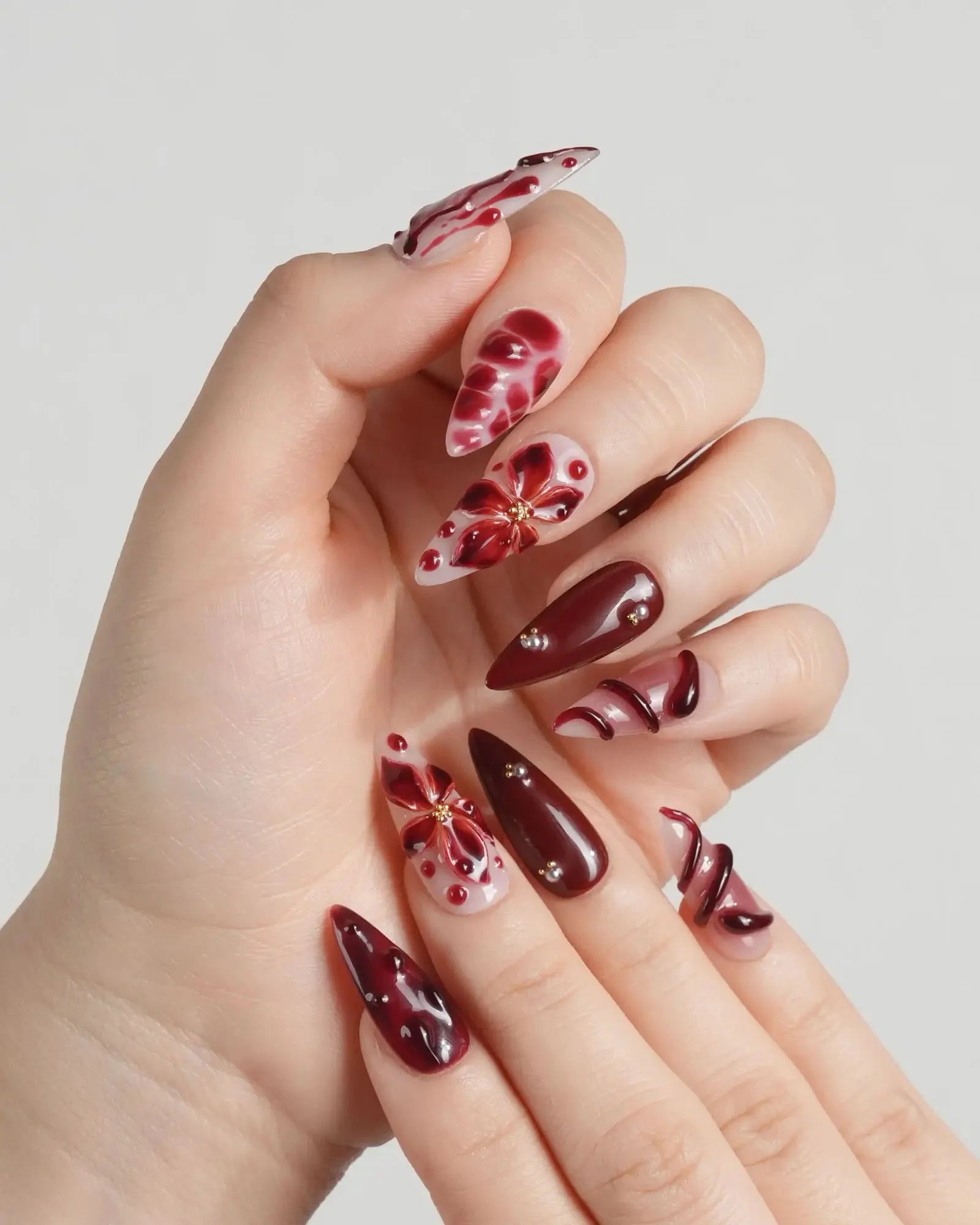 A nude base splashed with crimson: blood-red butterflies, roses, serpents, and dripping accents. Horror softened into allure, each detail a wickedly elegant touch.