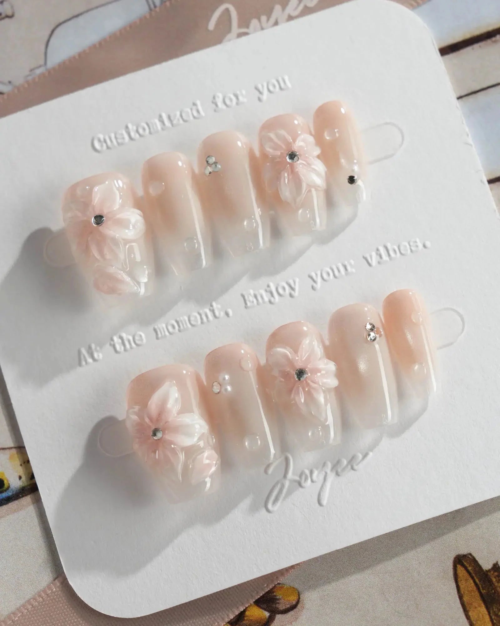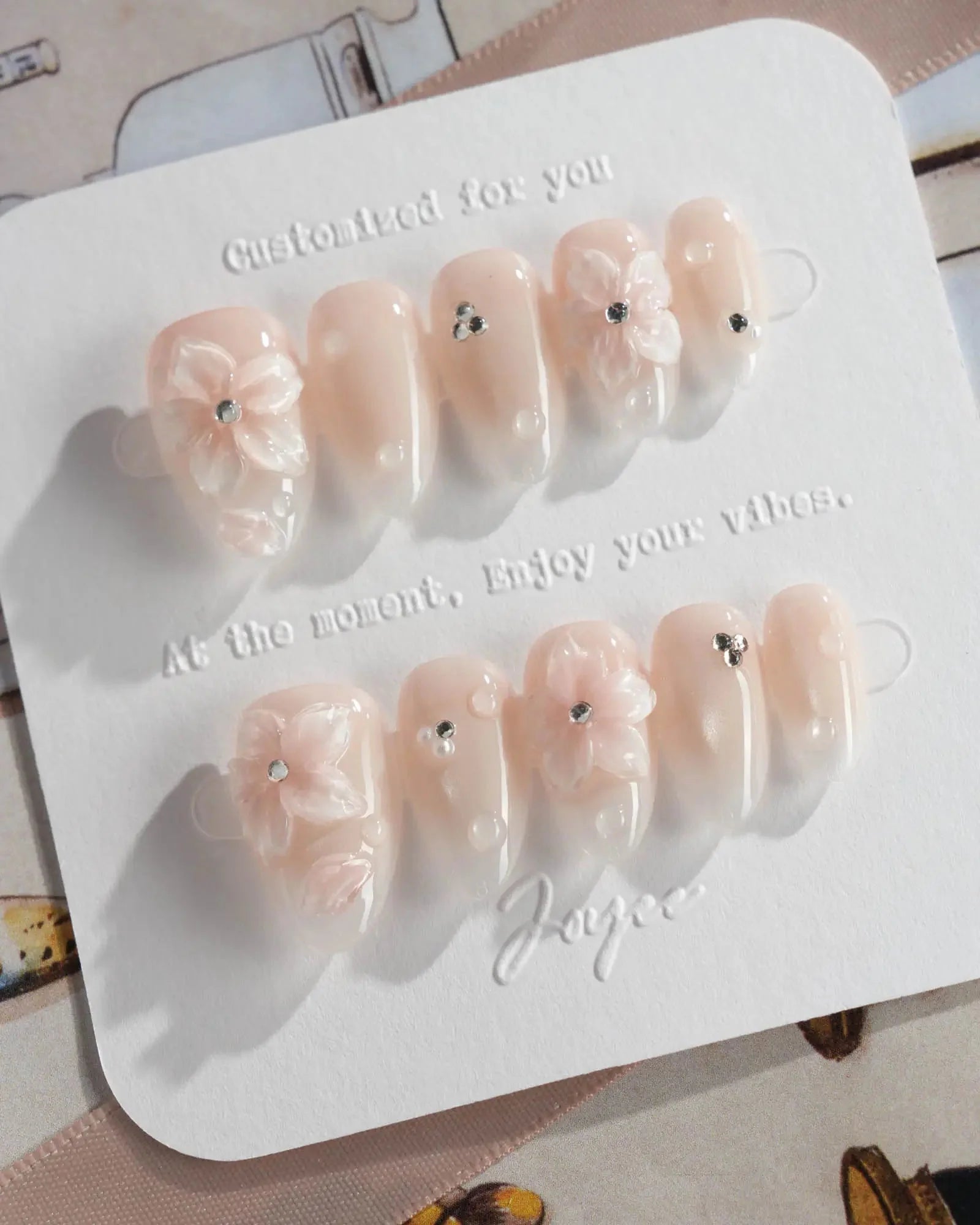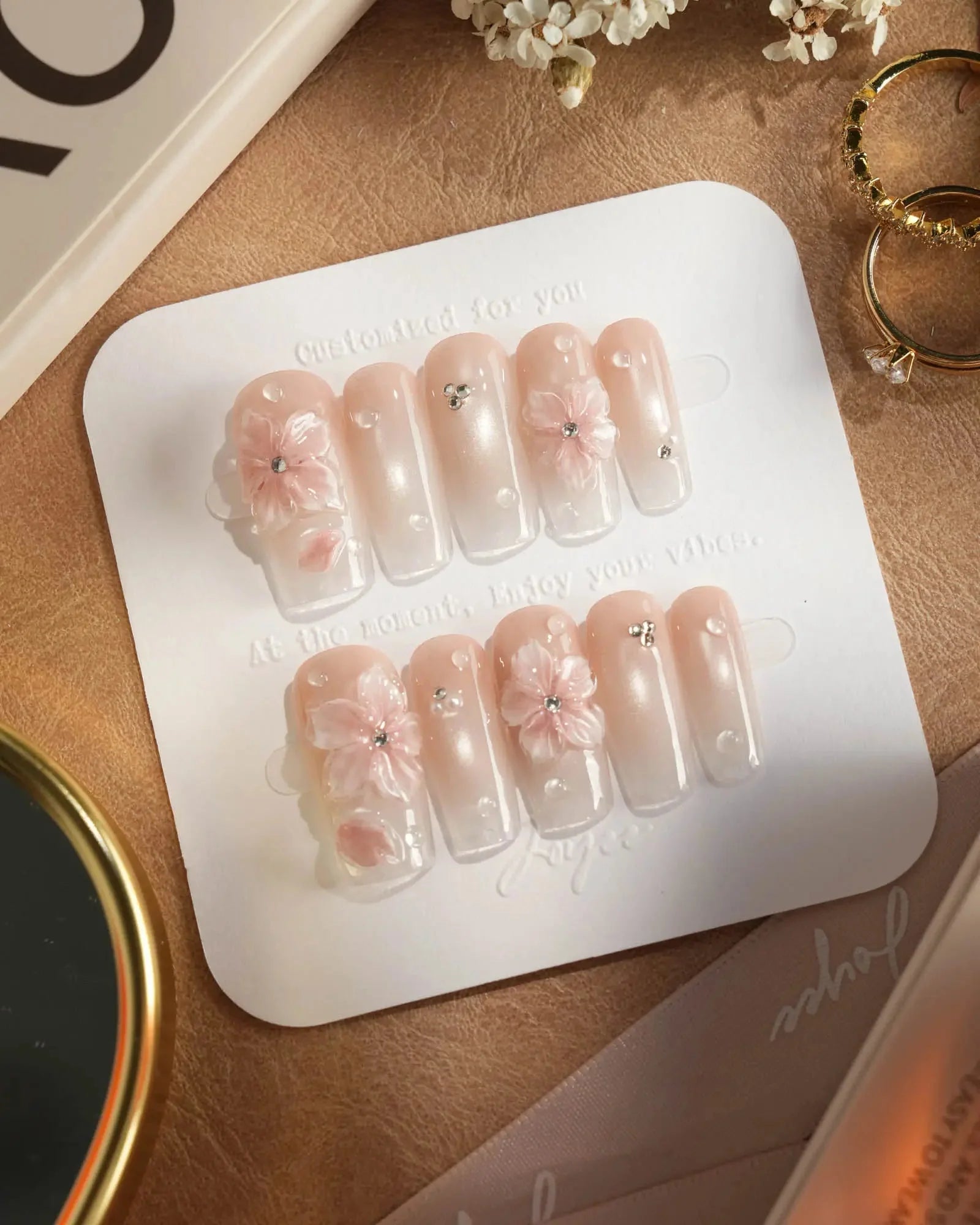 Like a just-melted pink ice slush, this set layers soft cat-eye shimmer, clear floral accents, and sparkling droplets. A subtle standout with white shirts, summer dresses, or clean girl aesthetics.