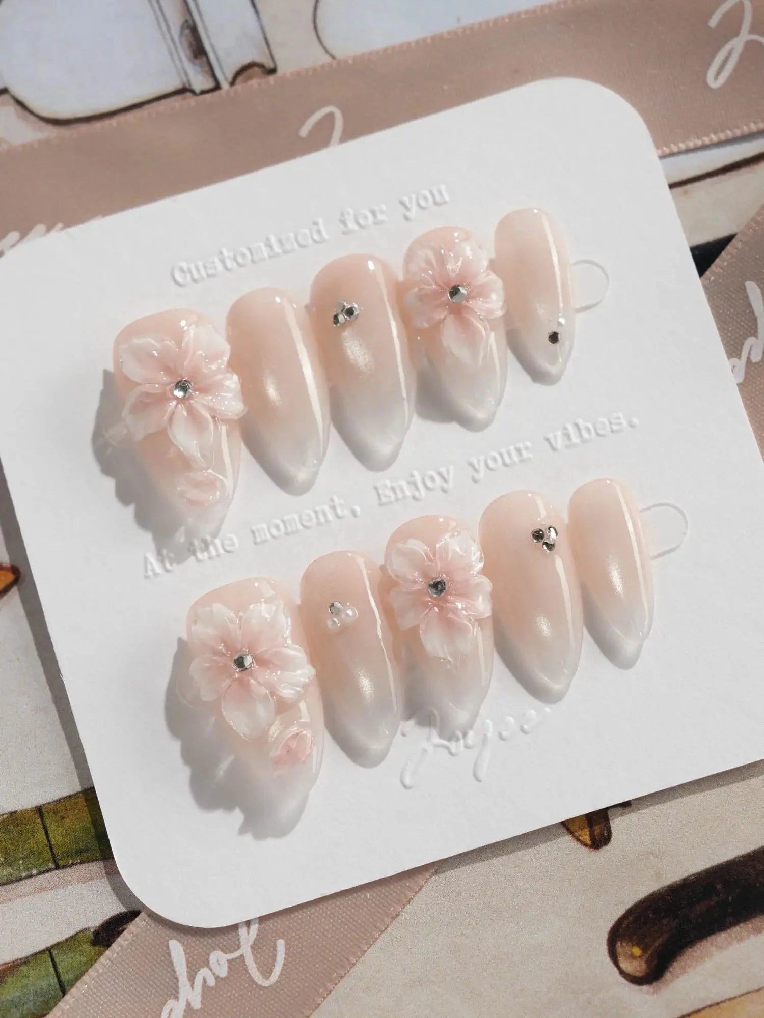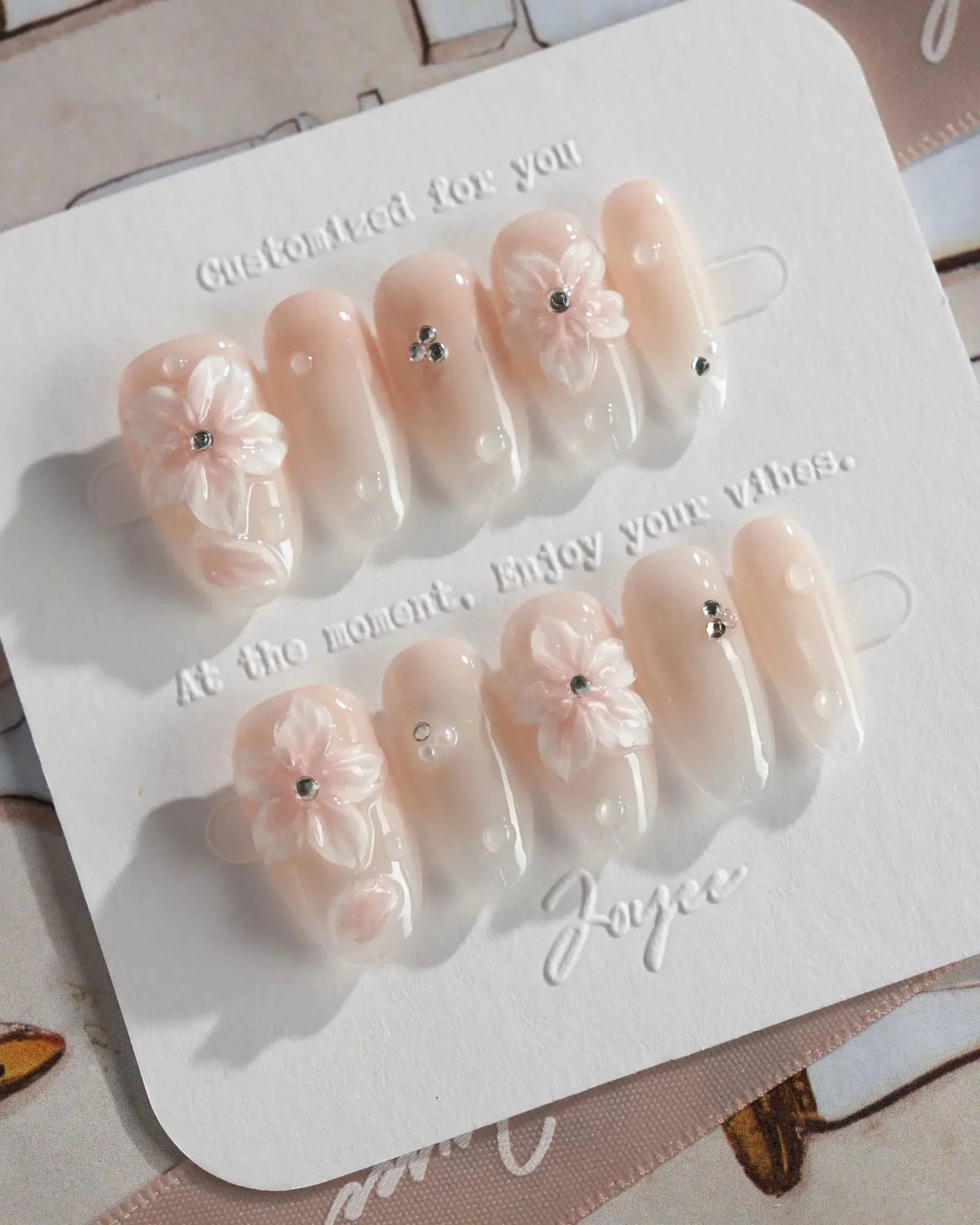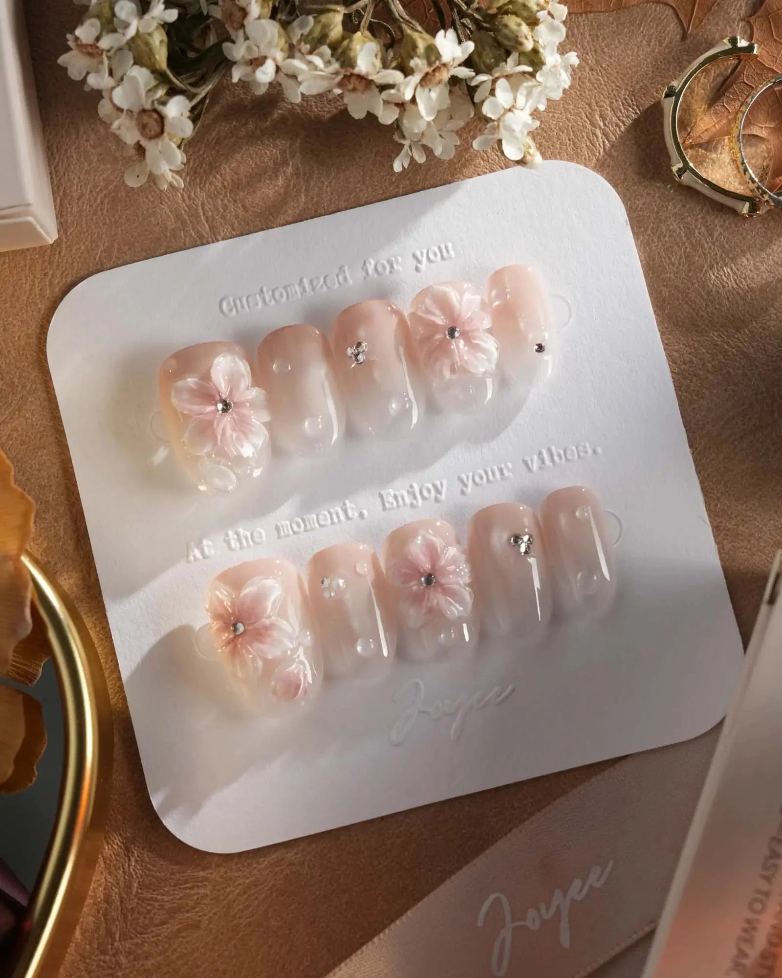 Like a just-melted pink ice slush, this set layers soft cat-eye shimmer, clear floral accents, and sparkling droplets. A subtle standout with white shirts, summer dresses, or clean girl aesthetics.