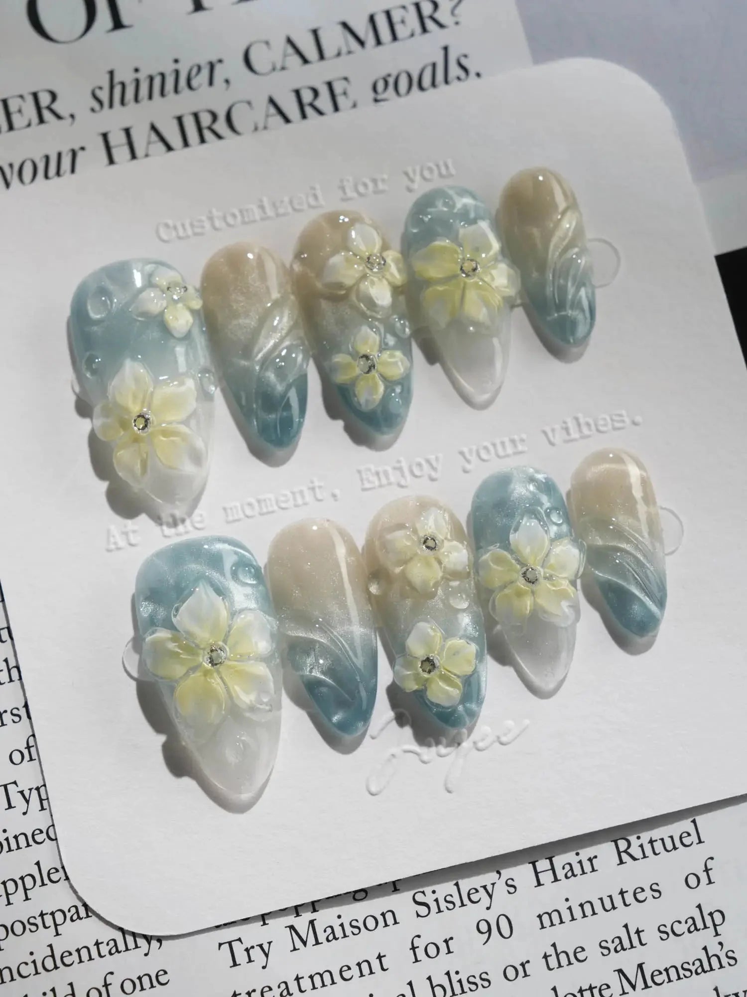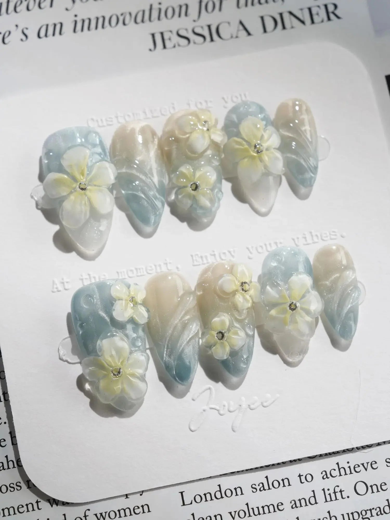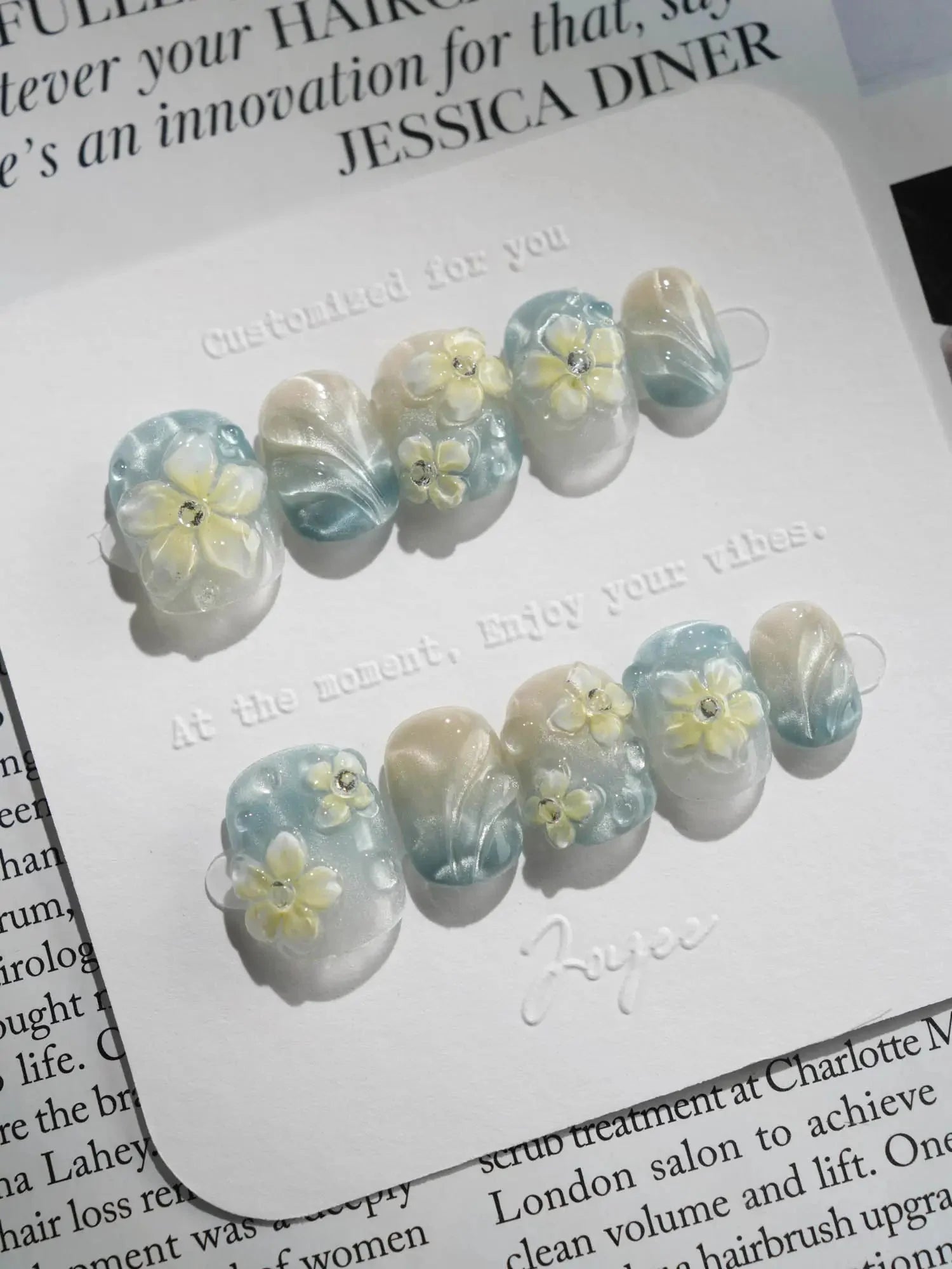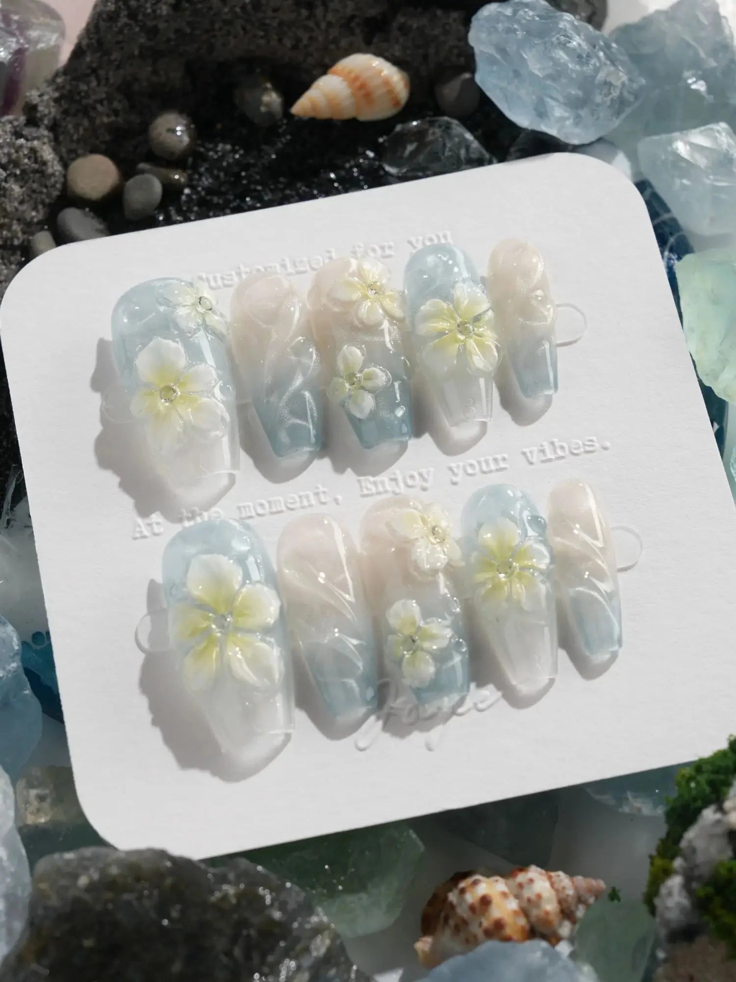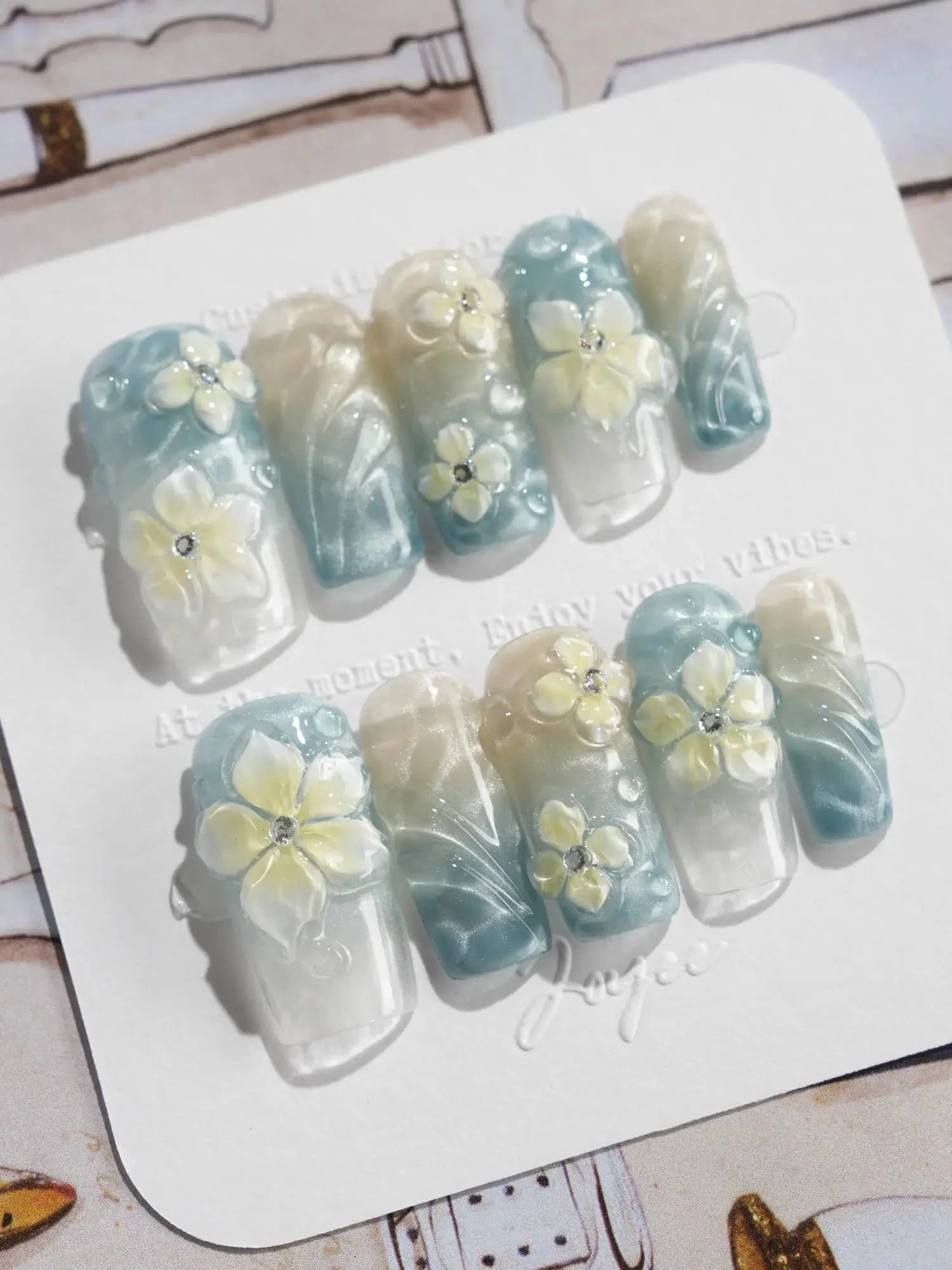 This set captures the breeze of Bora Bora with soft blue cat-eye shimmer that mimics gentle ocean waves. Each nail features sculpted plumeria blossoms in white and pastel yellow, offering a lifelike floral contrast. The curved light flow across the surface mirrors the movement of water, creating a serene yet luminous island-inspired design.