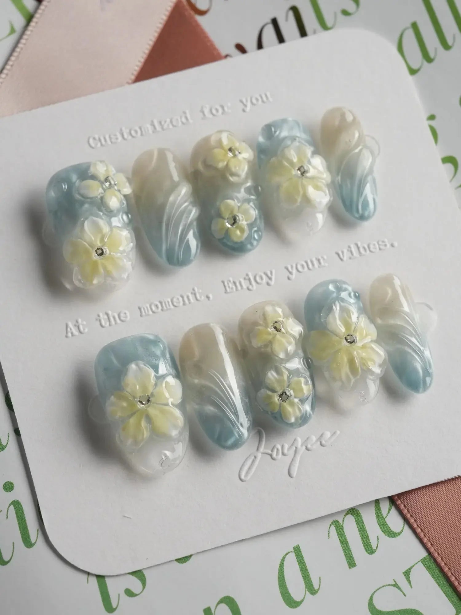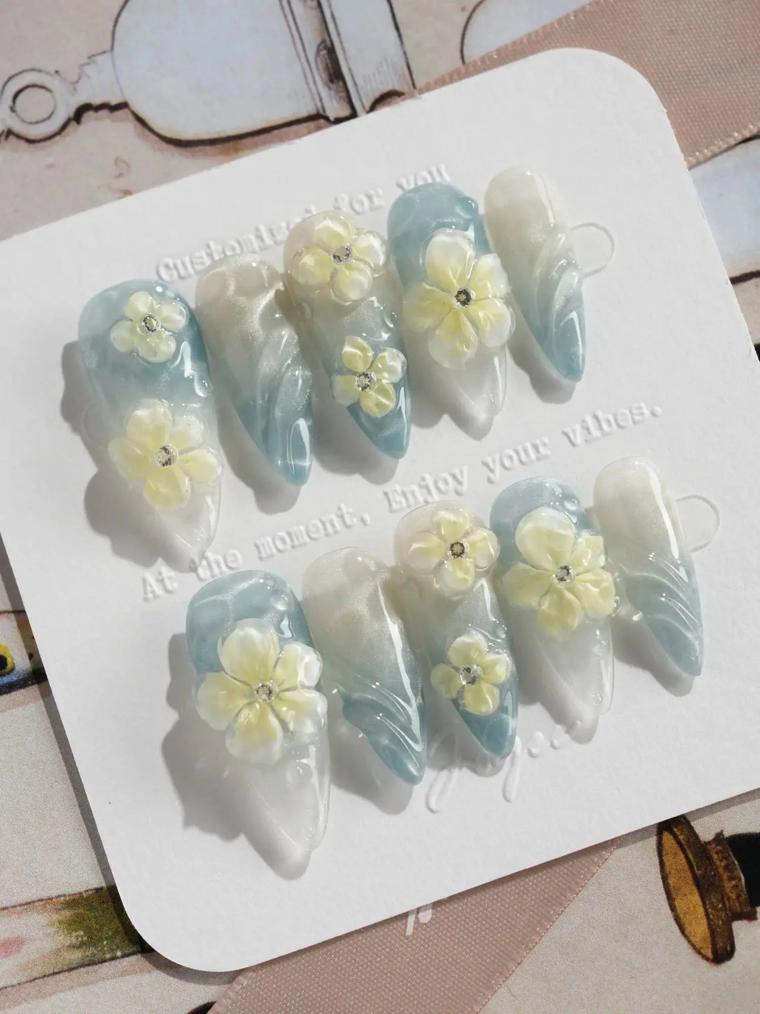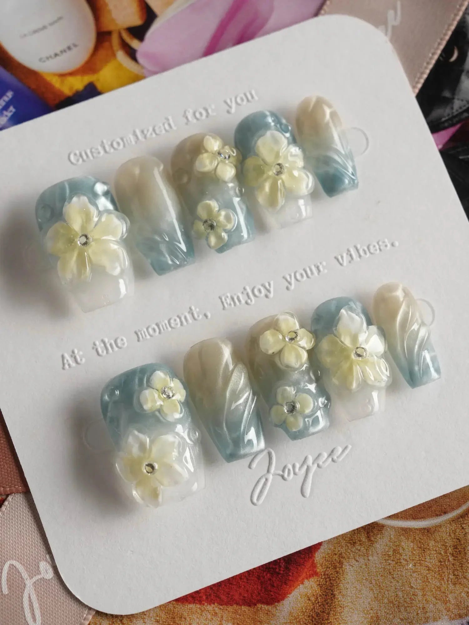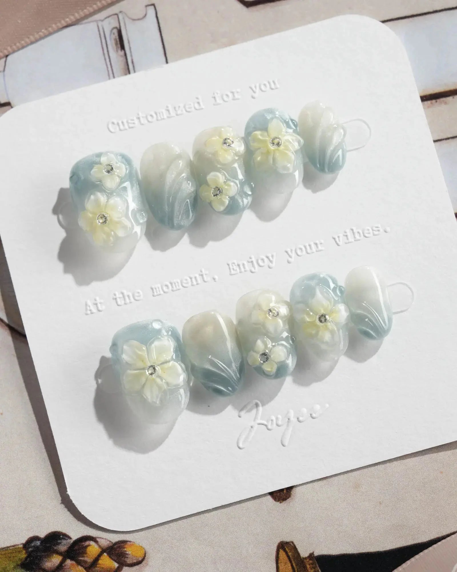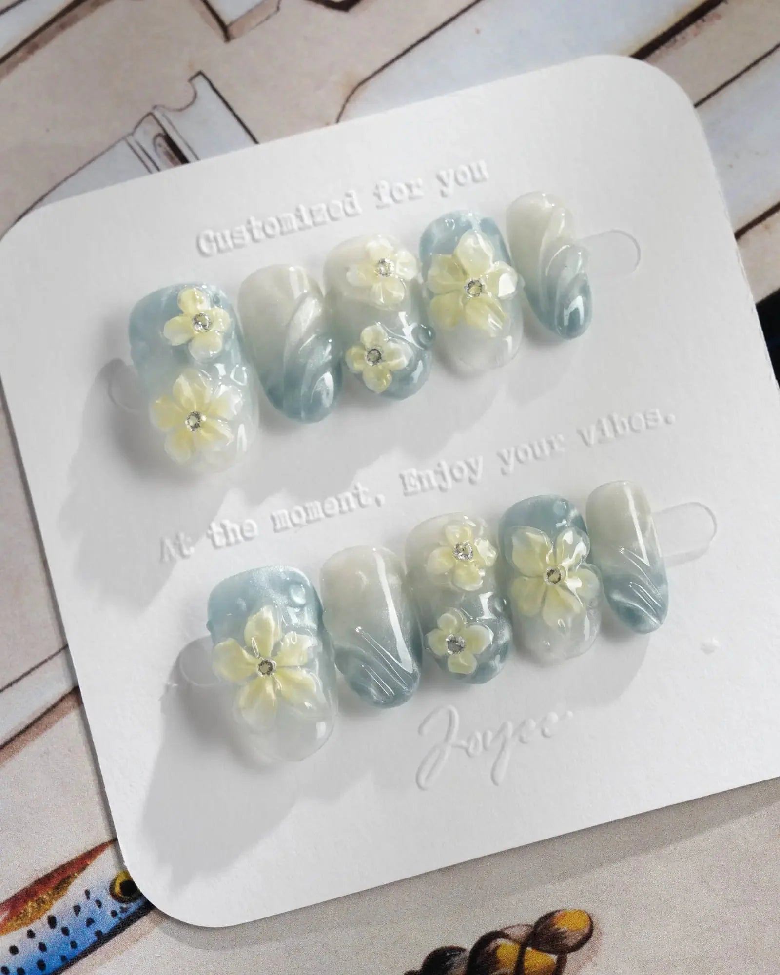 This set captures the breeze of Bora Bora with soft blue cat-eye shimmer that mimics gentle ocean waves. Each nail features sculpted plumeria blossoms in white and pastel yellow, offering a lifelike floral contrast. The curved light flow across the surface mirrors the movement of water, creating a serene yet luminous island-inspired design.