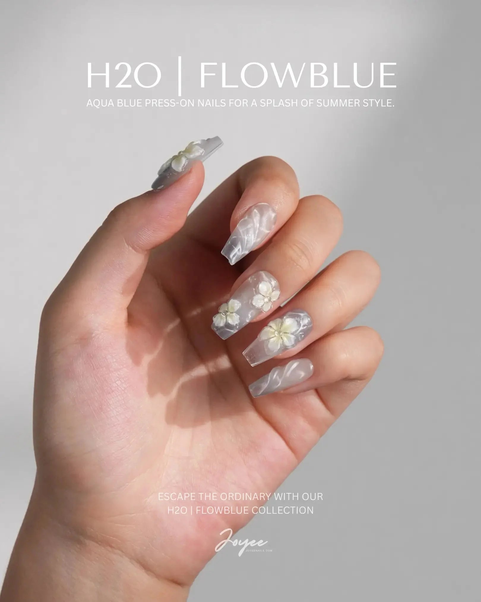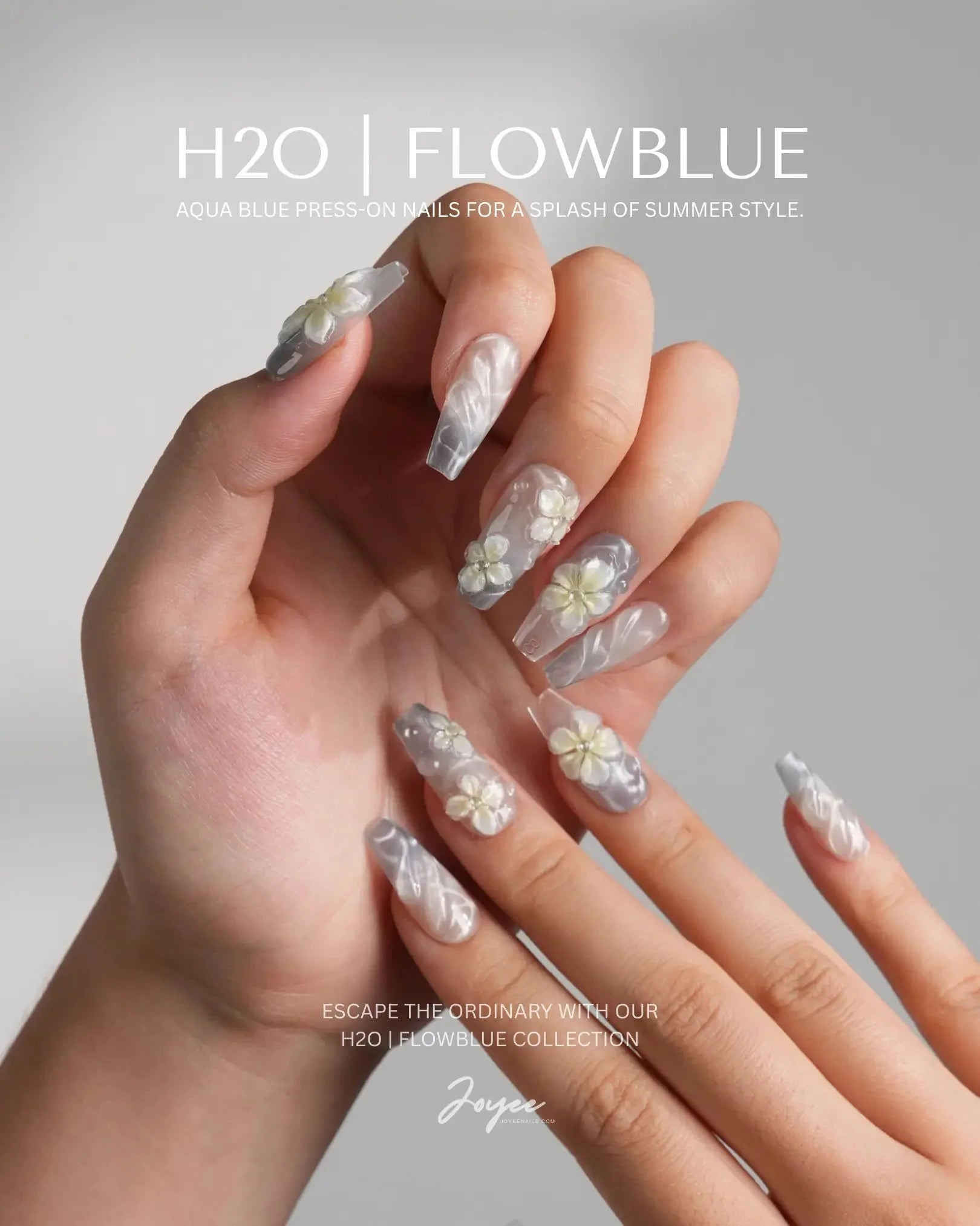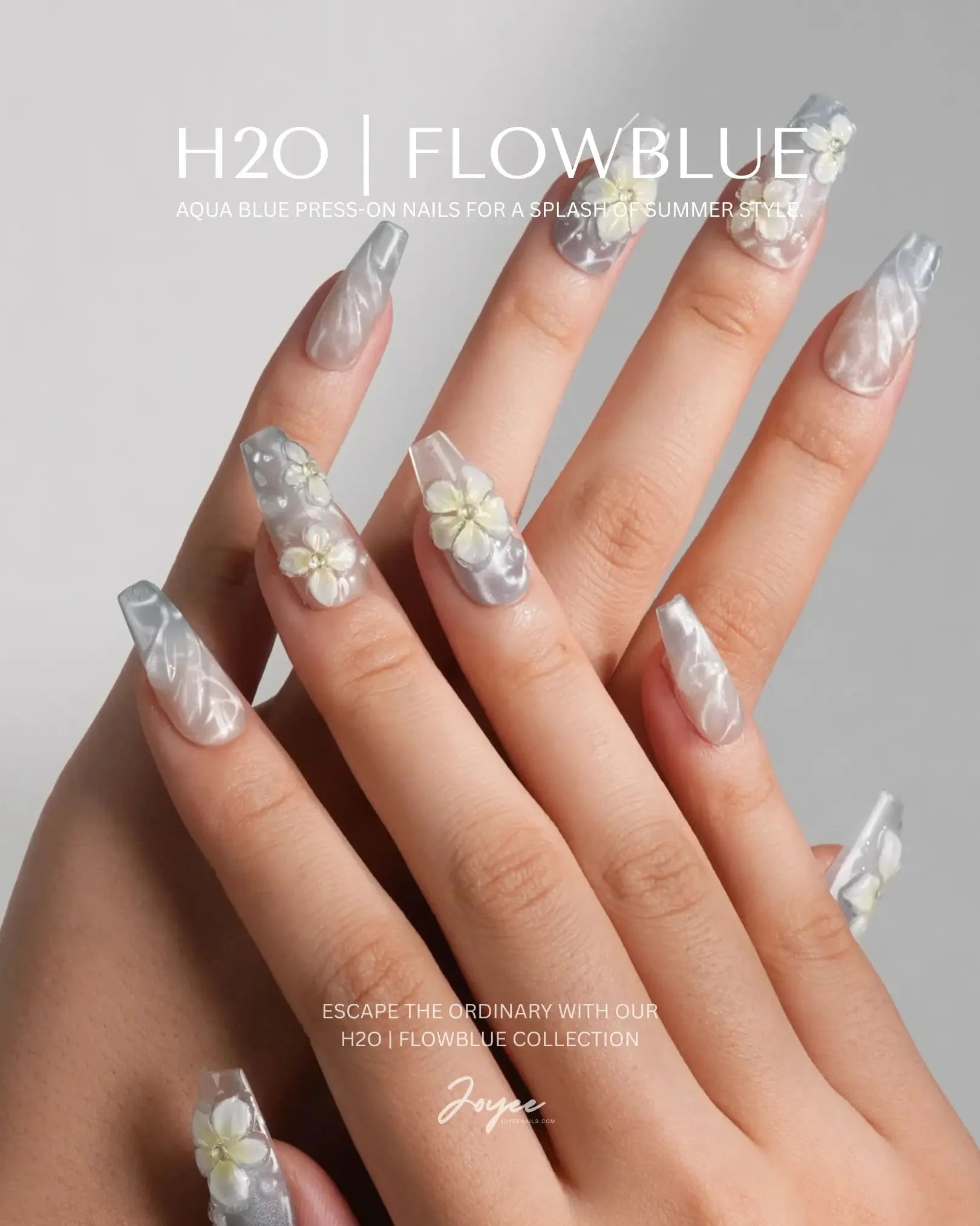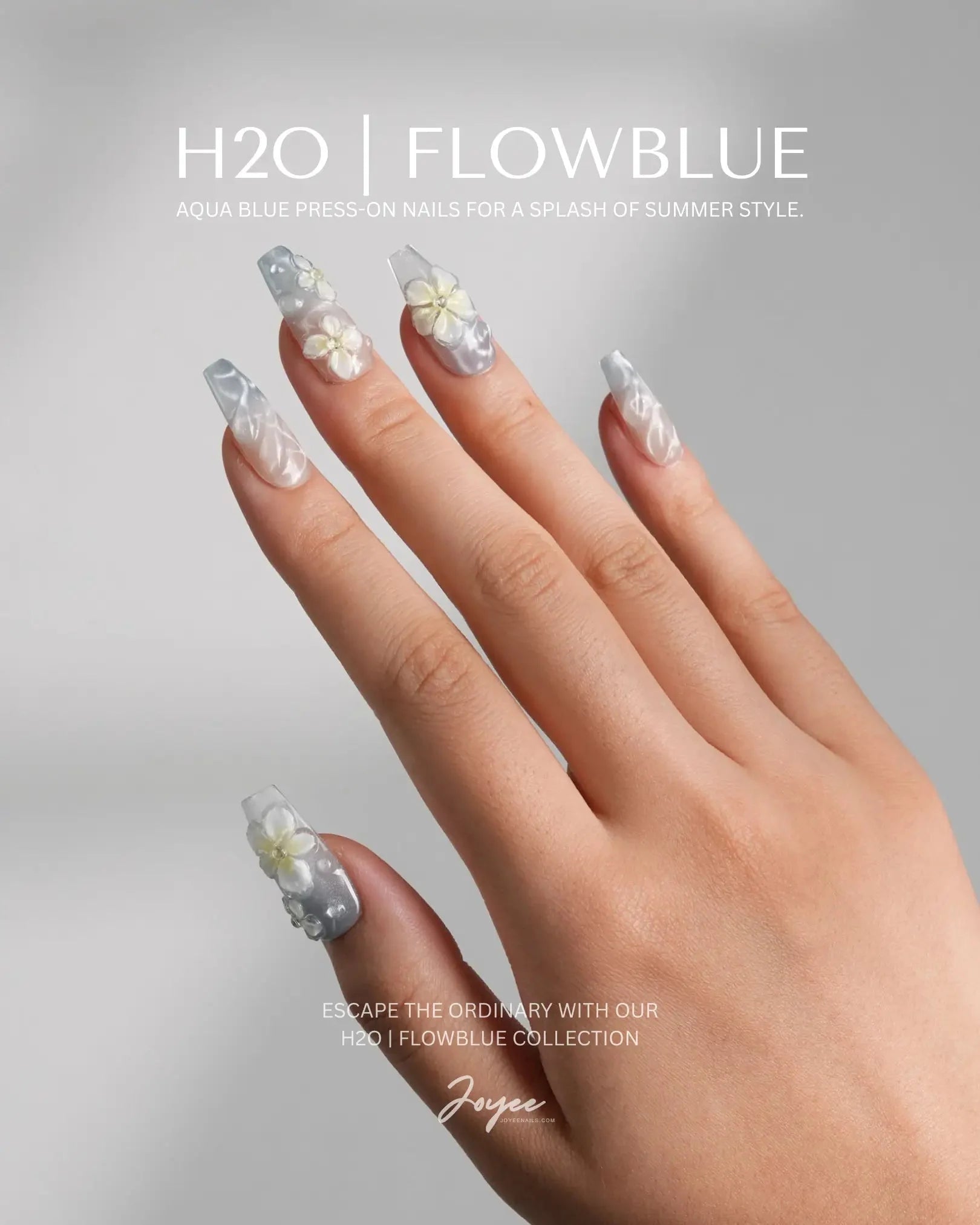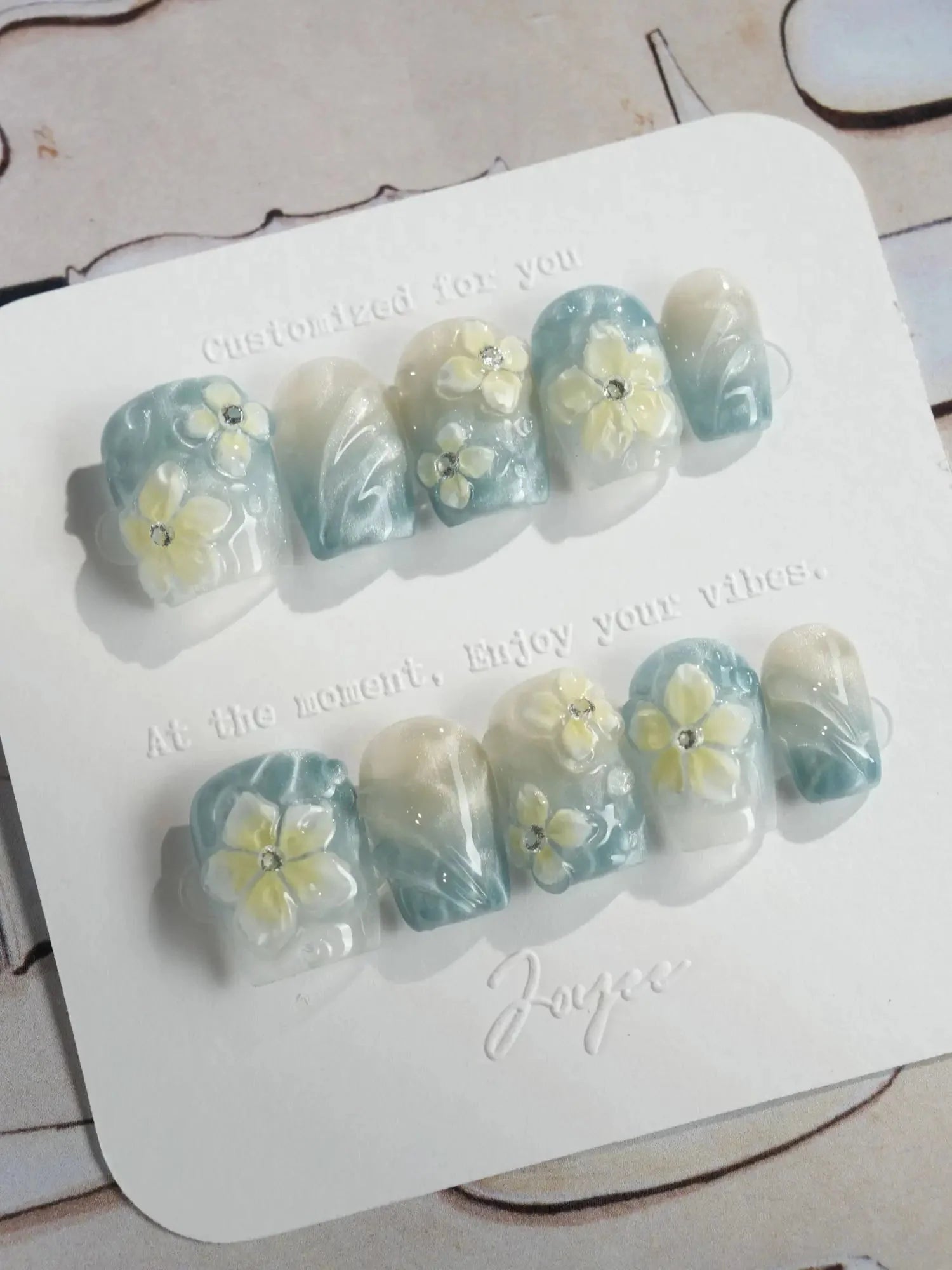 This set captures the breeze of Bora Bora with soft blue cat-eye shimmer that mimics gentle ocean waves. Each nail features sculpted plumeria blossoms in white and pastel yellow, offering a lifelike floral contrast. The curved light flow across the surface mirrors the movement of water, creating a serene yet luminous island-inspired design.
