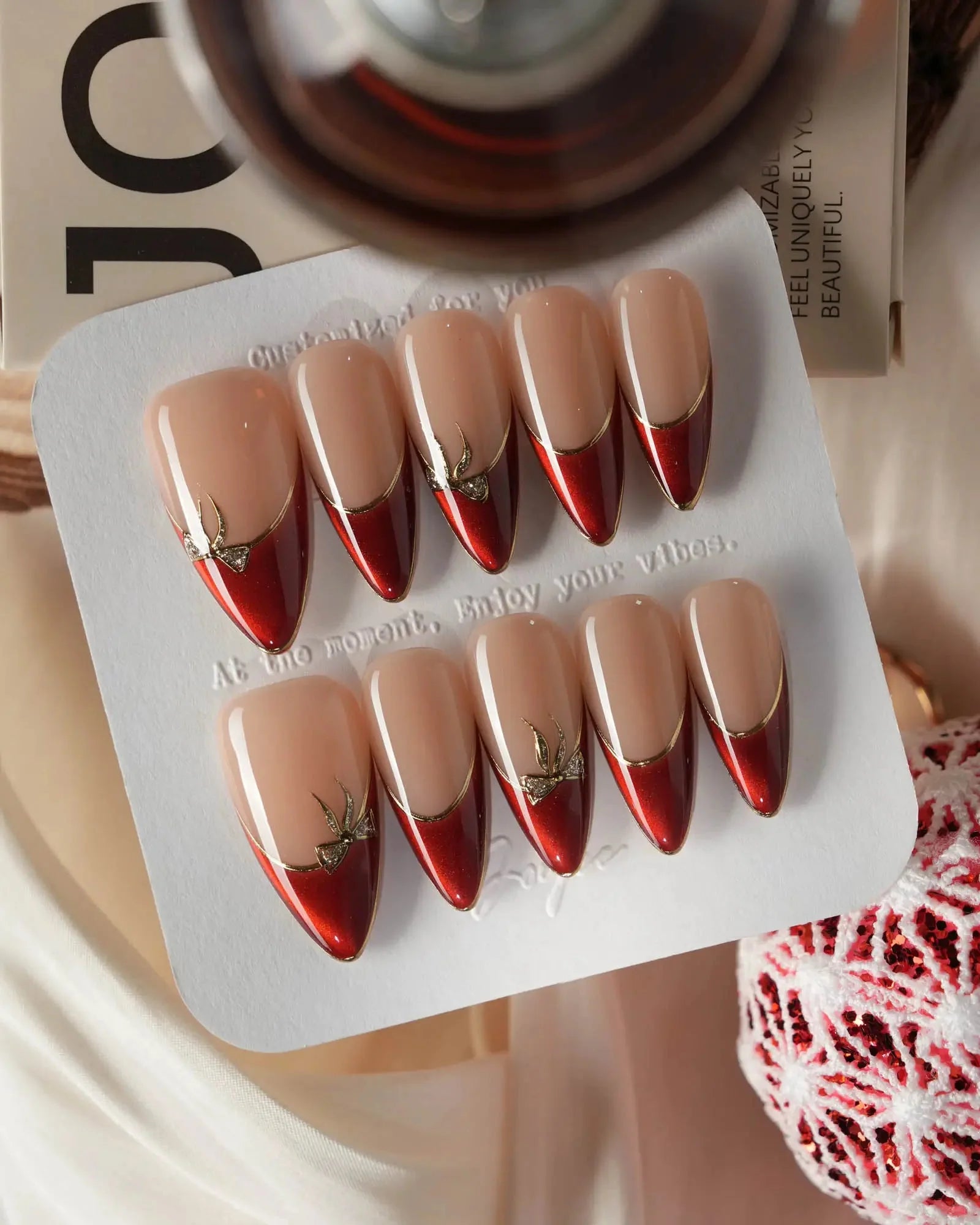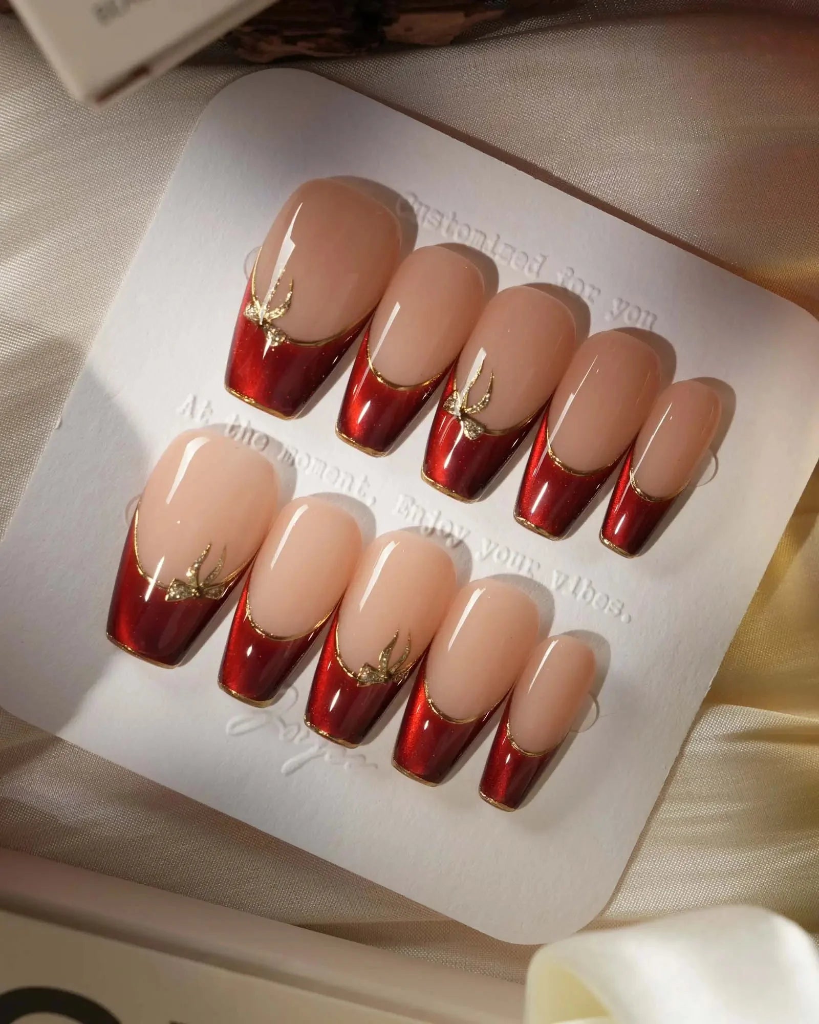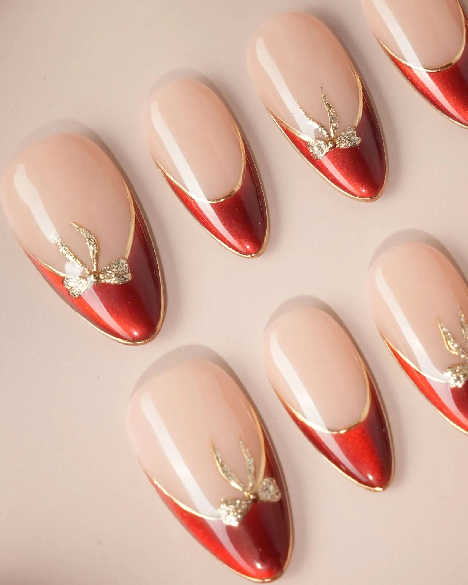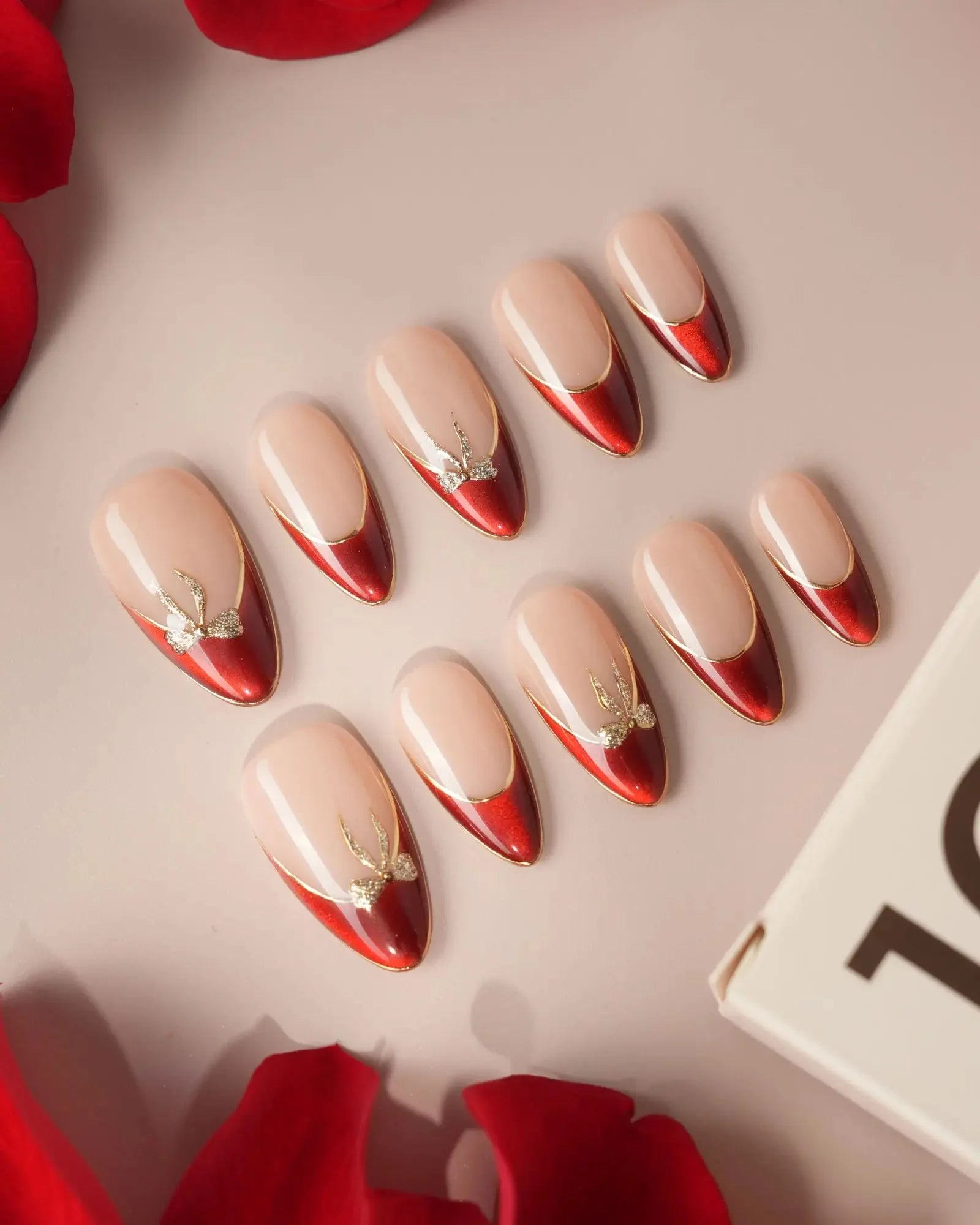 These red French tip press-on nails feature a golden outline and mini bow details that add just the right touch of sparkle. The cat-eye finish and glossy nude base bring a refined, festive elegance—perfect for holidays, date nights, or any special occasion.