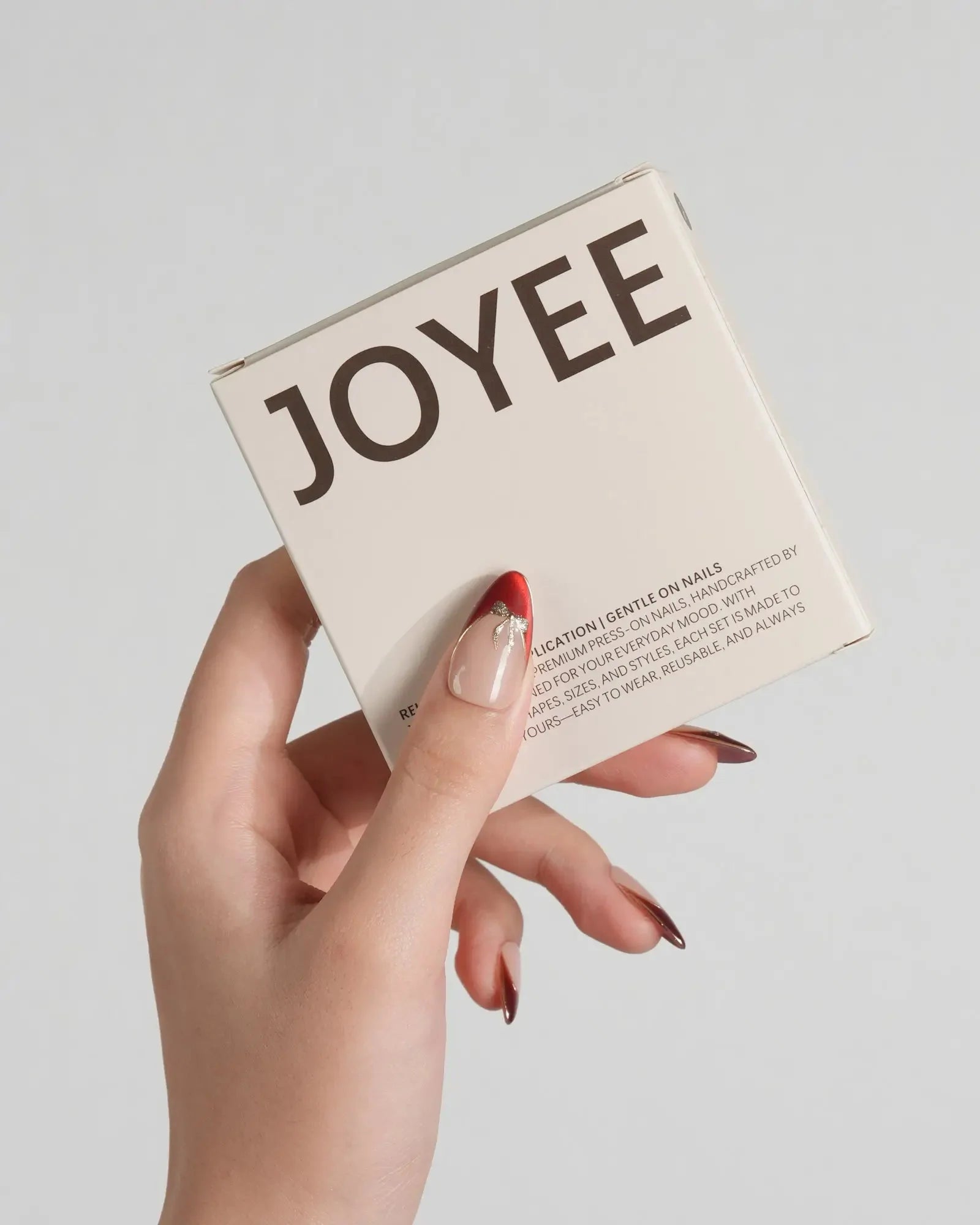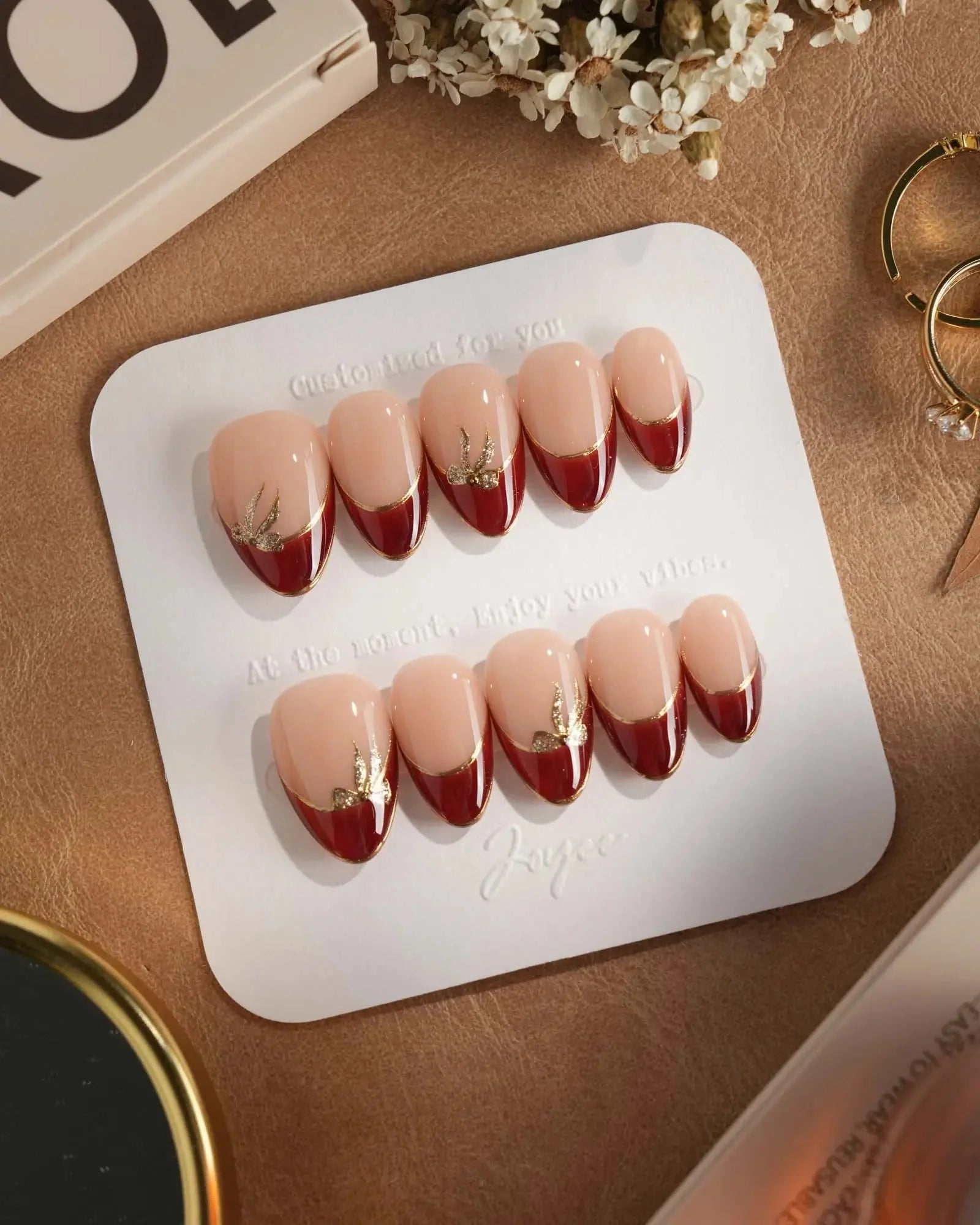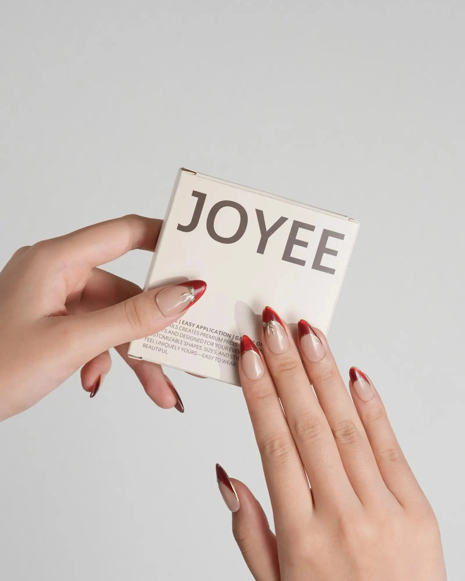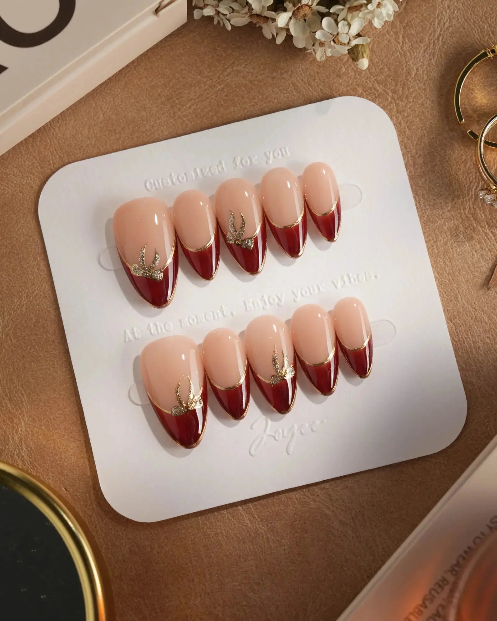 These red French tip press-on nails feature a golden outline and mini bow details that add just the right touch of sparkle. The cat-eye finish and glossy nude base bring a refined, festive elegance—perfect for holidays, date nights, or any special occasion.