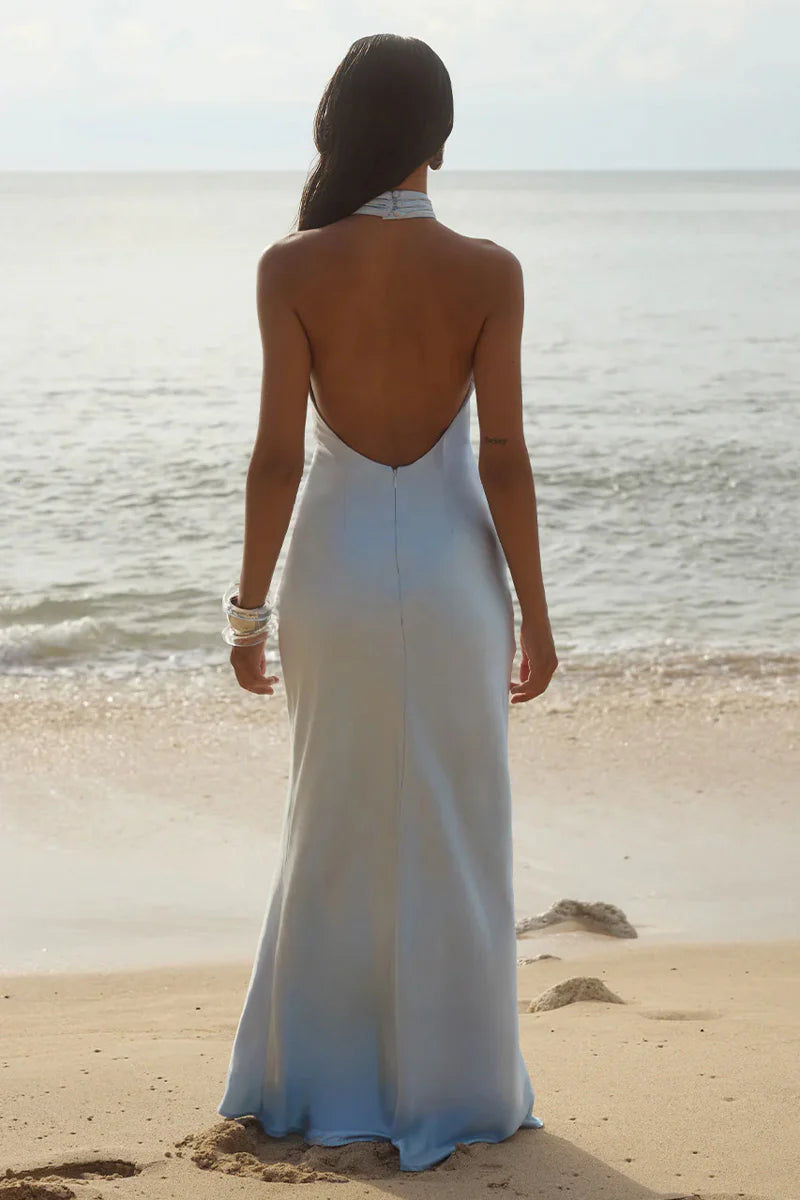 Always be RSVP-ready in the Brigitte Halter Neck Open Back Satin Maxi Dress from Runaway the Label. Featuring a halter neck and low open back, this wedding guest dress drapes over the body for a feminine look. Available in Baby Pink, Baby Blue, Butter Yellow, and Classic Black; style with a pair of chic heels to complete the look!