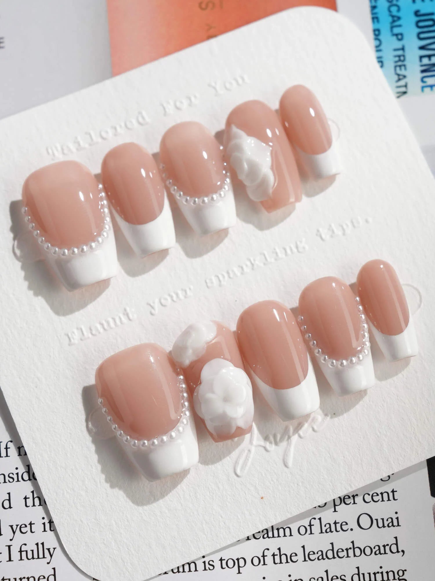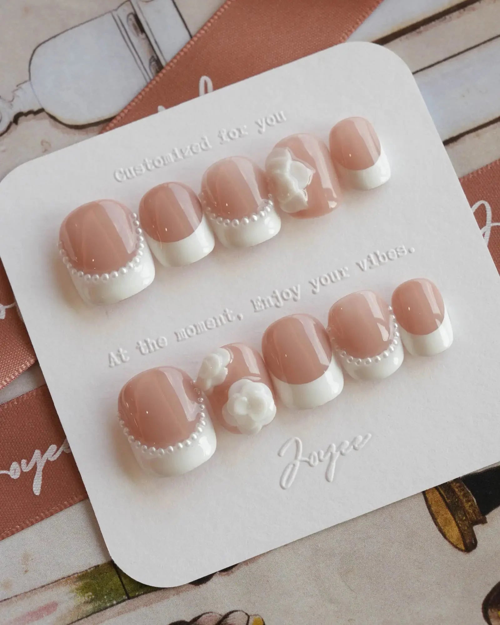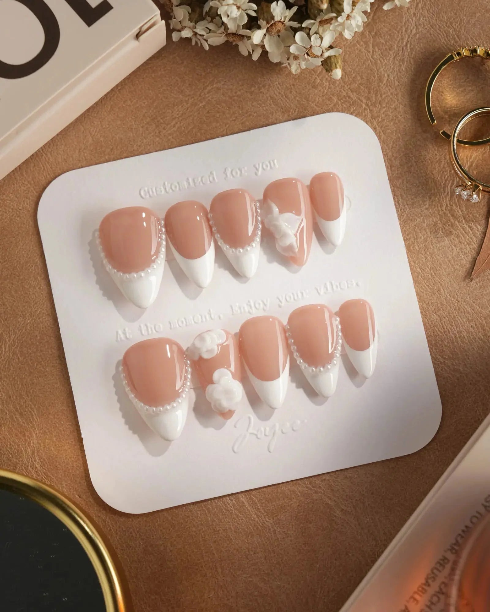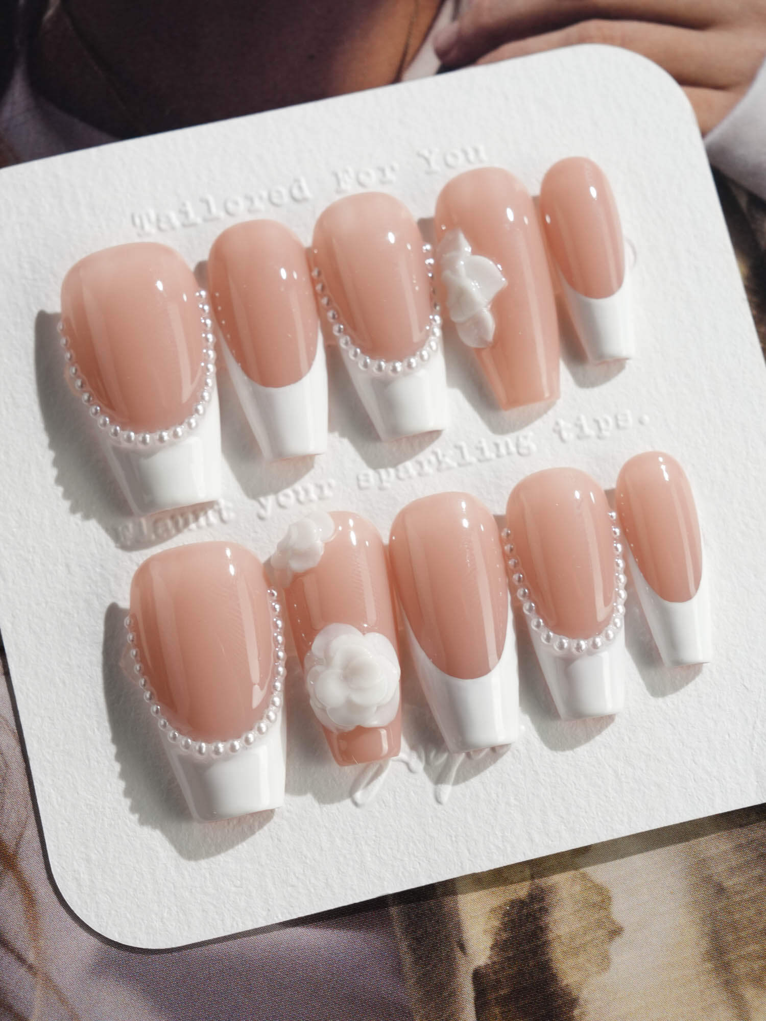 Where timeless French elegance meets sculpted floral beauty. This handmade press-on set pairs a soft nude-pink base with crisp white tips and delicate pearl accents. The highlight? Hand-sculpted camellia blooms that bring refined dimension without overwhelming the look. Perfect for weddings, formal events, or any moment you want to express graceful simplicity with a touch of luxury.