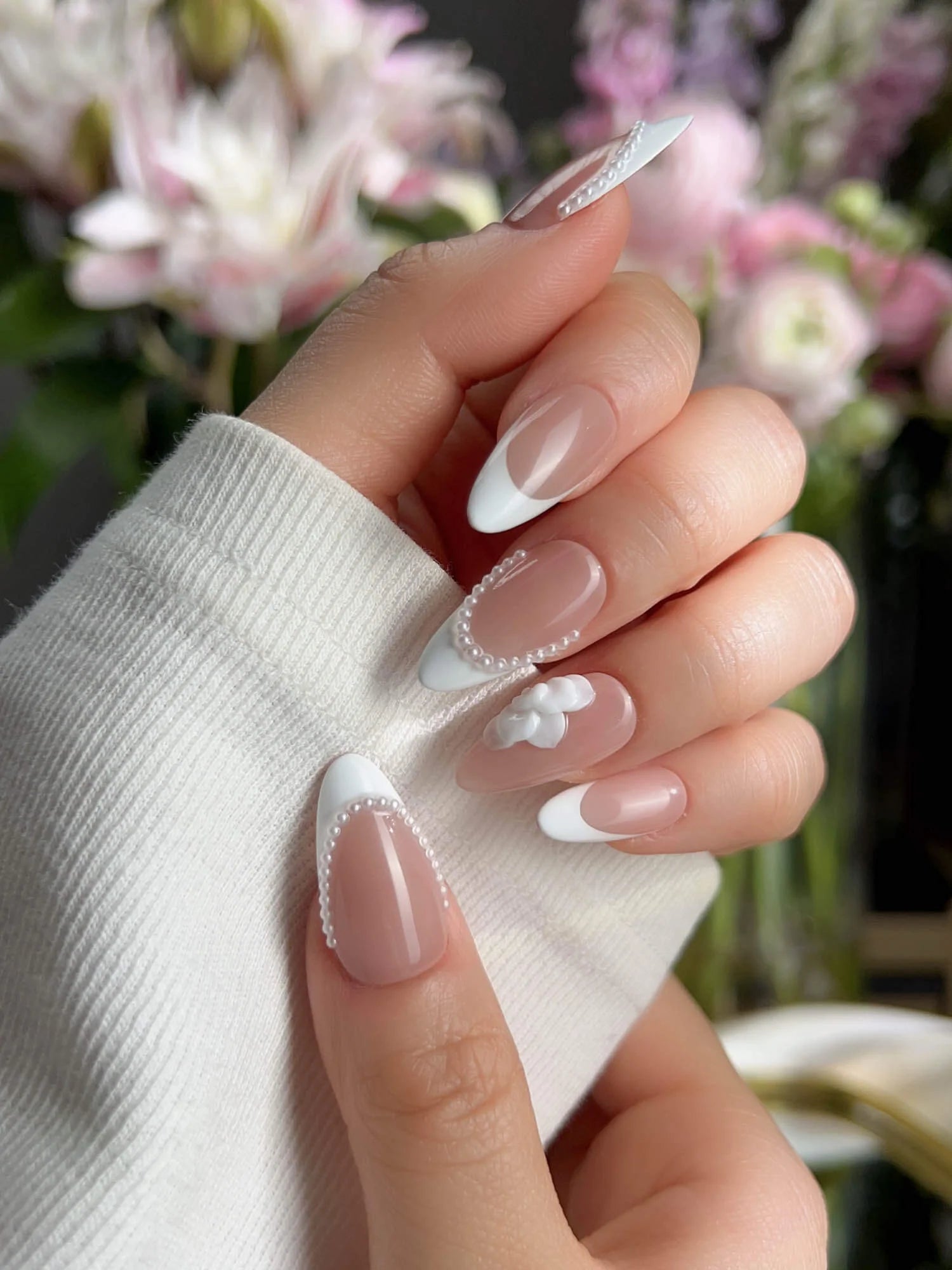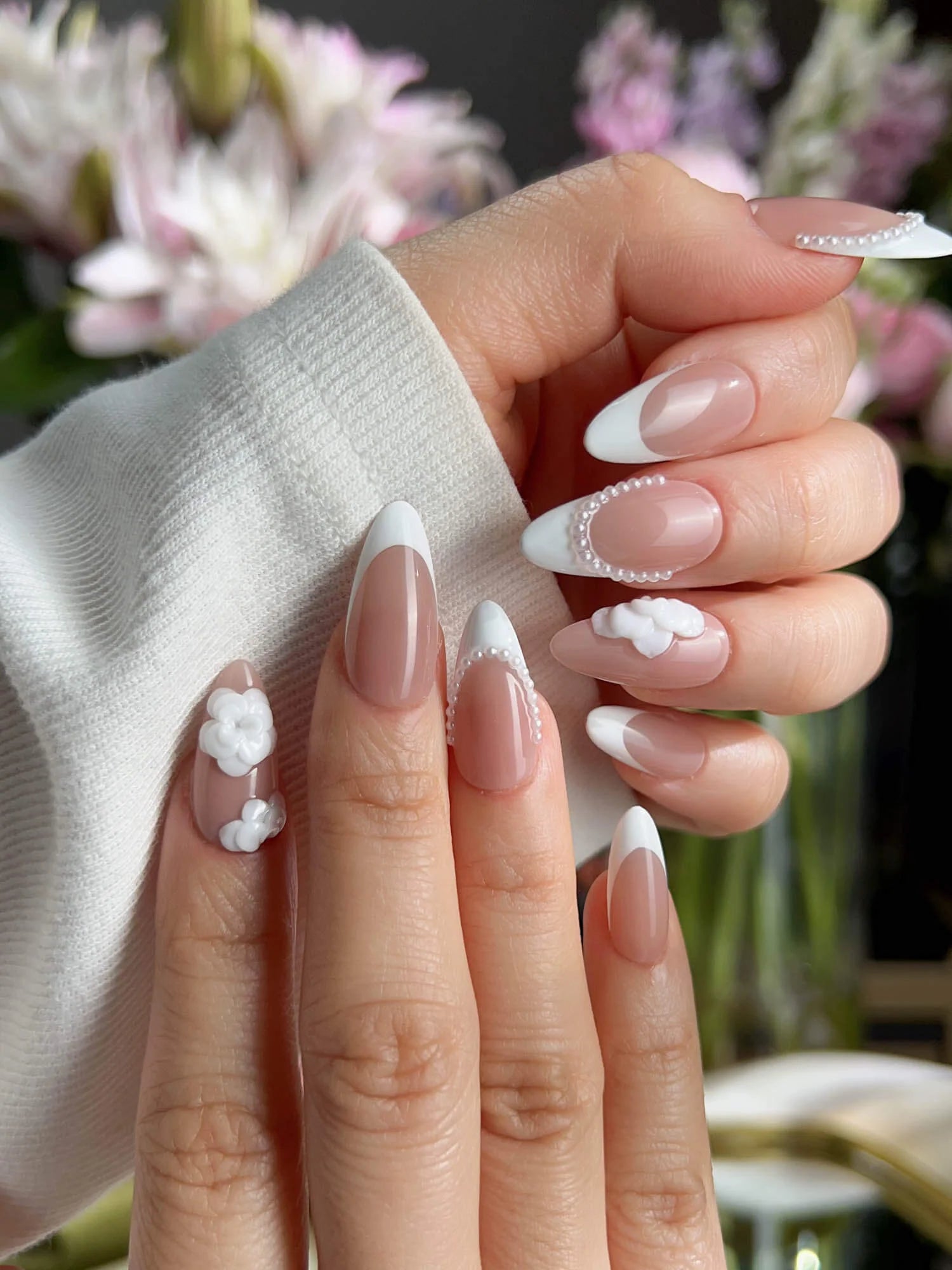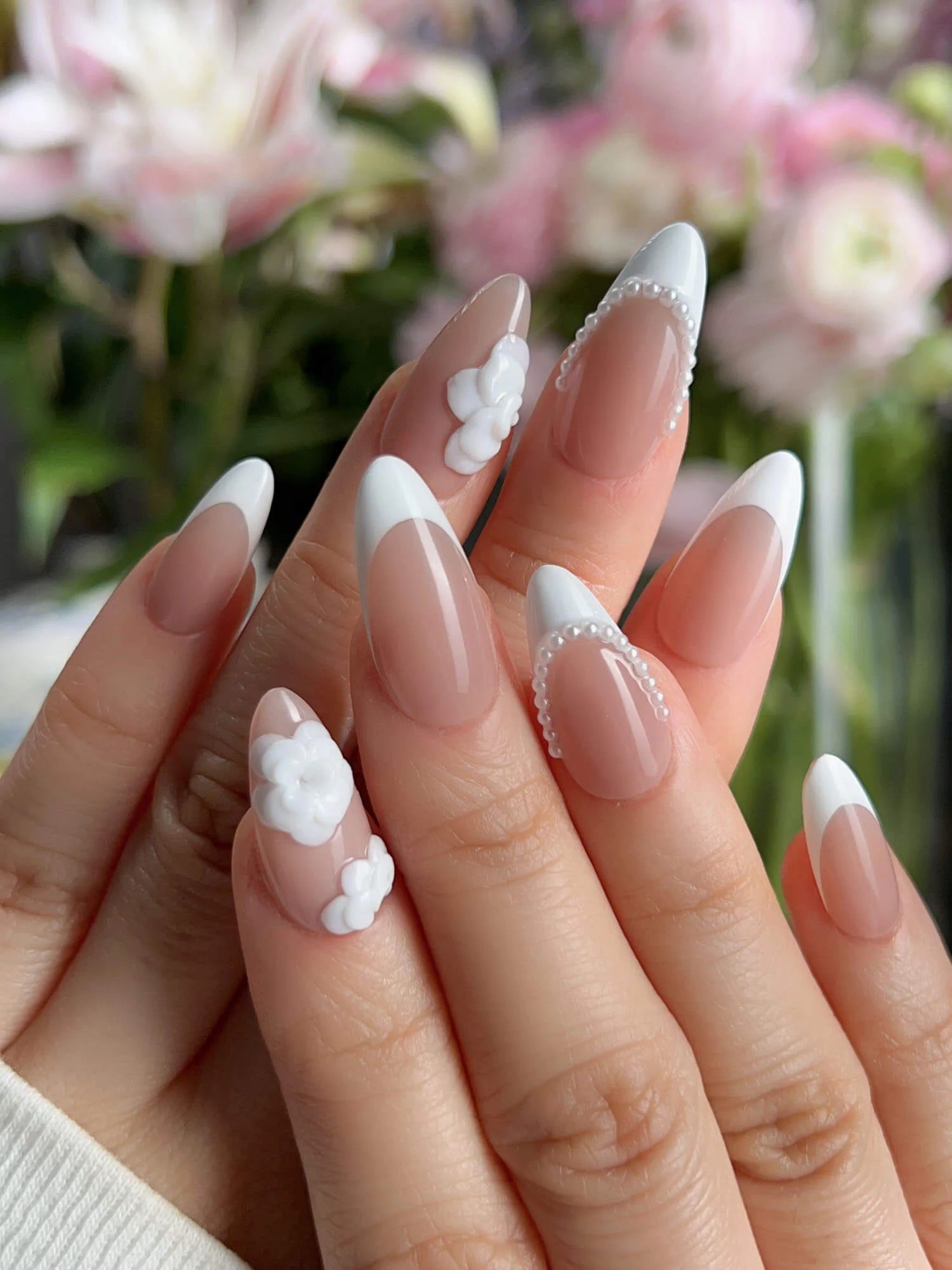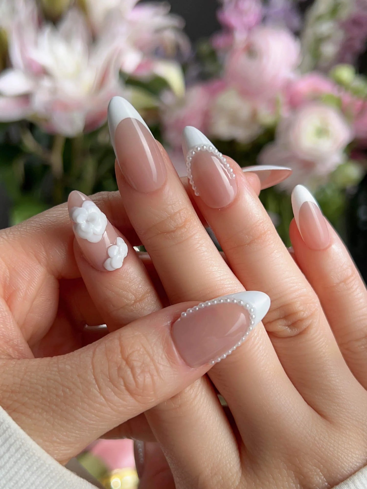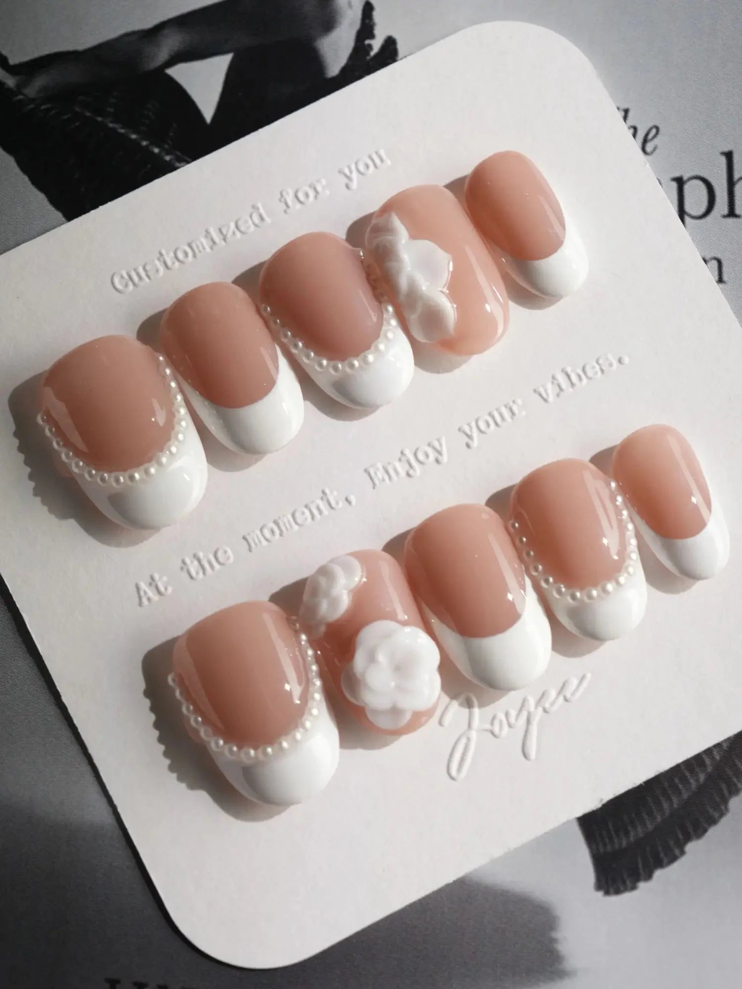 Where timeless French elegance meets sculpted floral beauty. This handmade press-on set pairs a soft nude-pink base with crisp white tips and delicate pearl accents. The highlight? Hand-sculpted camellia blooms that bring refined dimension without overwhelming the look. Perfect for weddings, formal events, or any moment you want to express graceful simplicity with a touch of luxury.