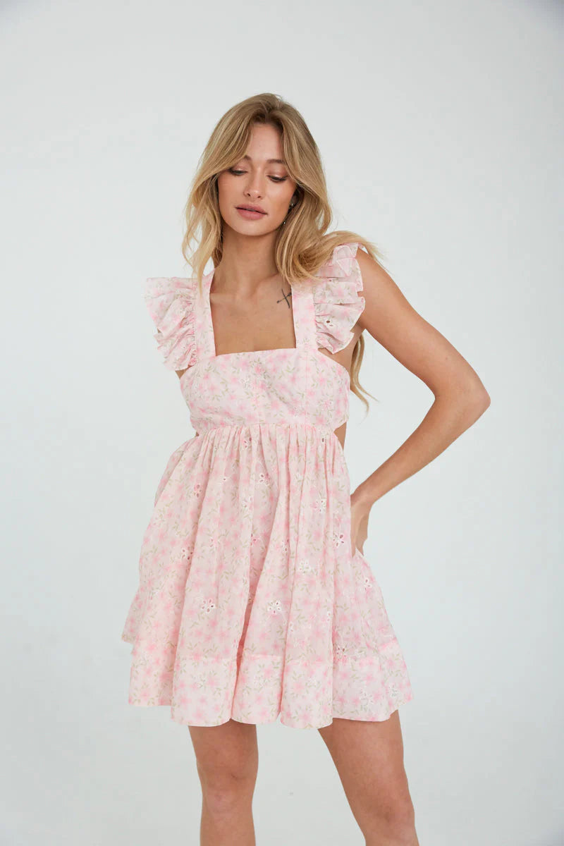 It doesn't get much cuter than the Cara Floral Eyelet Flutter Sleeve Babydoll Mini Dress. This girly dress features a square neckline, floral eyelet fabric, flutter sleeves, and an apron style back! Available in pink and yellow Finish off this look with some beautiful accessories!