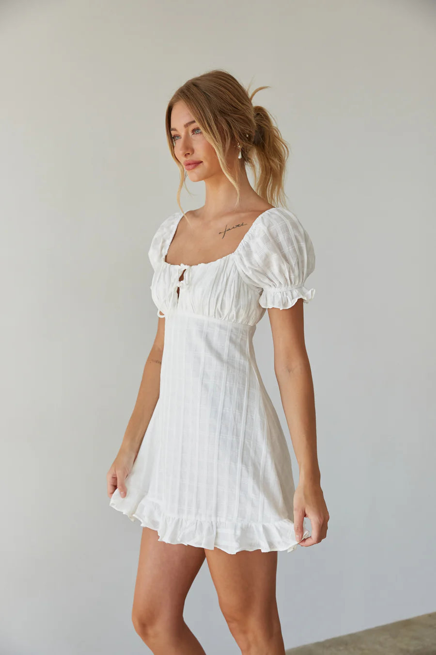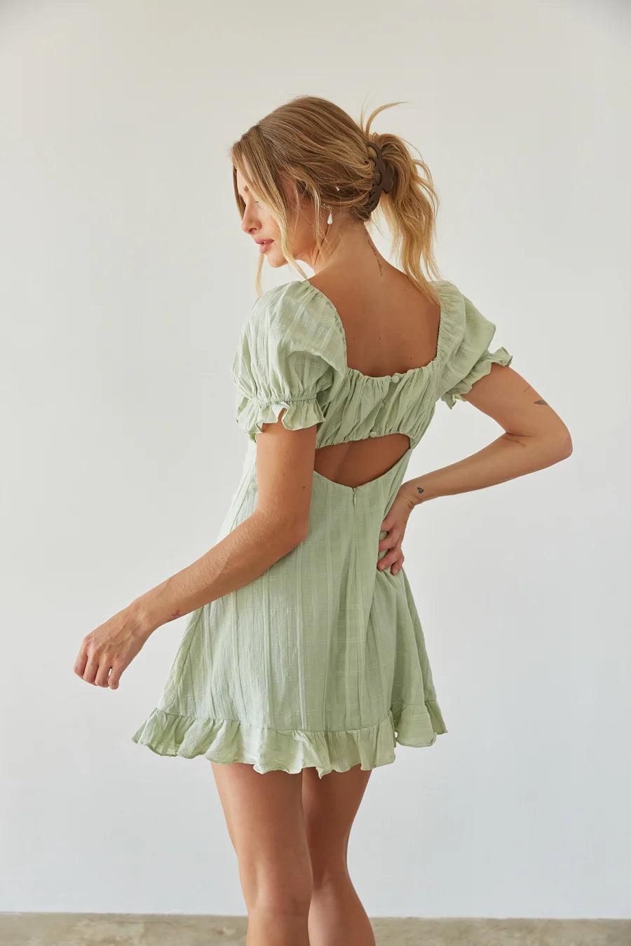 Prepare to blossom in the Clover Puff Sleeve Gingham Mini Dress this Spring Summer! This babydoll mini dress is ready for sunny days and daydreaming; featuring darling puff sleeves, an open back silhouette, tie front bustier detail. Available in white and sage green with a subtle gingham print. Pair this sundress with a pair of cowboy boots to complete the outfit!
