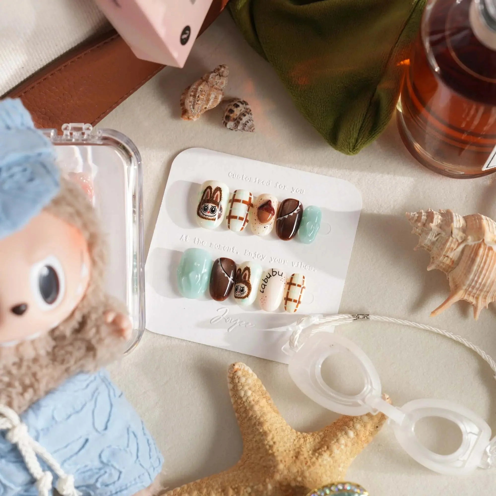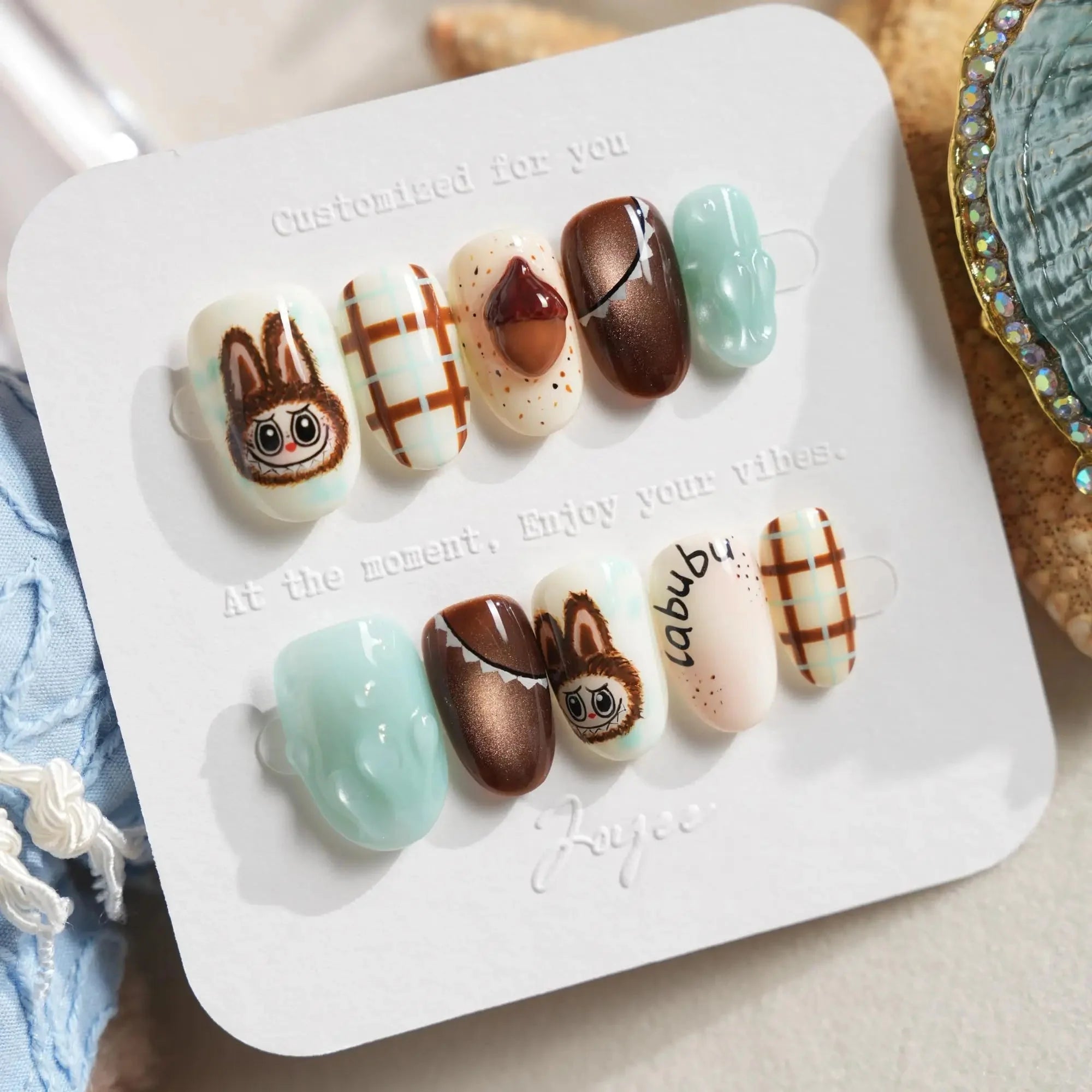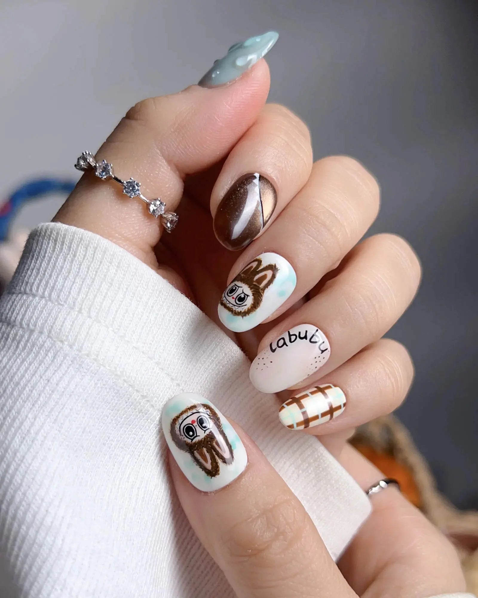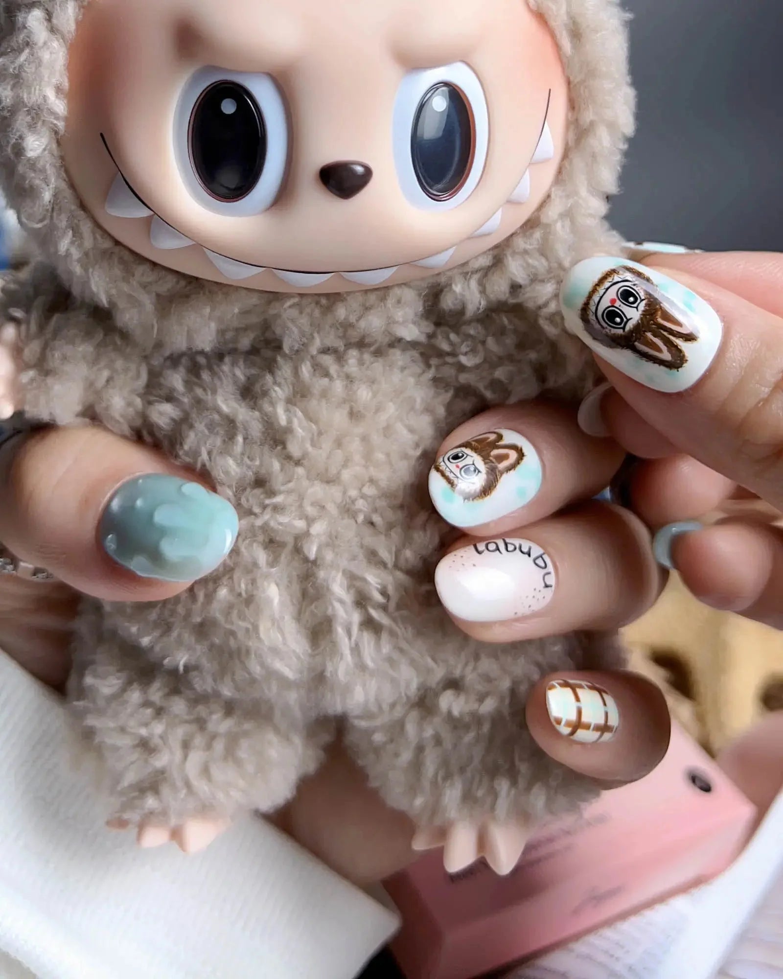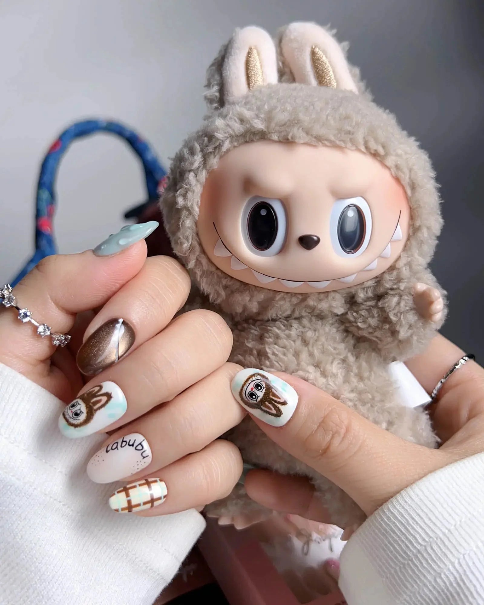 Obsessed with Labubu but missed the drop? This playful nails art set turns your favorite collectible into a wearable vibe. Cocoa browns, mint jelly, checker plaids, and Labubu’s big eyes—each detail captures that rare, hidden-edition energy. It’s cute, weird, and so fun to wear.