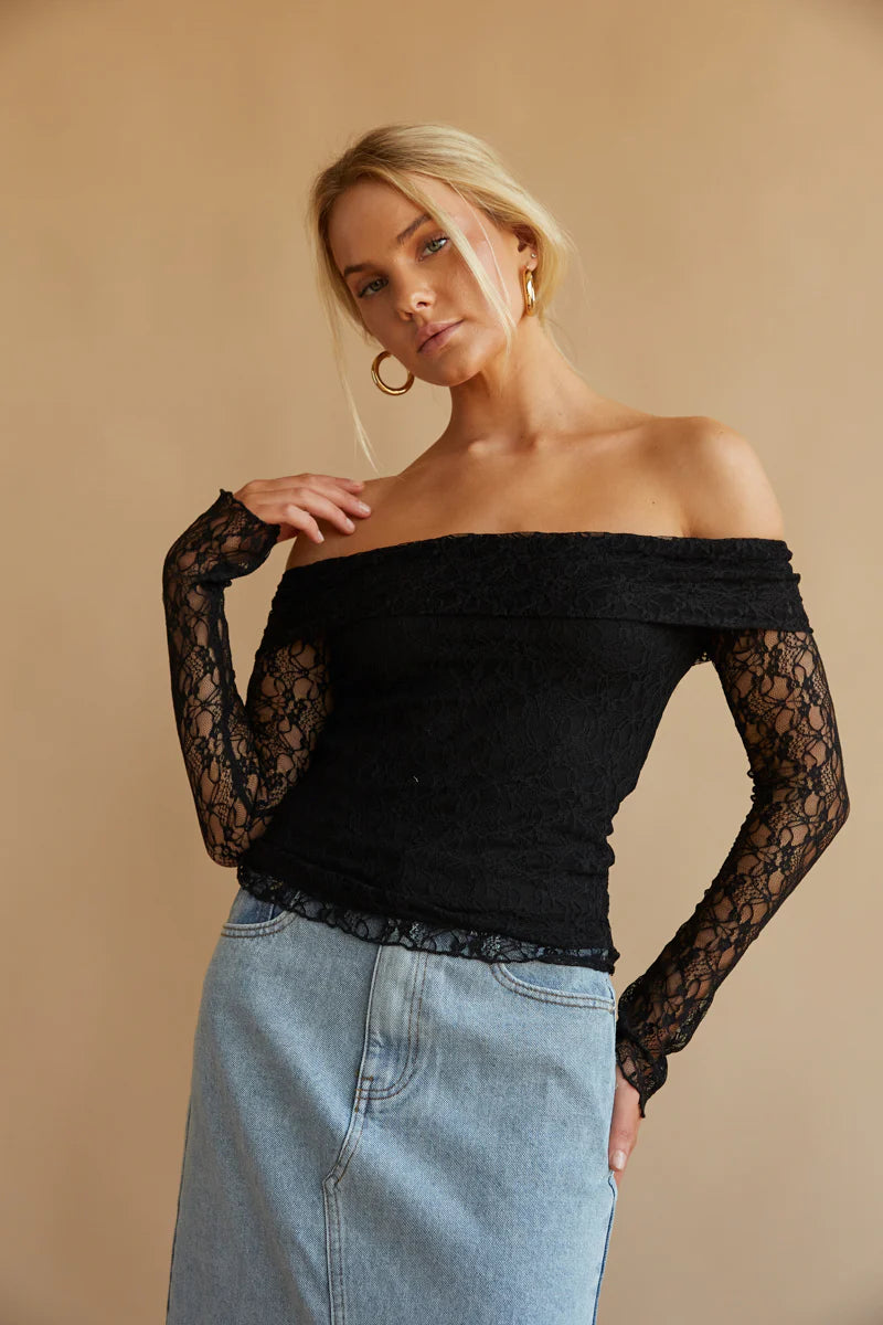 Feel flirty and feminine in the Collette Off The Shoulder Lace Long Sleeve Top! This beautiful top features a fold-over neckline, off-the-shoulder sleeves, and a stunning lace overlay. Available in black, white, and snow. Pair with the Hayden Denim Midi Skirt to complete the look!