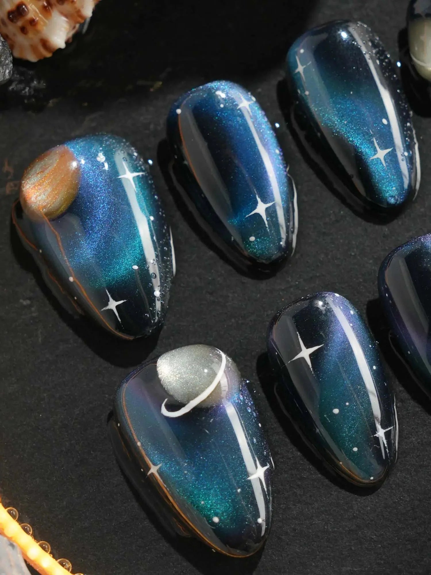 Inspired by the mysteries of the galaxy, these space nail designs feature a deep cat-eye shimmer and 3D planets floating across a cosmic sky. The metallic blues and sparkling stars capture the wonder of the universe—perfect for late-night selfies, music festivals, or anytime you want your nails to be the main character.