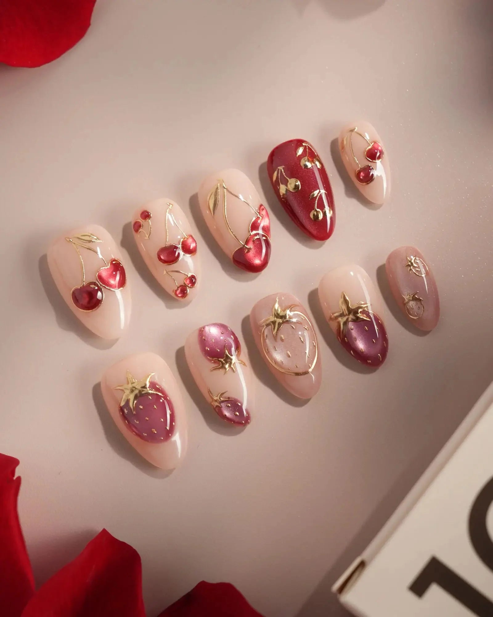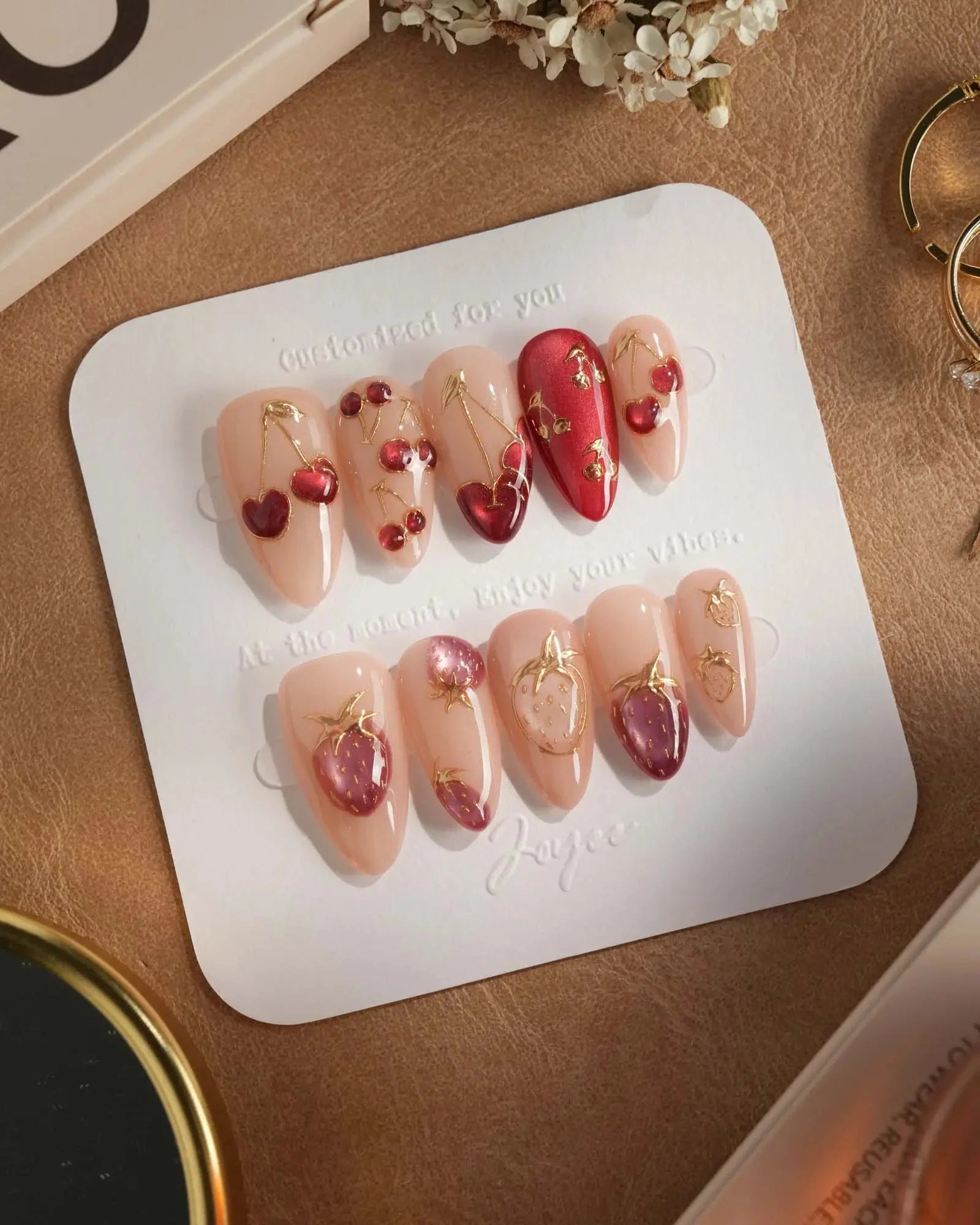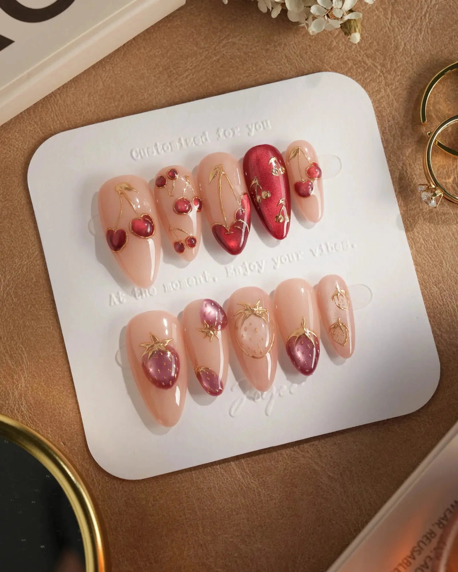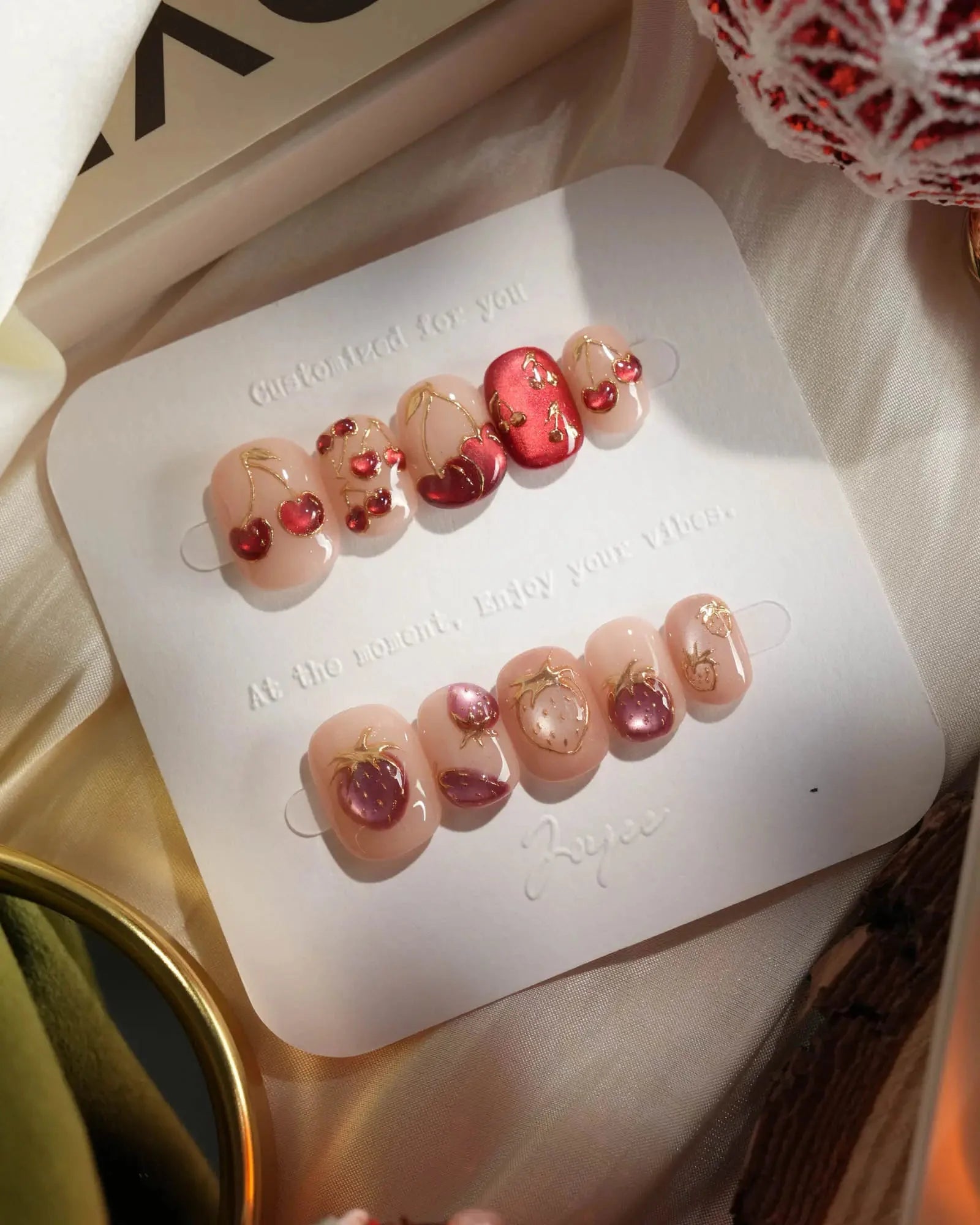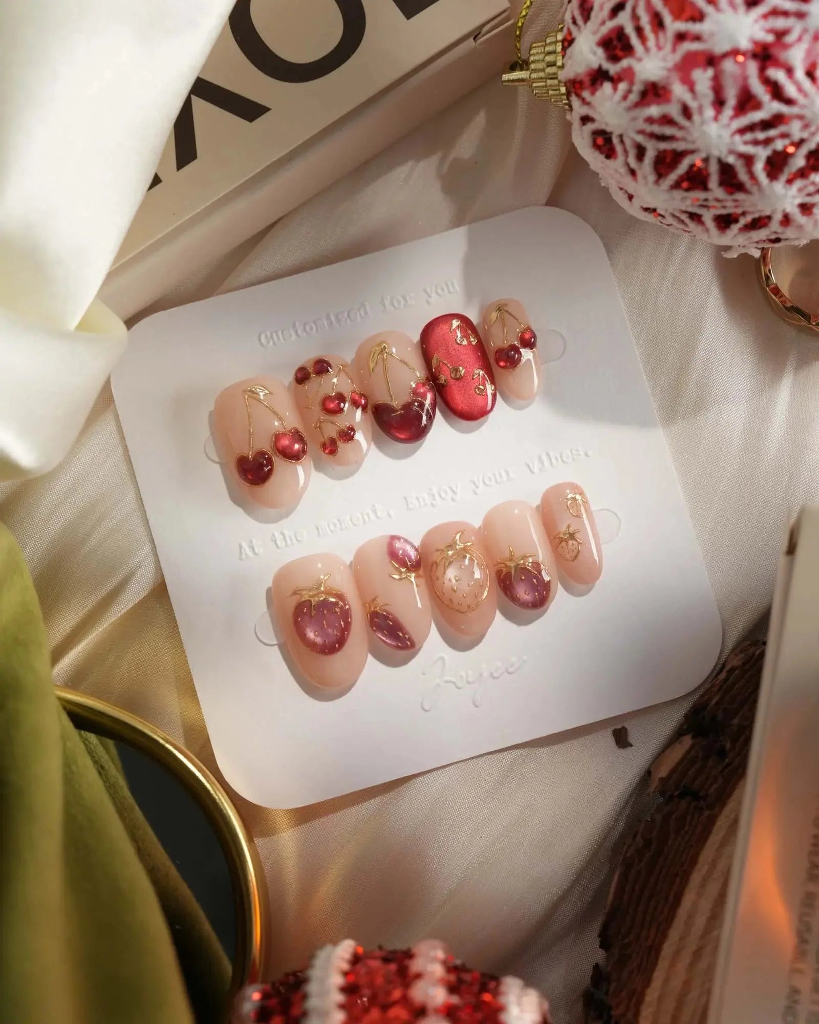 This handmade luxury nail set captures the essence of holiday sweetness. The glossy cat-eye red pairs beautifully with golden cherry and strawberry details, creating a unique blend of elegance and playfulness. Perfect for festive dinners, date nights, or gifting, it delivers a salon-level shine and fully customizable fit.
