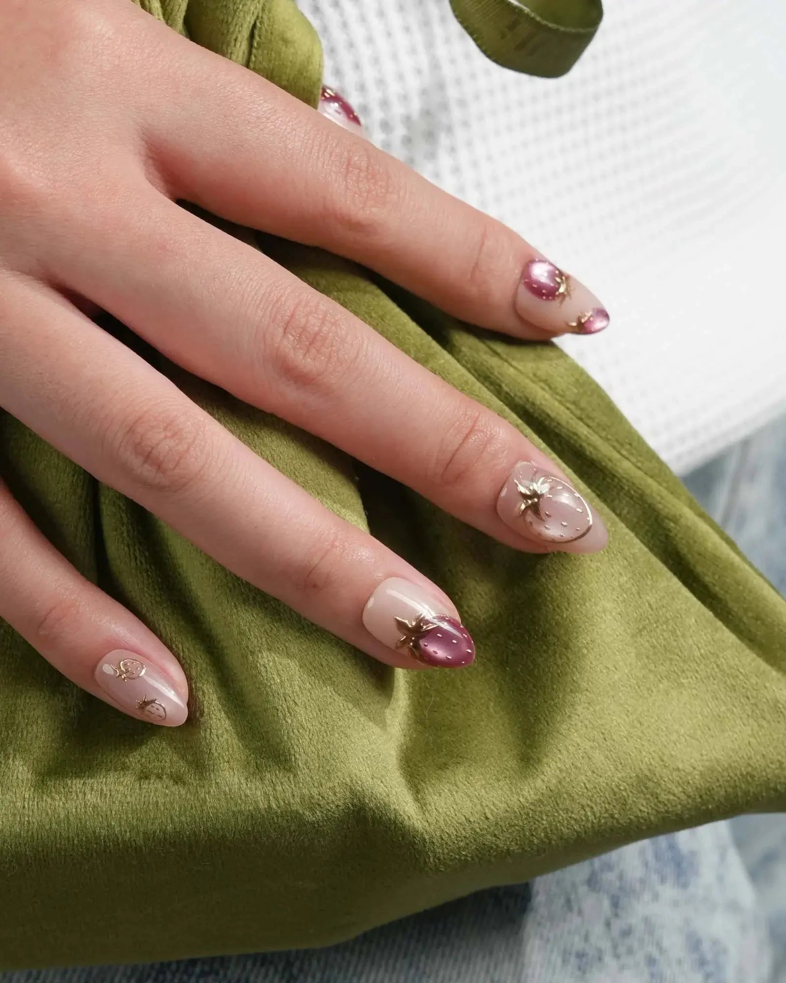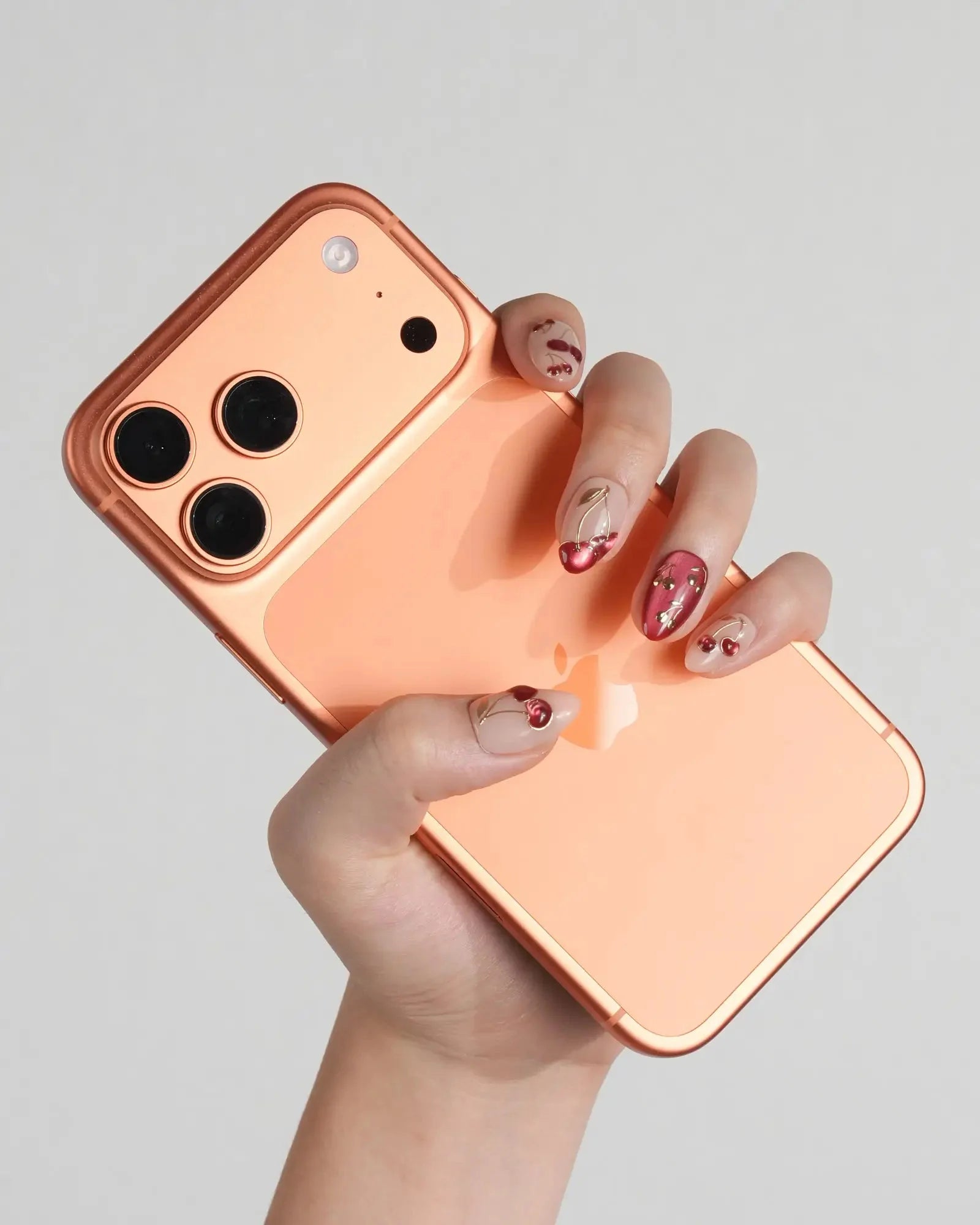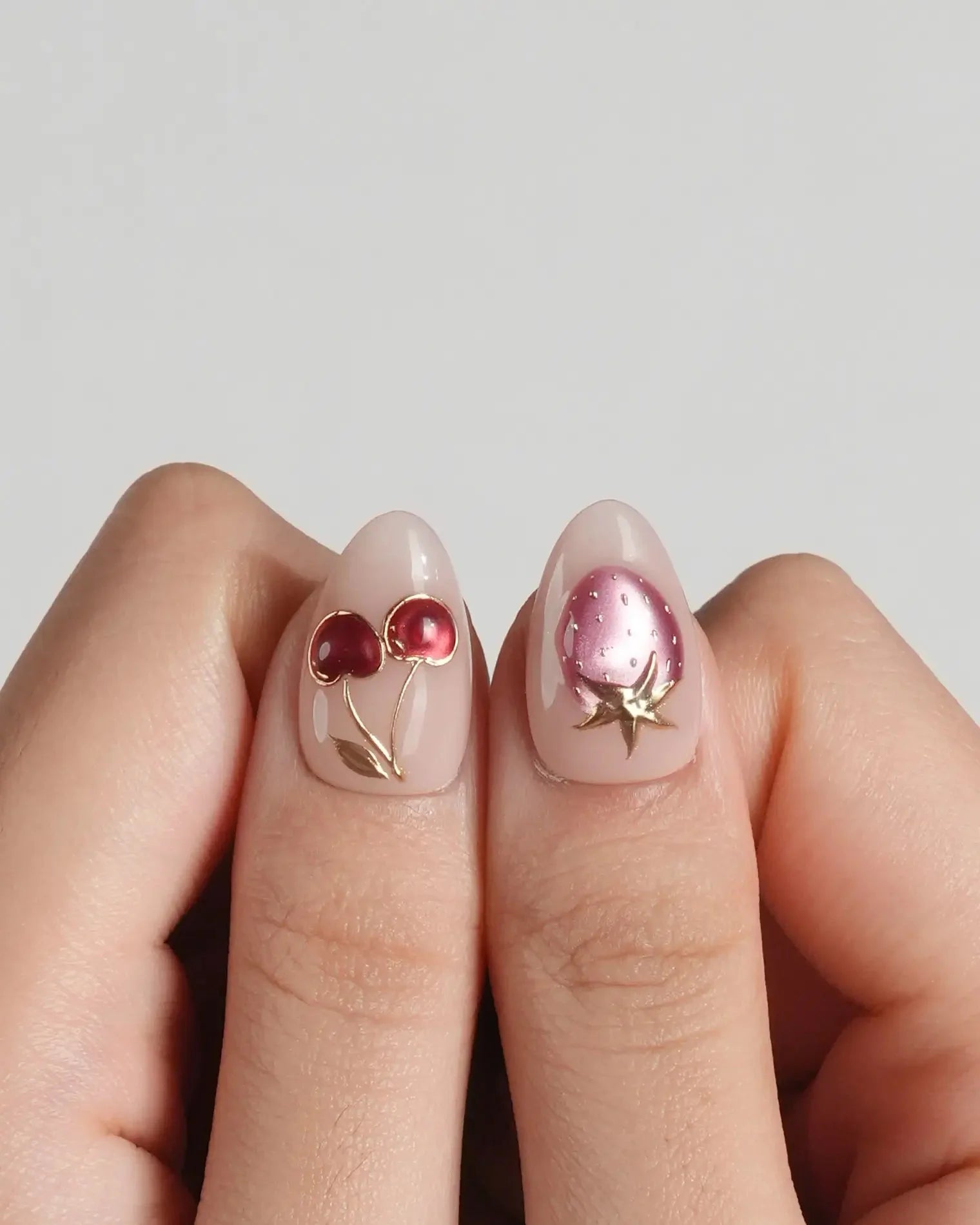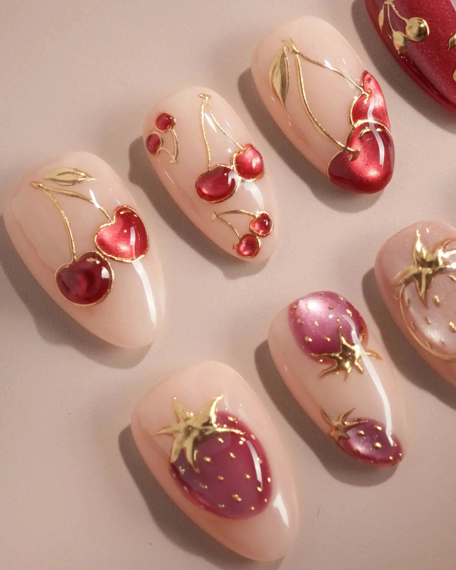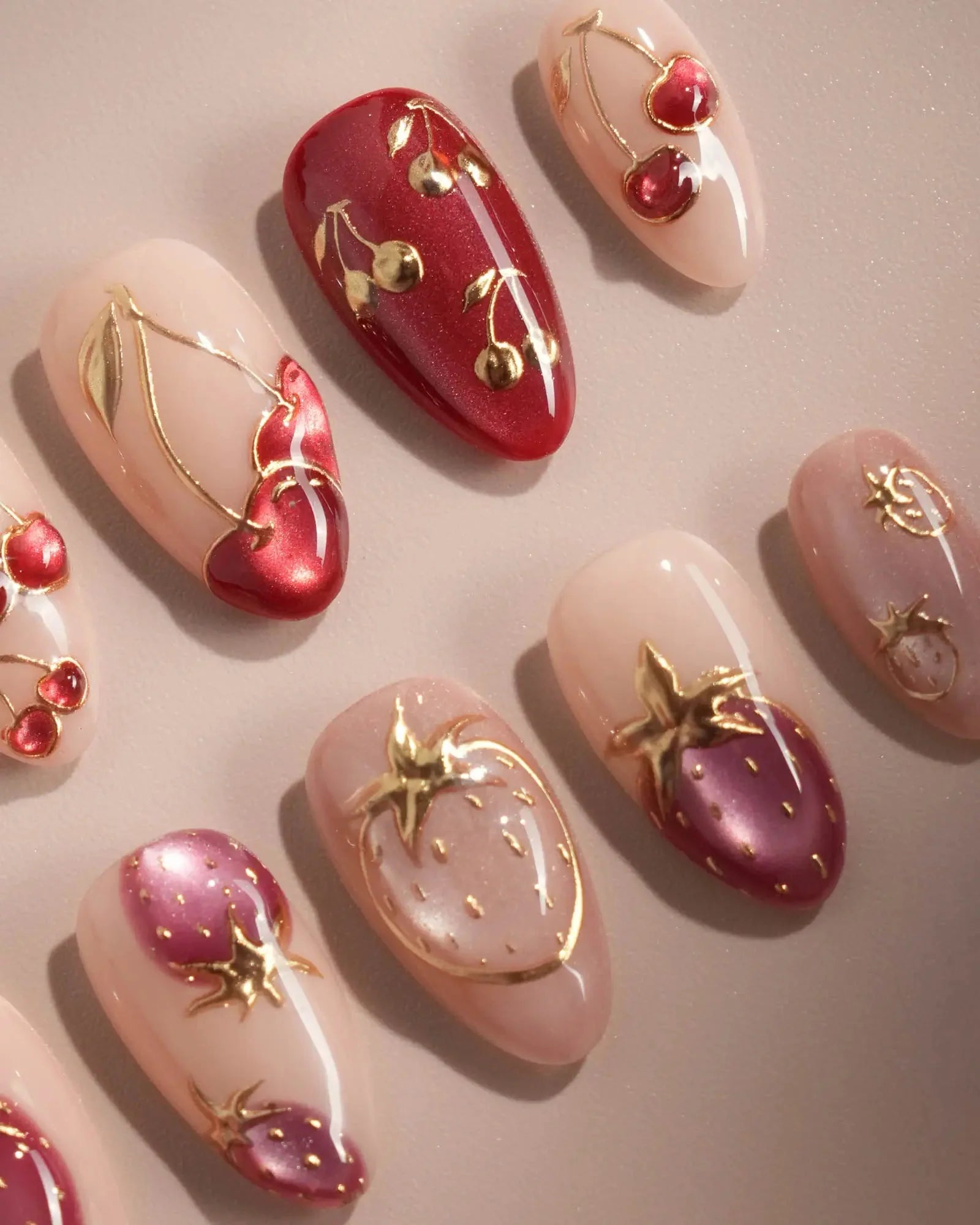 This handmade luxury nail set captures the essence of holiday sweetness. The glossy cat-eye red pairs beautifully with golden cherry and strawberry details, creating a unique blend of elegance and playfulness. Perfect for festive dinners, date nights, or gifting, it delivers a salon-level shine and fully customizable fit.
