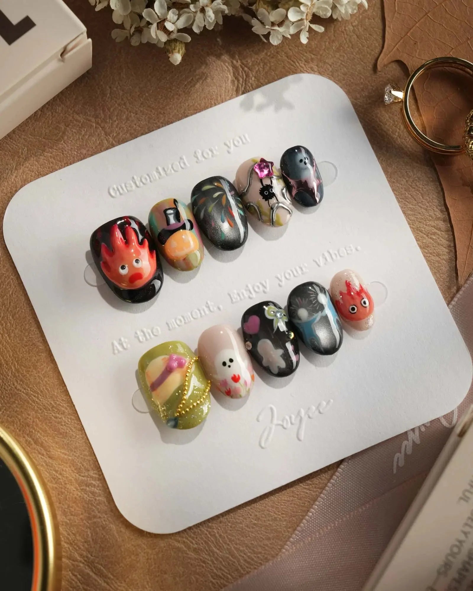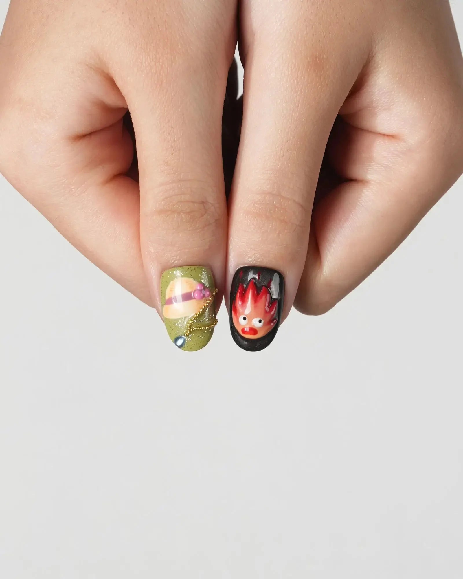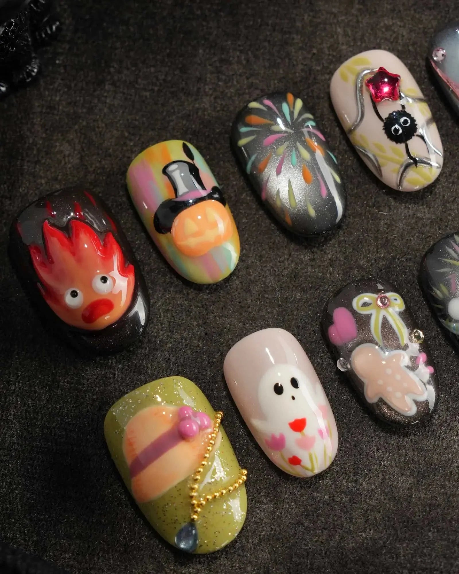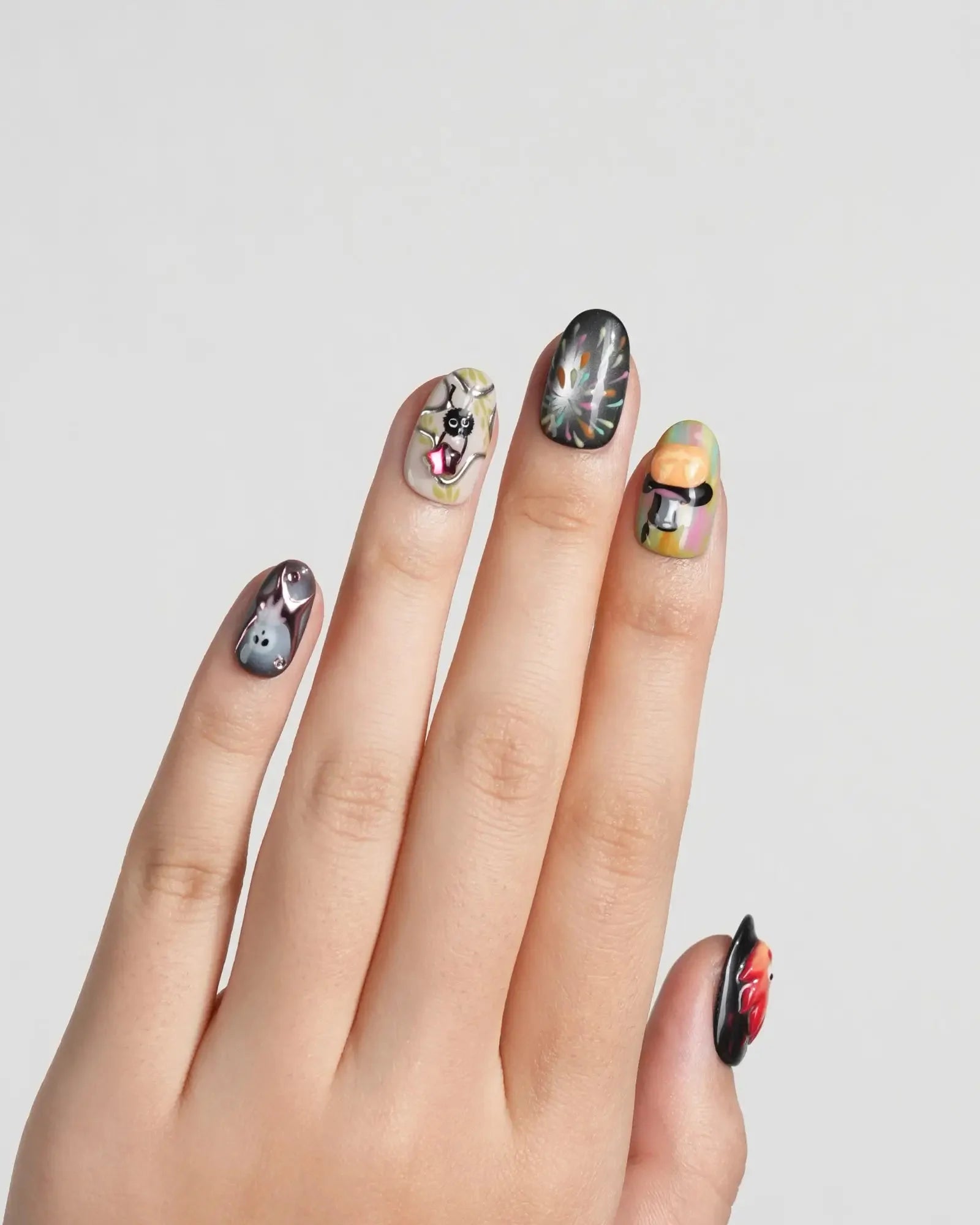 Step into Halloween fun with these anime-inspired fire and ghost nails. Designed with pumpkins, fireworks, and 3D accents, each set is handmade to bring playful yet chic vibes. Customizable in shape and length, these short oval nails are also reusable—perfect for cosplay, parties, and seasonal celebrations.
