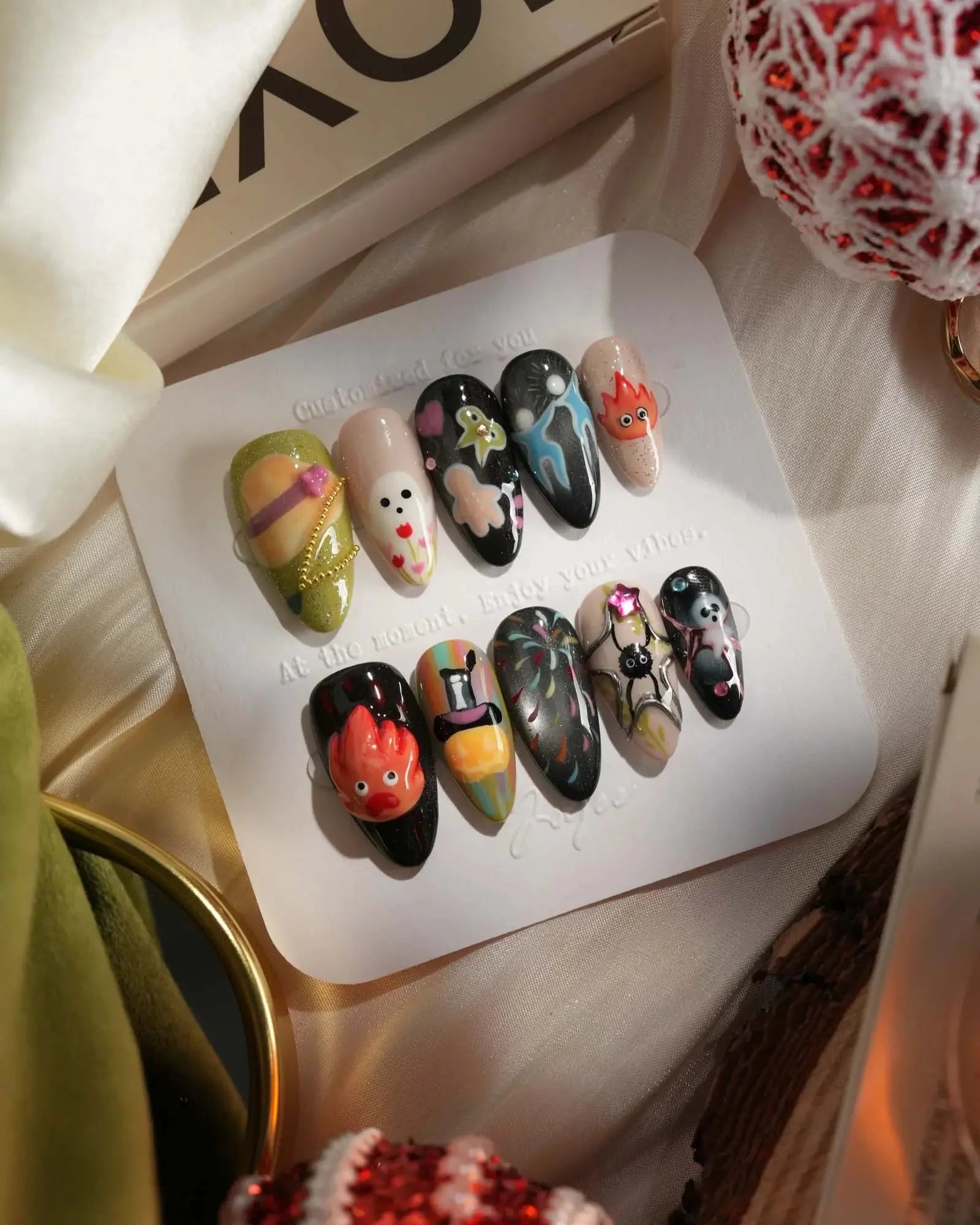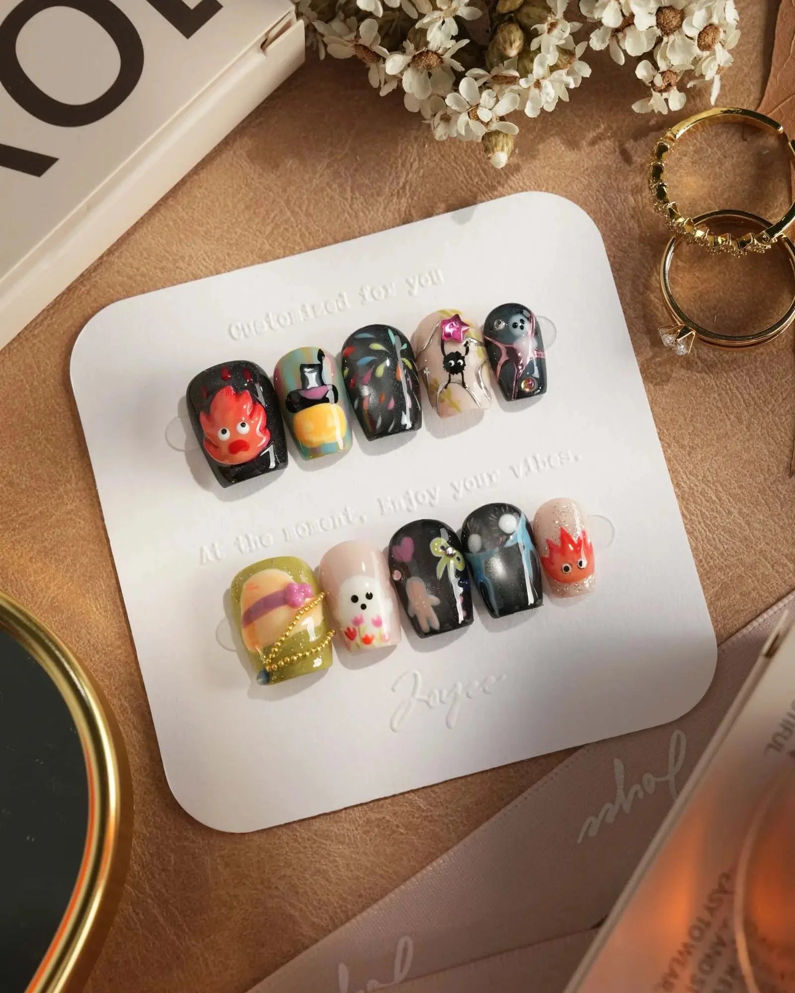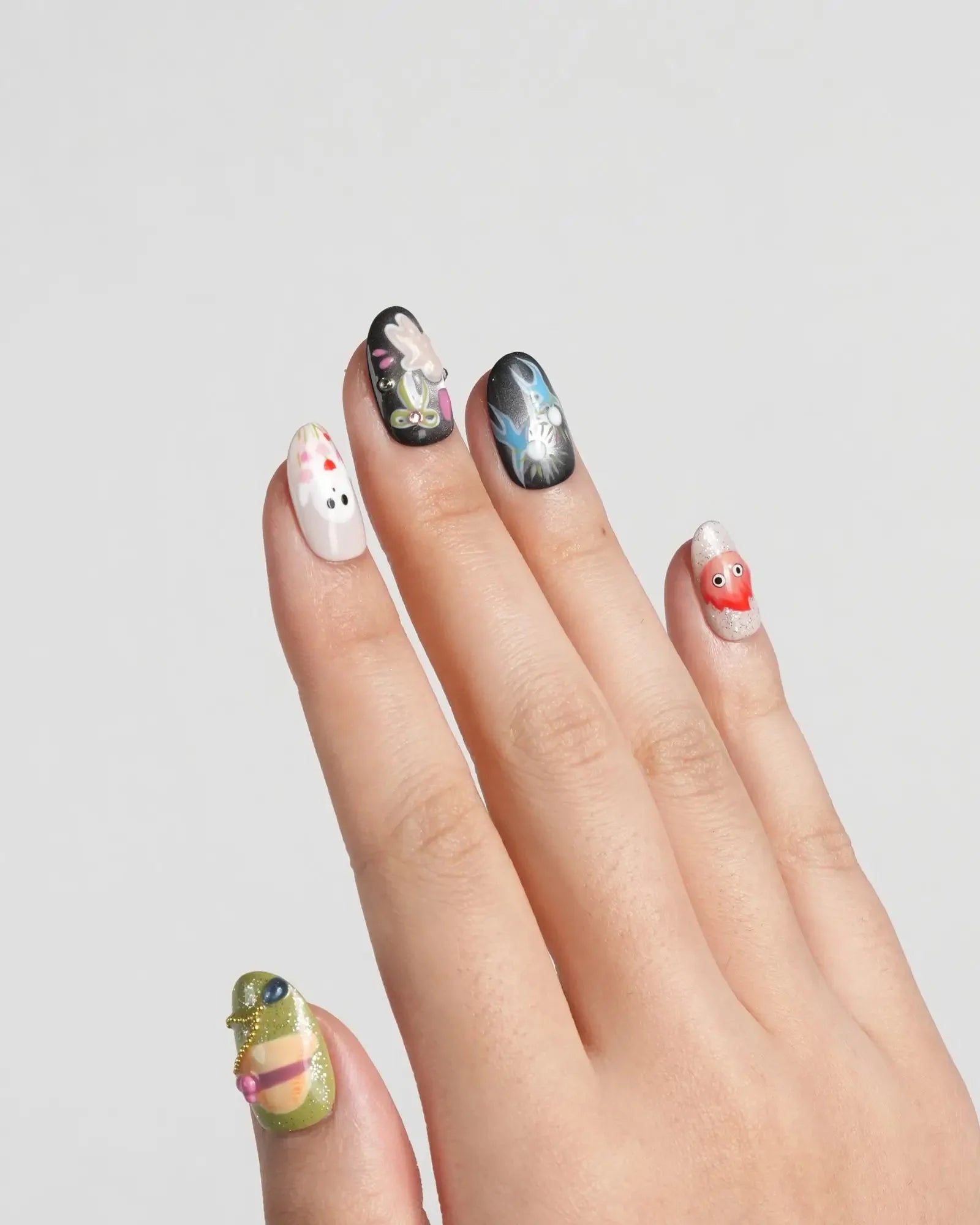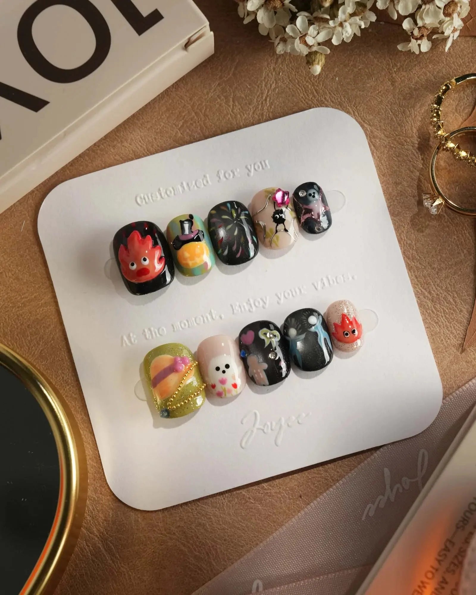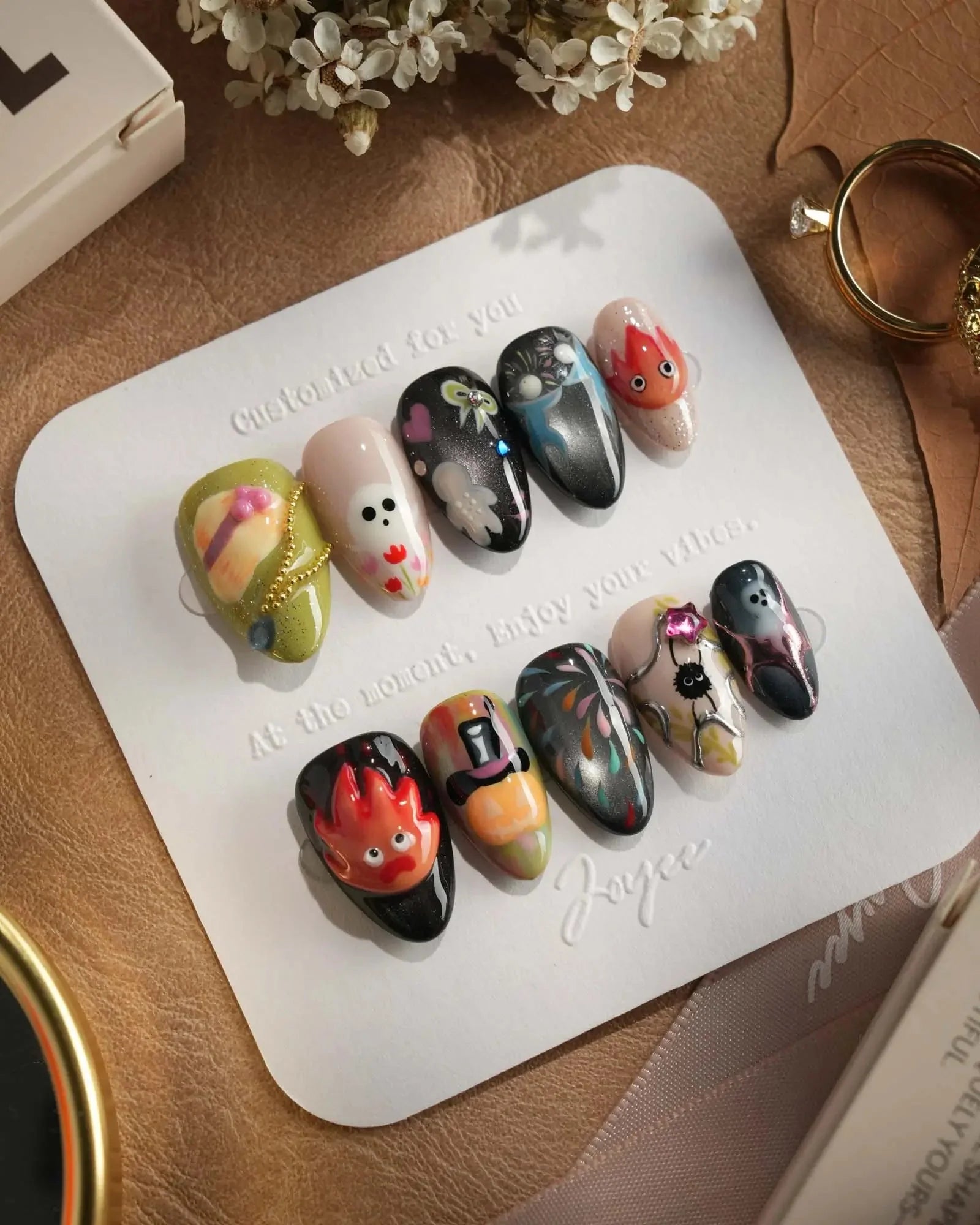 Step into Halloween fun with these anime-inspired fire and ghost nails. Designed with pumpkins, fireworks, and 3D accents, each set is handmade to bring playful yet chic vibes. Customizable in shape and length, these short oval nails are also reusable—perfect for cosplay, parties, and seasonal celebrations.