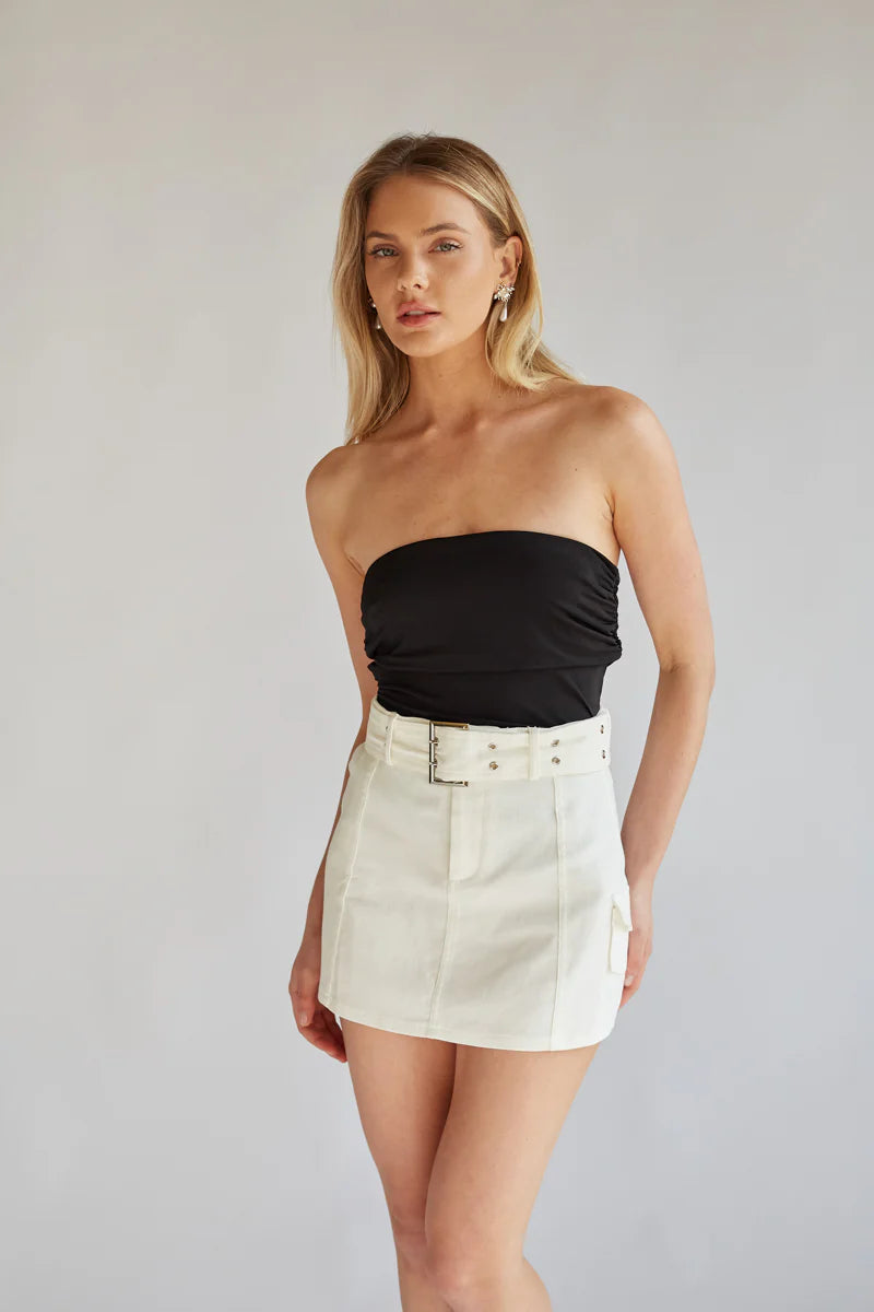 You'll be giving ultimate "cool girl" vibes in the Darcey Belted Cargo Mini Skirt! This cargo-style mini skirt features a detachable belt with a silver belt buckle, silver grommets, and a mini side pocket. Available in white, black, and tan. Pair with a cute crop top to complete the look!