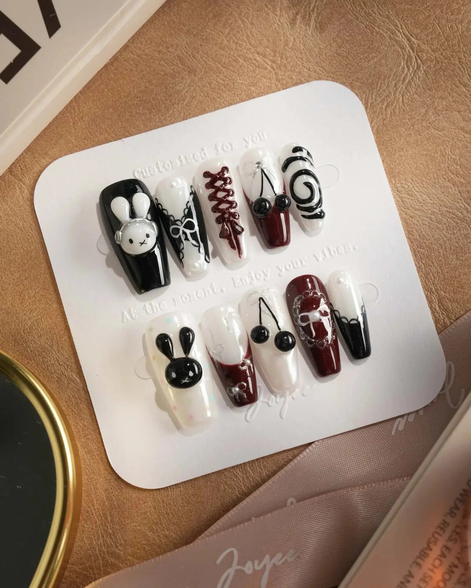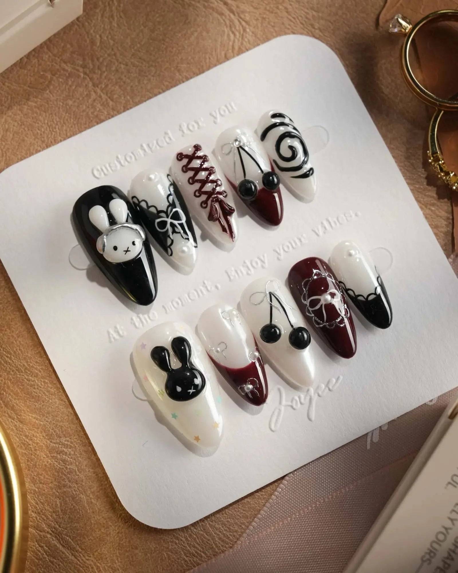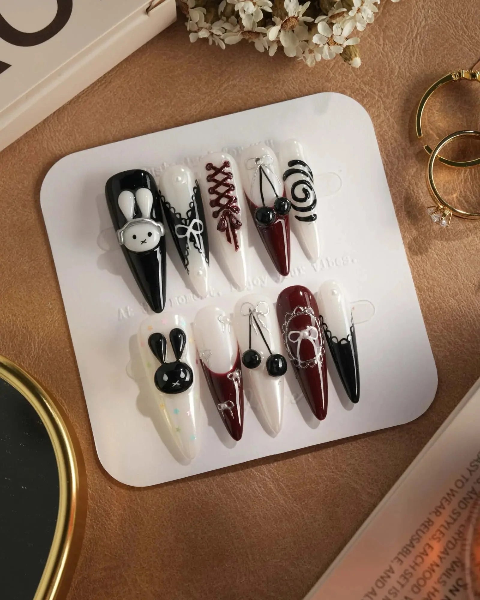 Celebrate Halloween with these playful bunny-inspired nails in black, red, and white. Featuring 3D elements, cherries, lace-up details, and bows, they bring a fun yet chic touch to any outfit. Handmade with care and customizable in shape and length, this set is also reusable—perfect for Halloween parties, cosplay events, and themed nights.