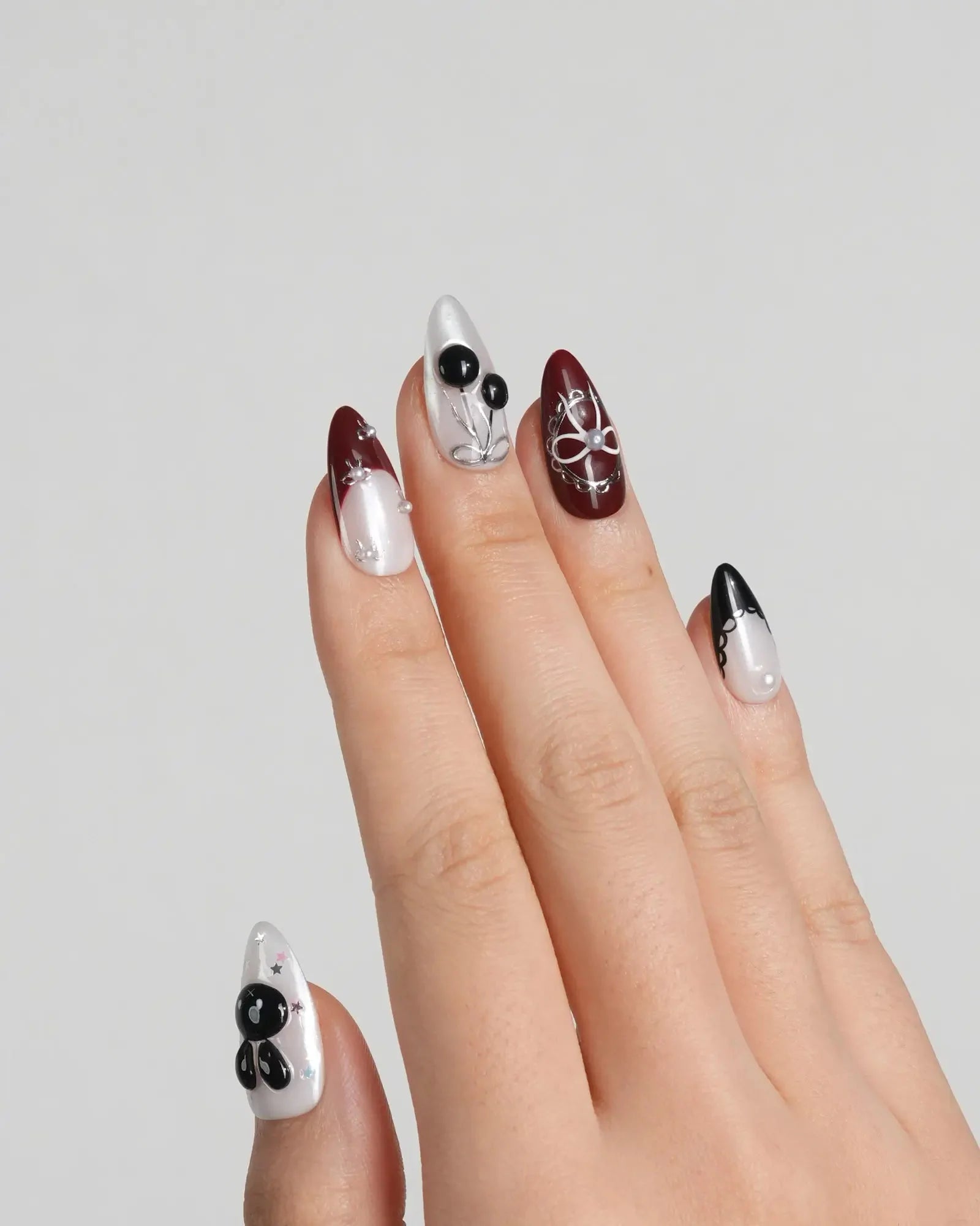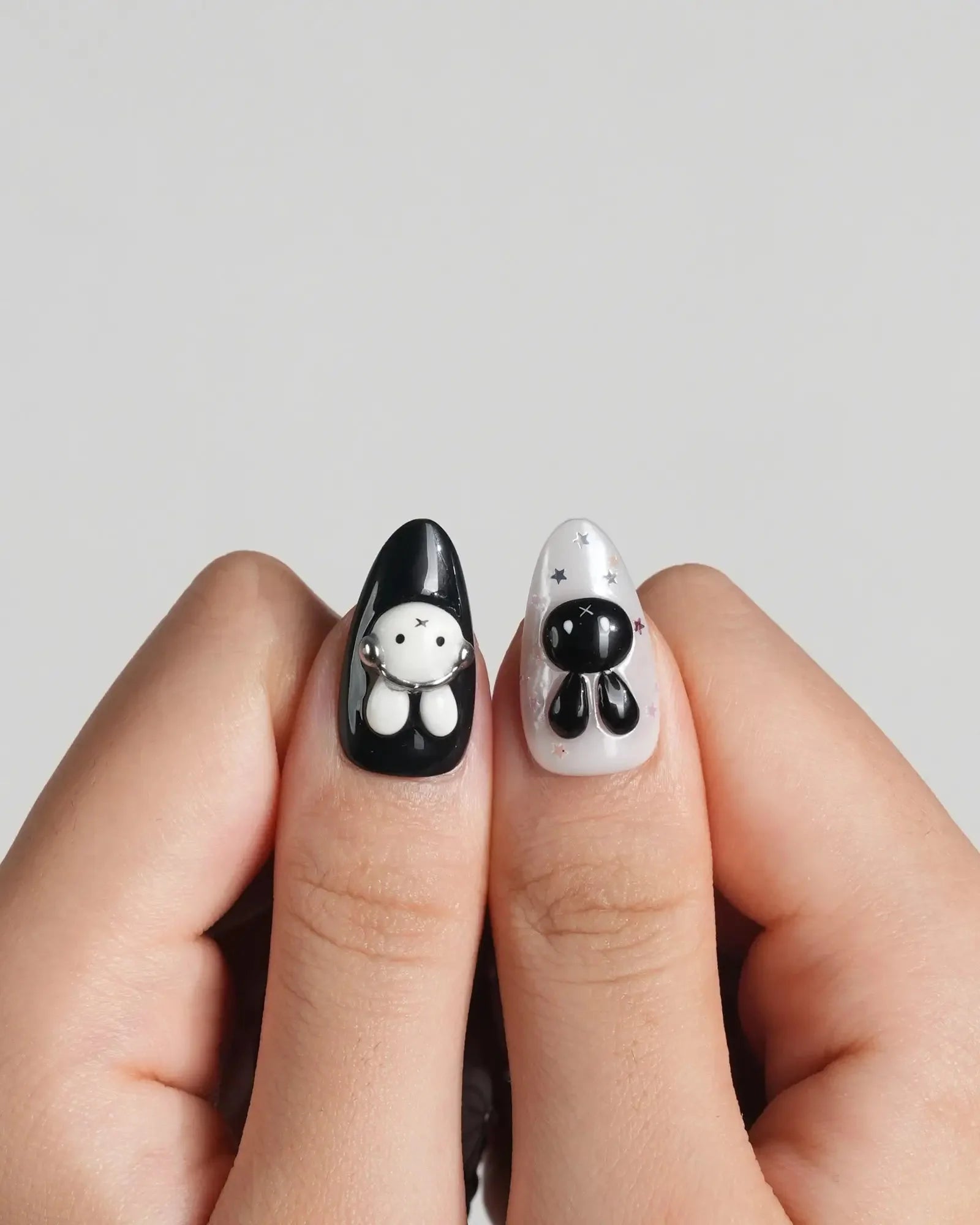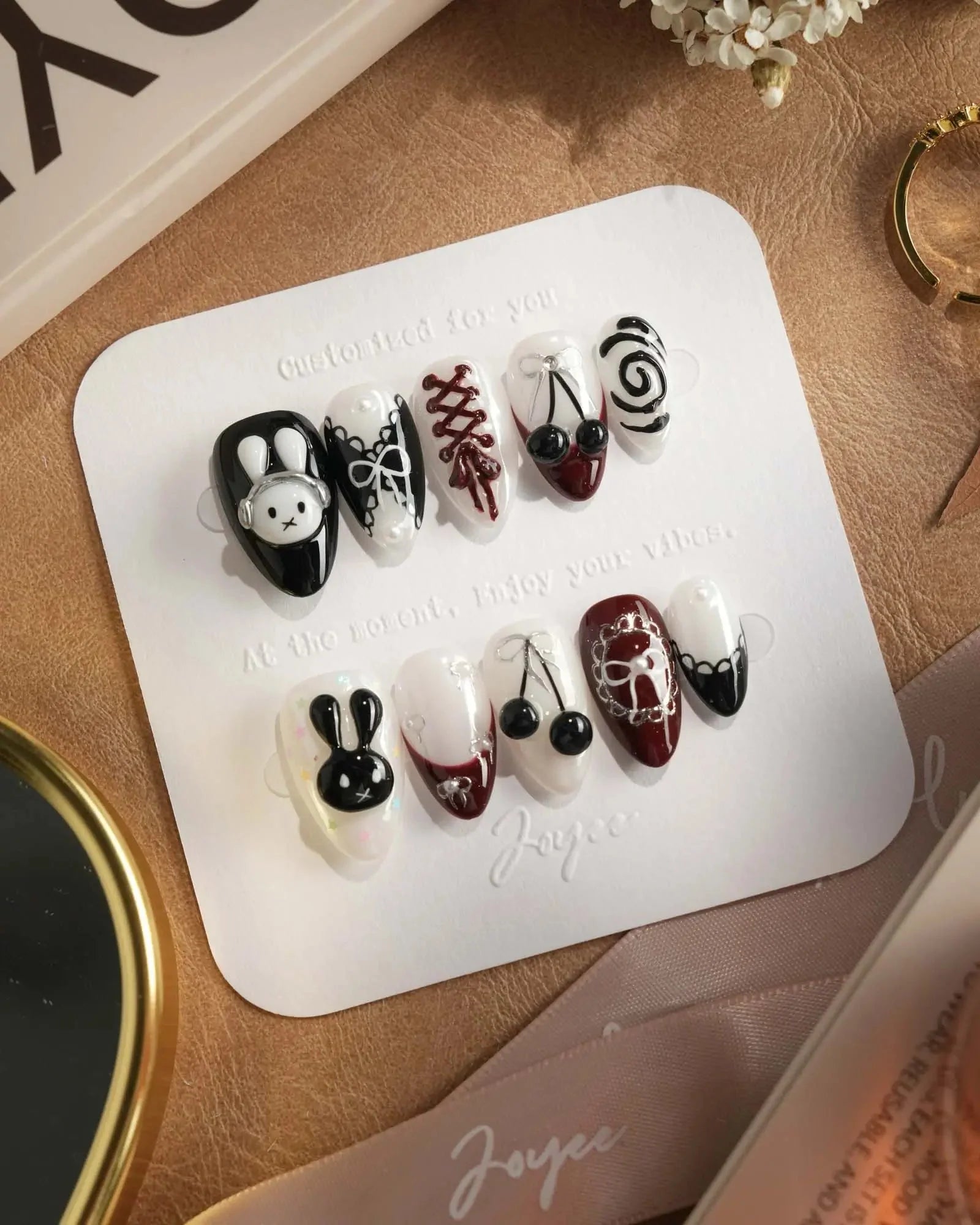 Celebrate Halloween with these playful bunny-inspired nails in black, red, and white. Featuring 3D elements, cherries, lace-up details, and bows, they bring a fun yet chic touch to any outfit. Handmade with care and customizable in shape and length, this set is also reusable—perfect for Halloween parties, cosplay events, and themed nights.