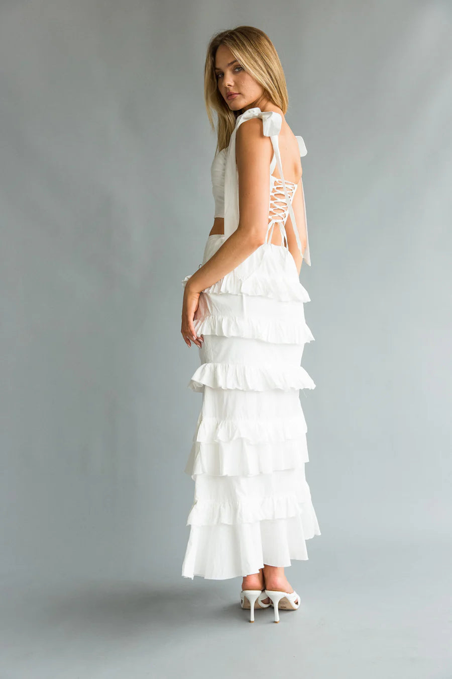 Head over heels for the Dawn Bow Strap Bustier Top + Tiered Ruffle Skirt Set! This linen matching skirt set features a feminine bustier corset top with tie bow straps, and tiered ruffle maxi skirt. Accessorize to finish the look off!