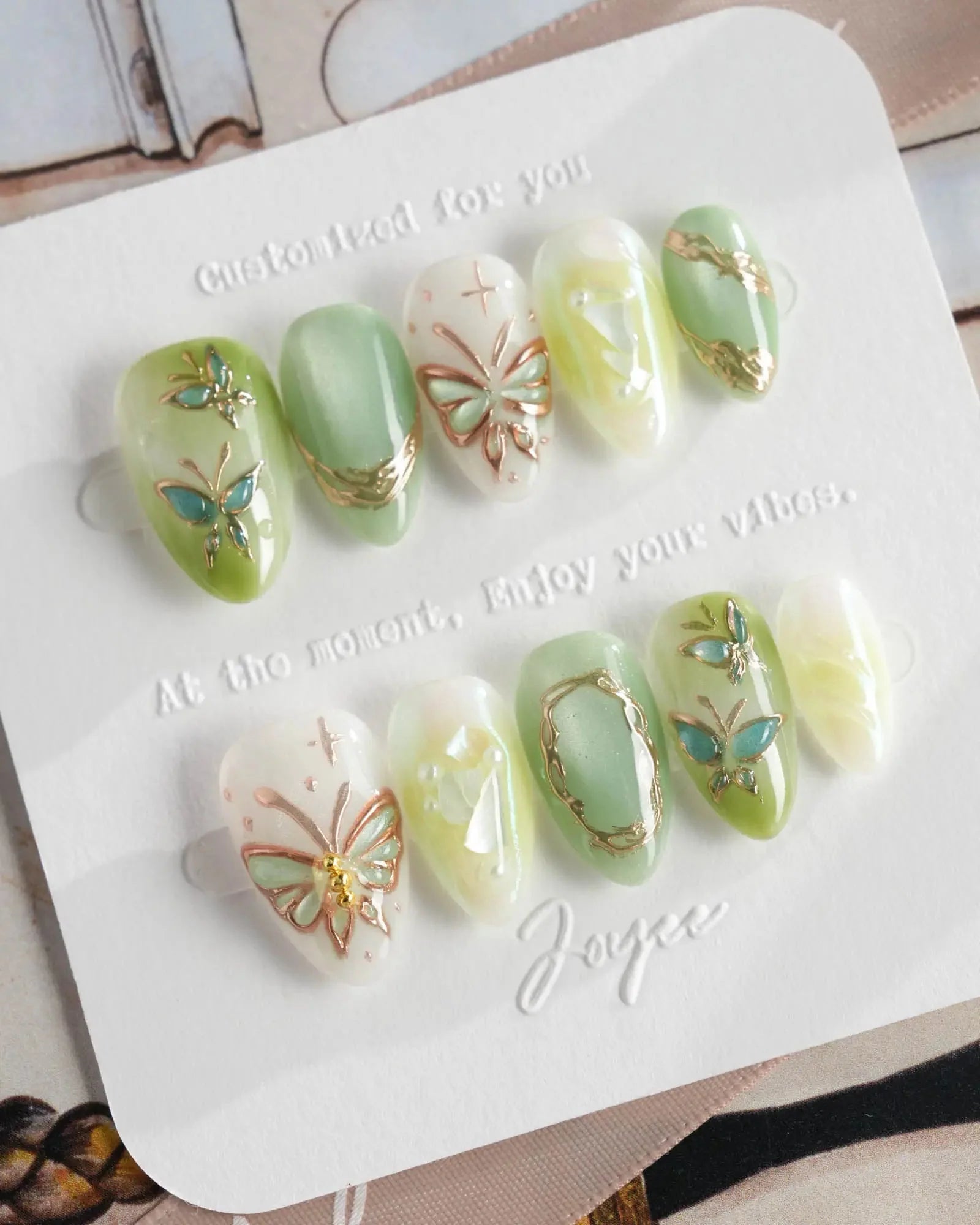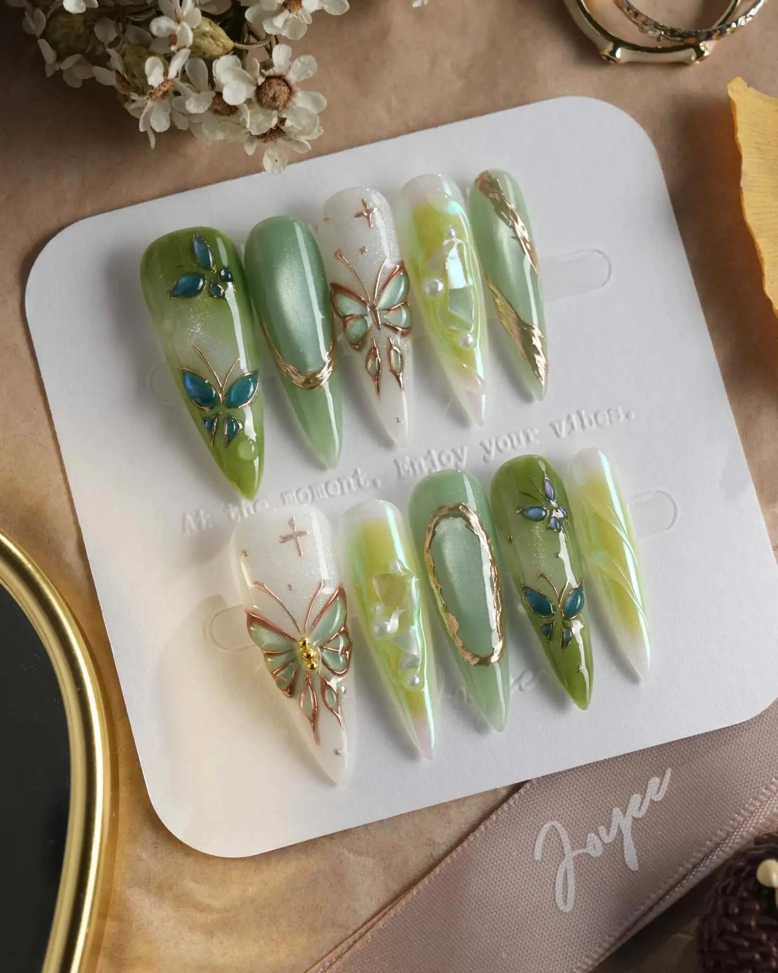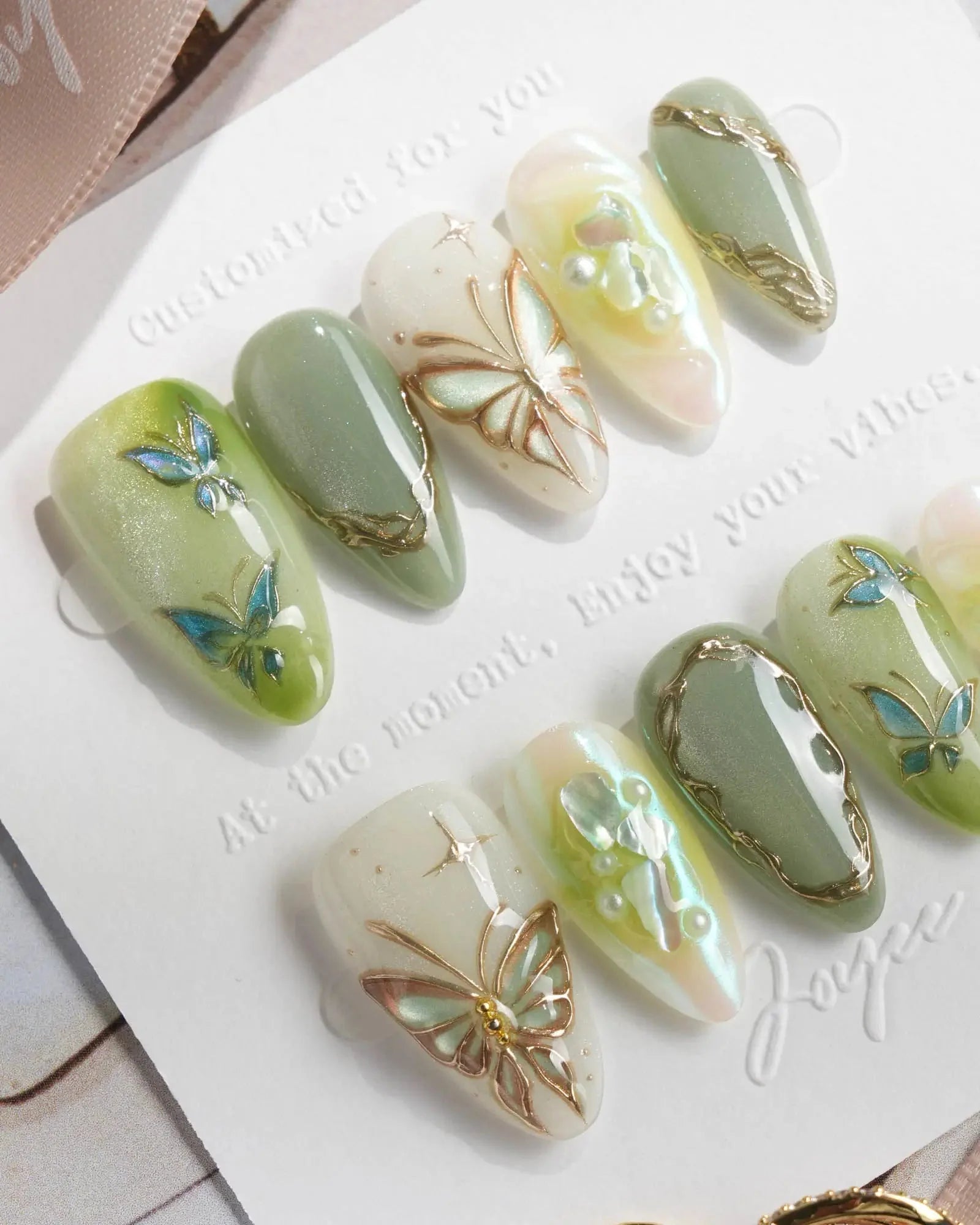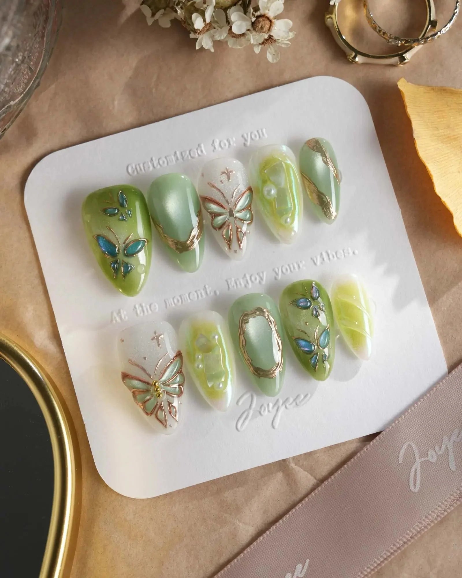 Originally made just for myself, Dreamland got so many compliments we had to release it. Green cat-eye gradients shift like forest shadows, while chrome lines add dimension. The butterfly? A two-toned 3D masterpiece—built with layered cat-eye wings that glow and flutter with light. A little magical, a lot unforgettable.