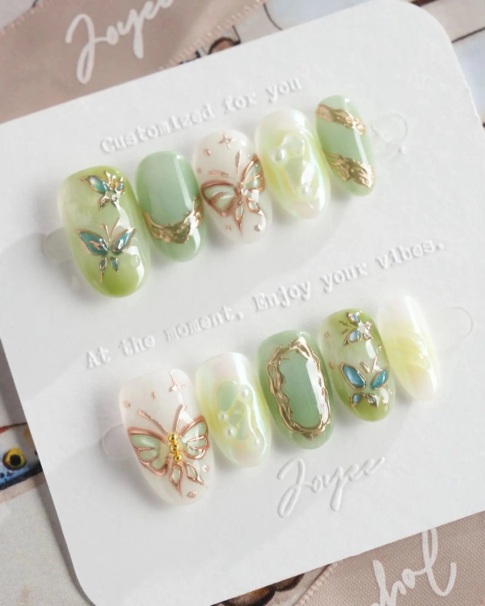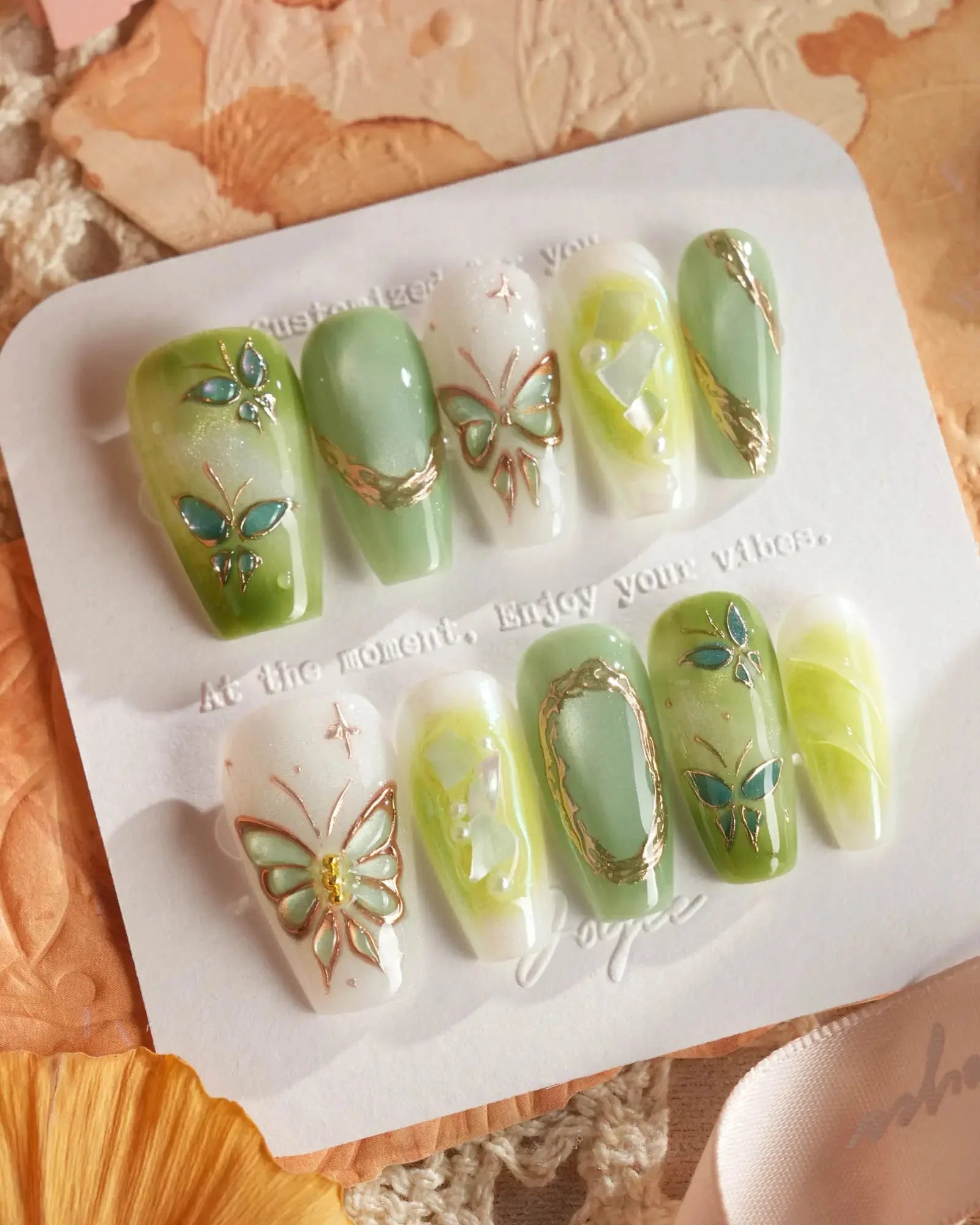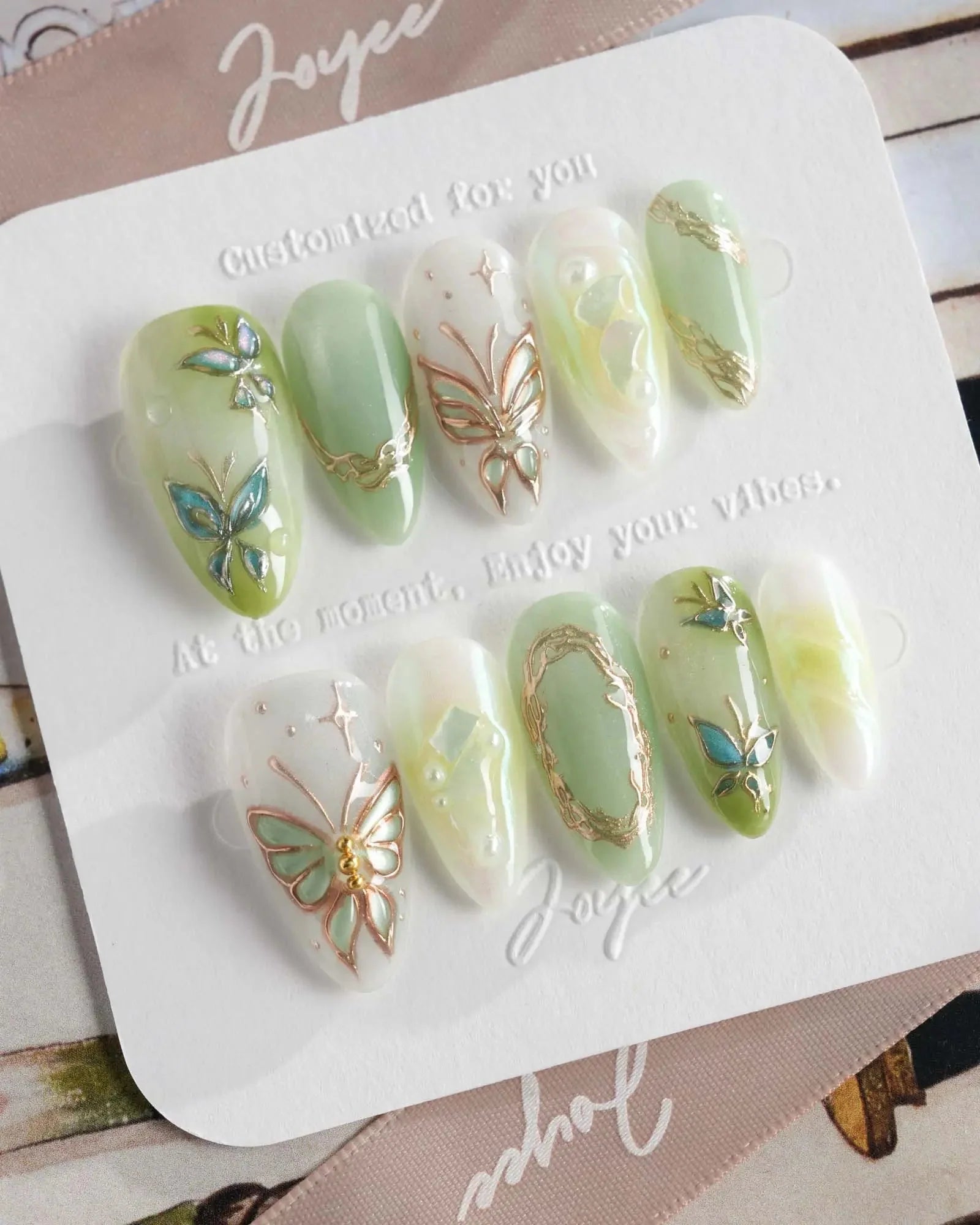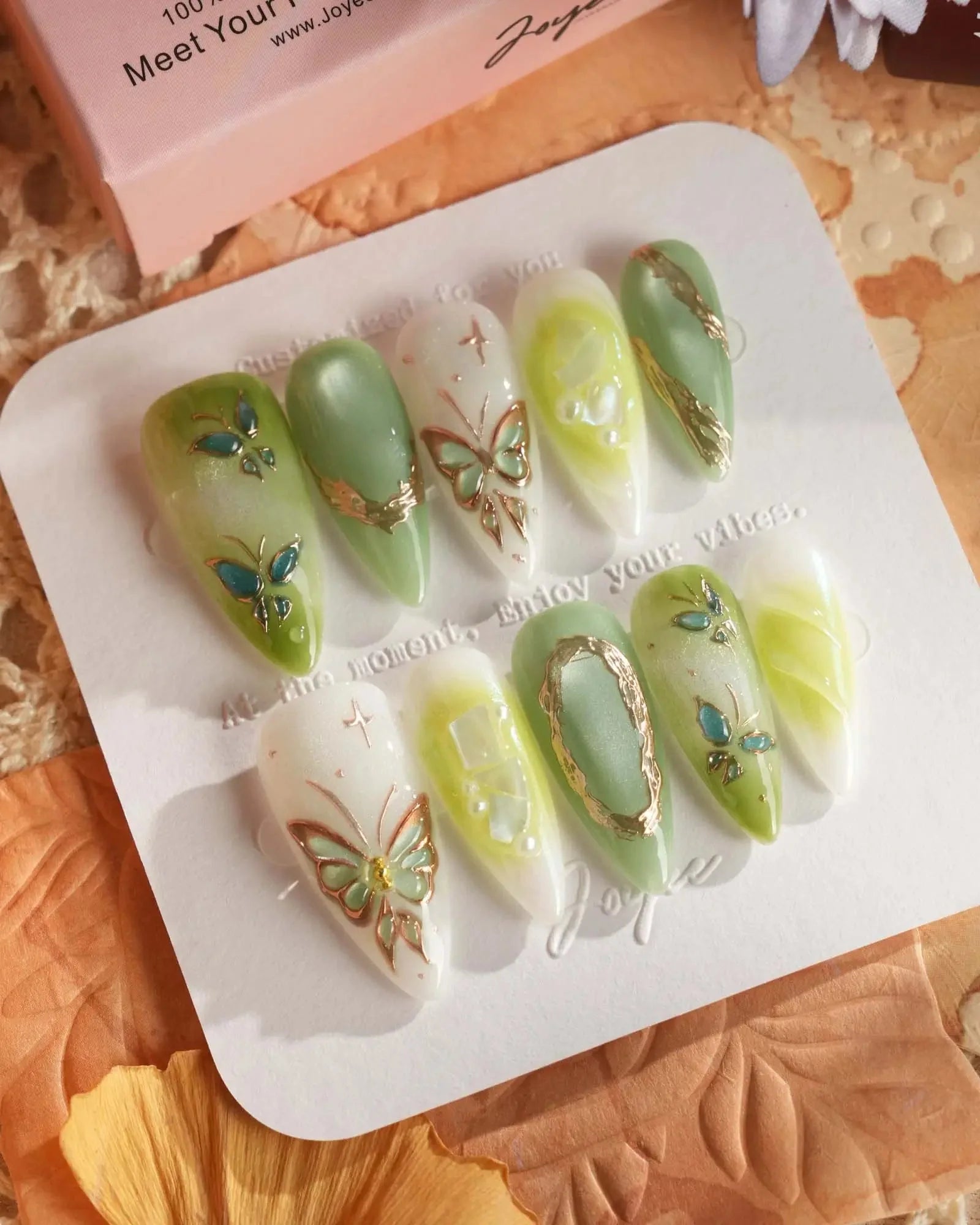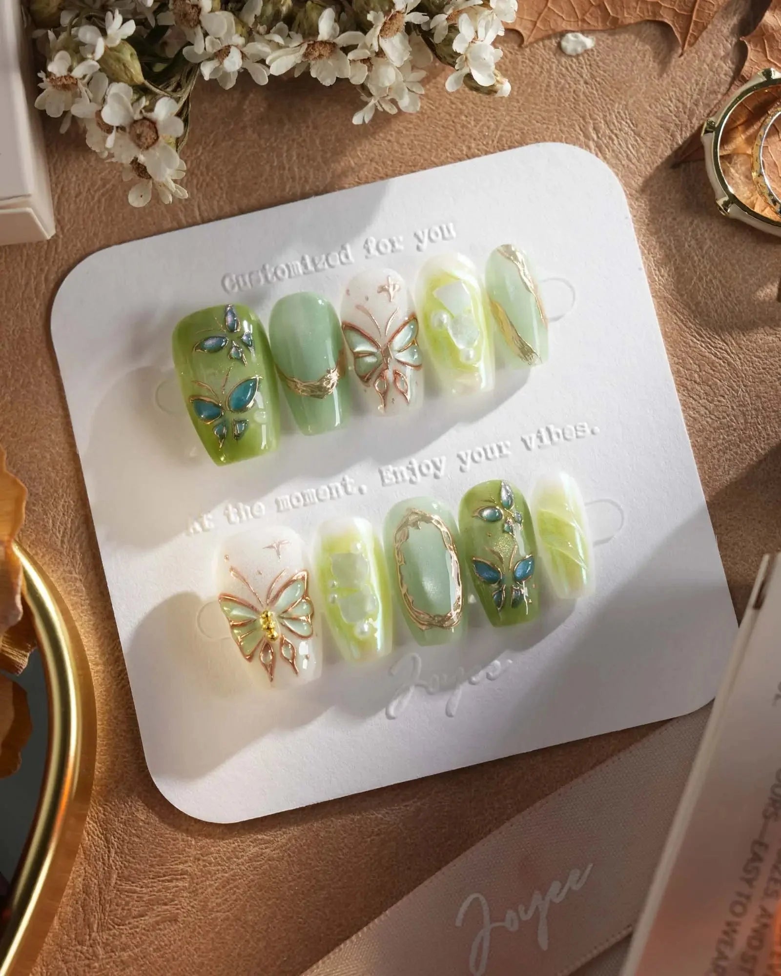 Originally made just for myself, Dreamland got so many compliments we had to release it. Green cat-eye gradients shift like forest shadows, while chrome lines add dimension. The butterfly? A two-toned 3D masterpiece—built with layered cat-eye wings that glow and flutter with light. A little magical, a lot unforgettable.