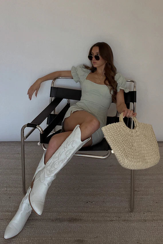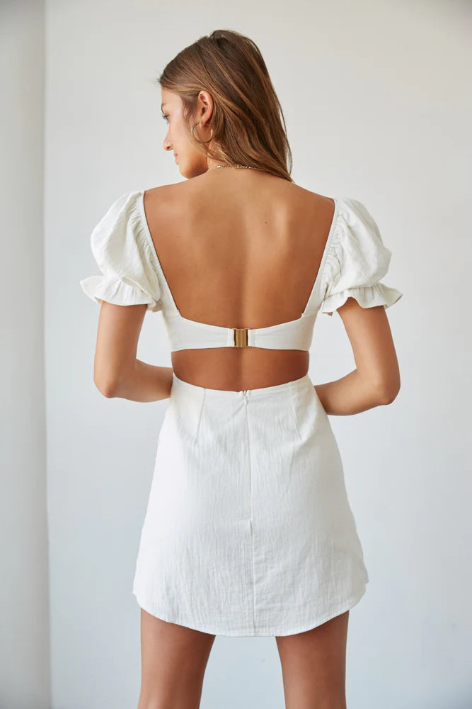 Star of the show in the Drew Puff Sleeve Corset Linen Mini Dress. This adorable open back mini dress features puff sleeves, a corset bodice, and a front leg slit for a flattering fit. Available in white and sage. Pair with the Issa Strappy Block Heel to complete this gorgeous look.