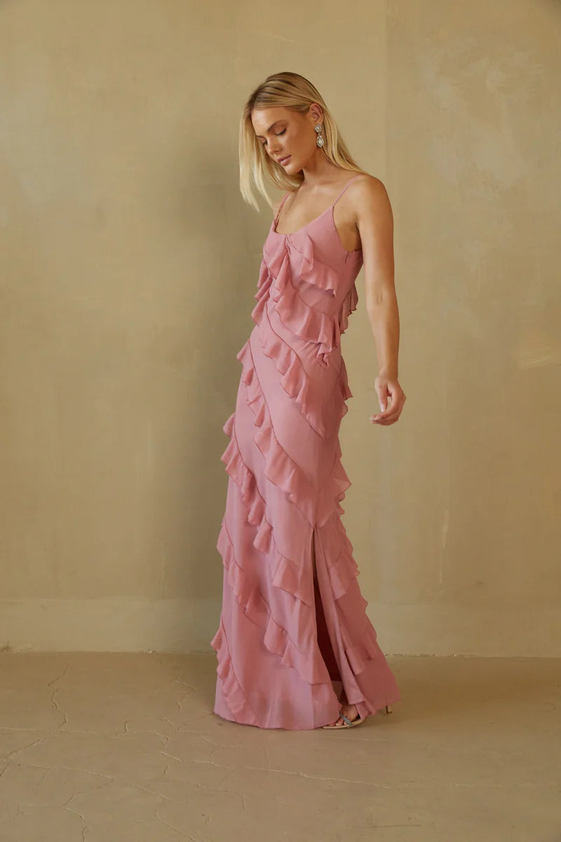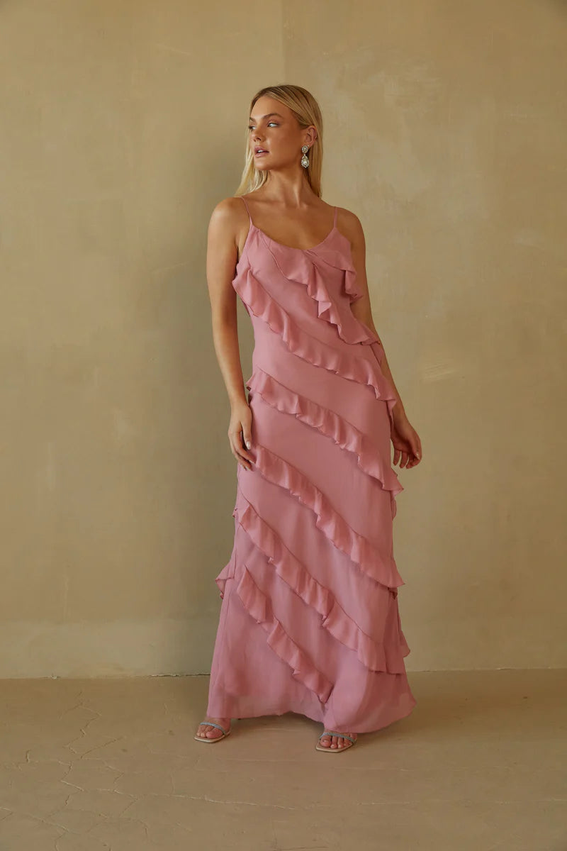 Embrace your femininity in the Elizabeth Tiered Ruffle Maxi Dress! This stunning dress features a V-neckline, asymmetrical tiered ruffles, adjustable spaghetti straps, and a side leg slit. Available in white, blue, and dusty rose. Pair with a simple heel to complete the look!